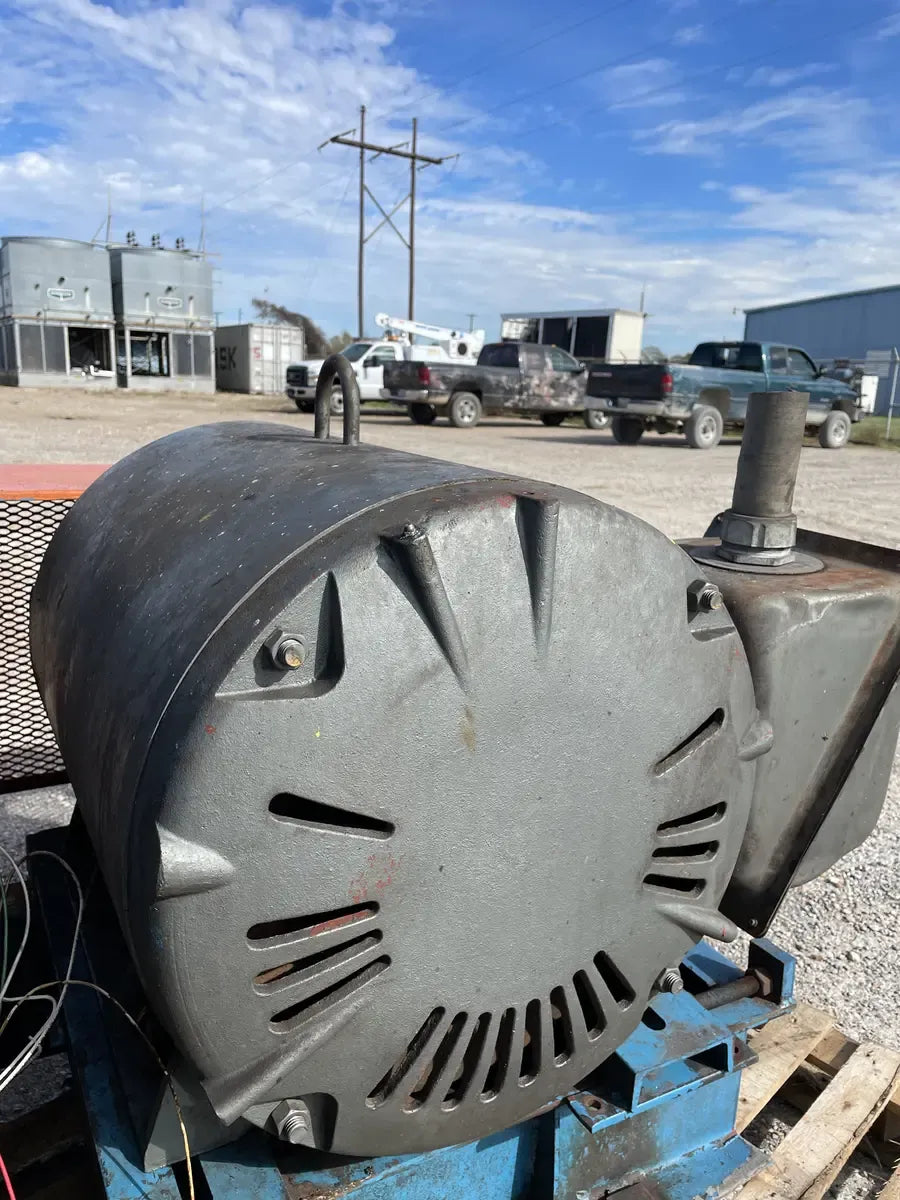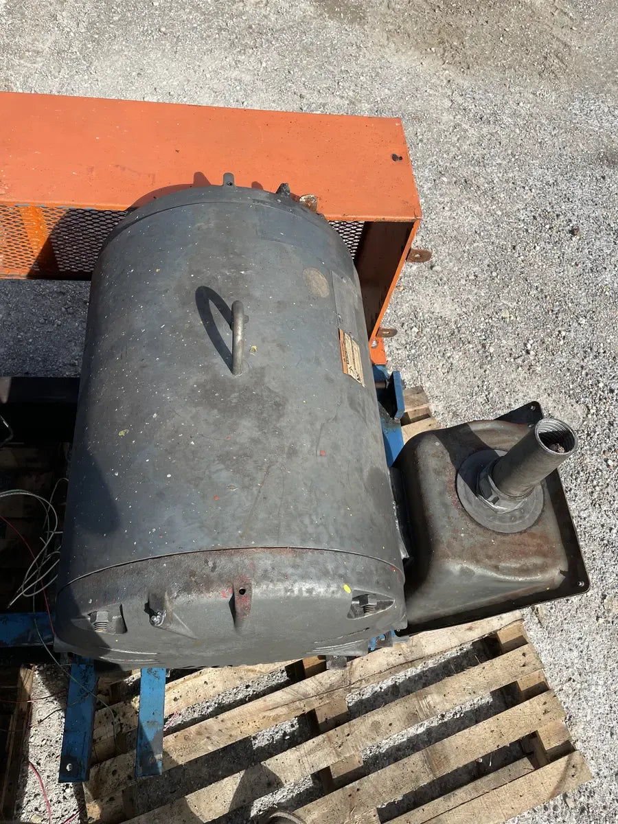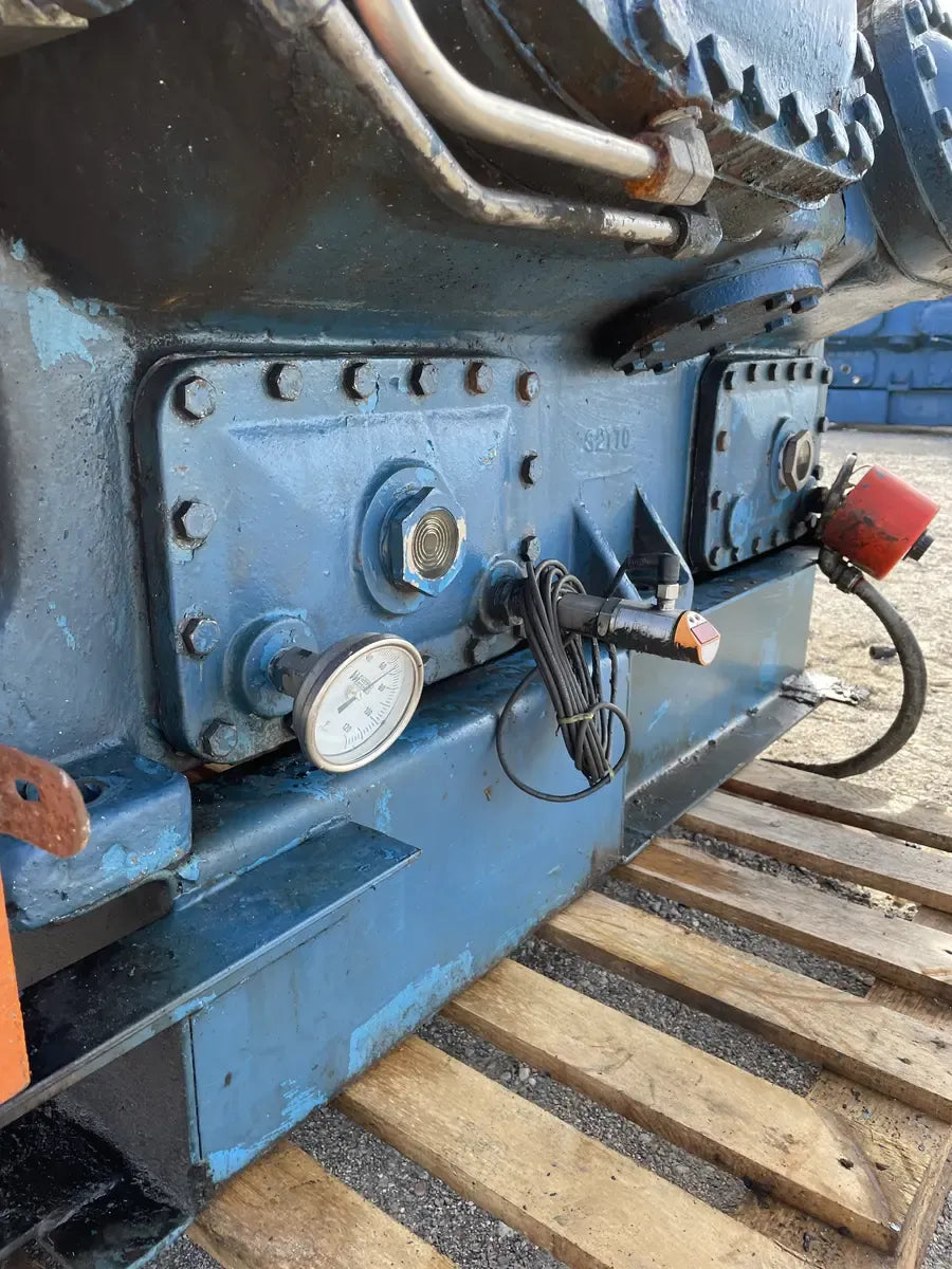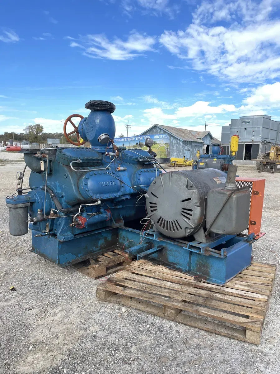 Compresor alternativo Vilter 4416 de 16 cilindros. Modelo: 4416, RPM máximas: 1200. Número de cilindros: 16. Diámetro y carrera: 114x89, Desplazamiento (CFM): 619, Conexión de succión - pulg. (mm): 6 (152), Conexión de descarga - (pulg./mm)( 2): 3, peso unitario menos motor (LBS): 5800 (2630), carga de aceite - galón (litro): 14 (53), temperatura máxima de descarga C: 300 (149), cárter de rango de temperatura C: 43-54 . Falta la placa de datos del compresor. Motor eléctrico industrial Lincoln - HP: 200, RPM: 1785, Voltios: 460, AMPS: 229, Hz: 60, SF: 60, SF AMPS: 286, NOM.Eff: 95.0/94.1, Encl: ODF, AMB: 40C, BRGS: 318/315, Modelo: SD4P200T, Servicio: CONT, PH: 3.