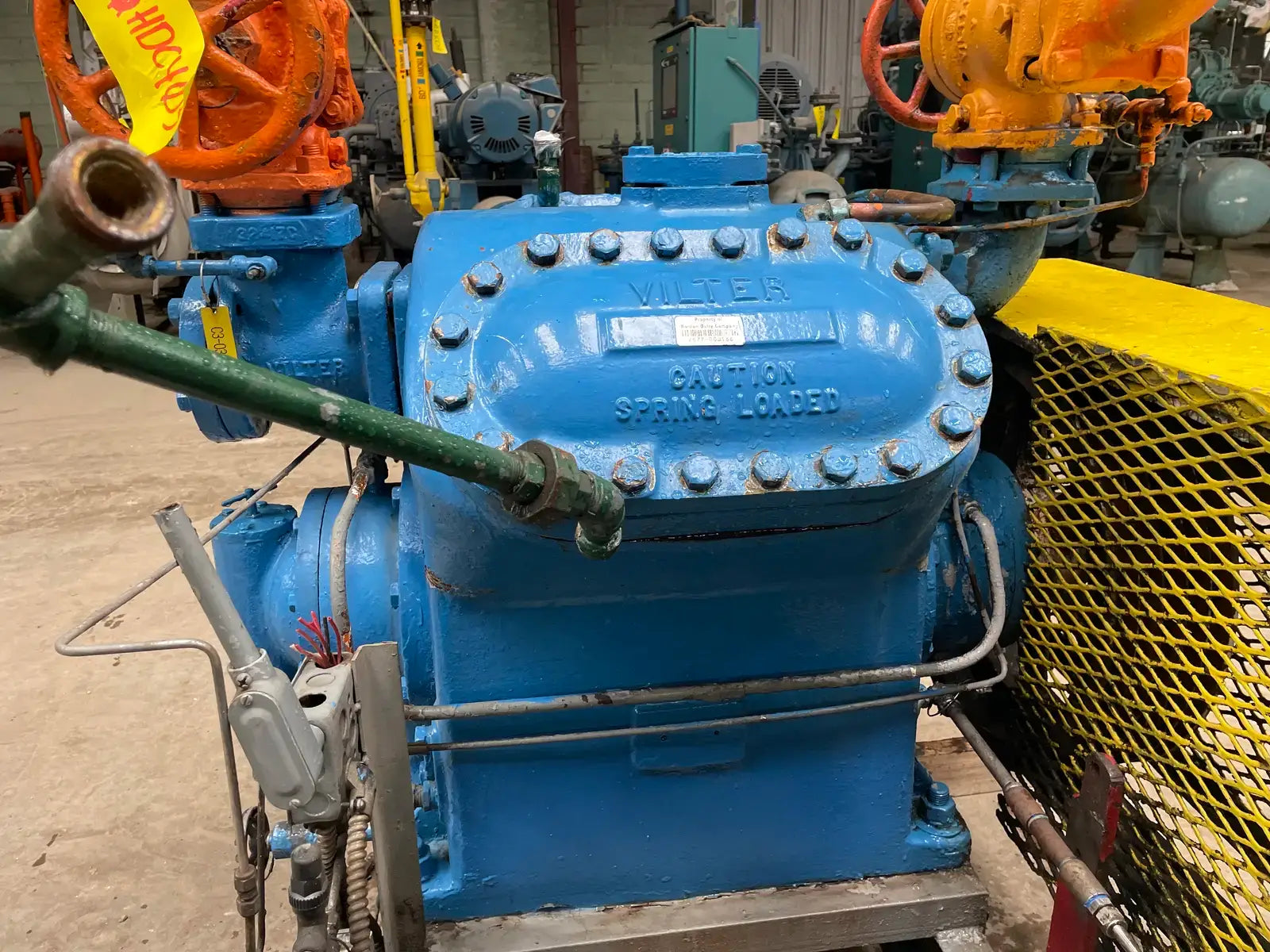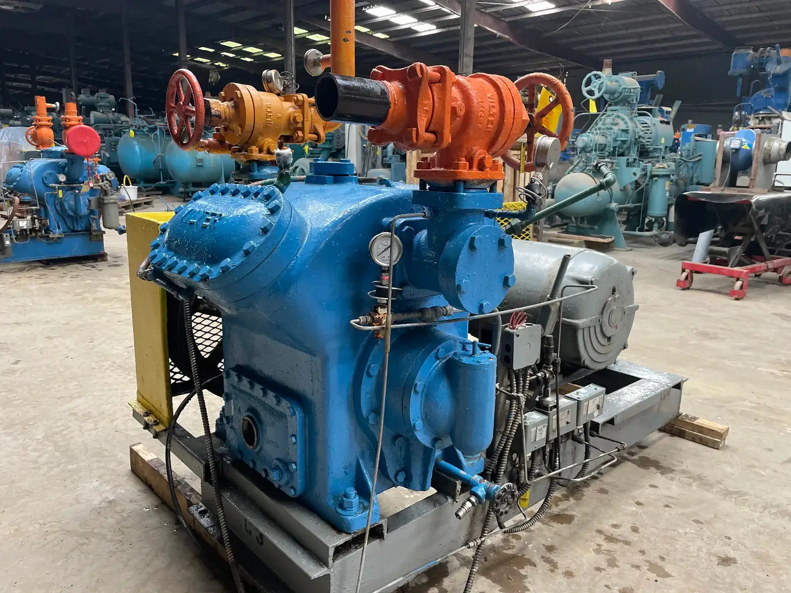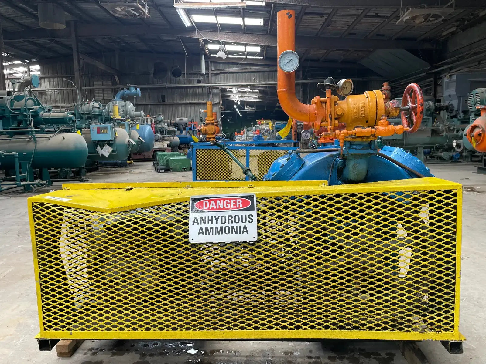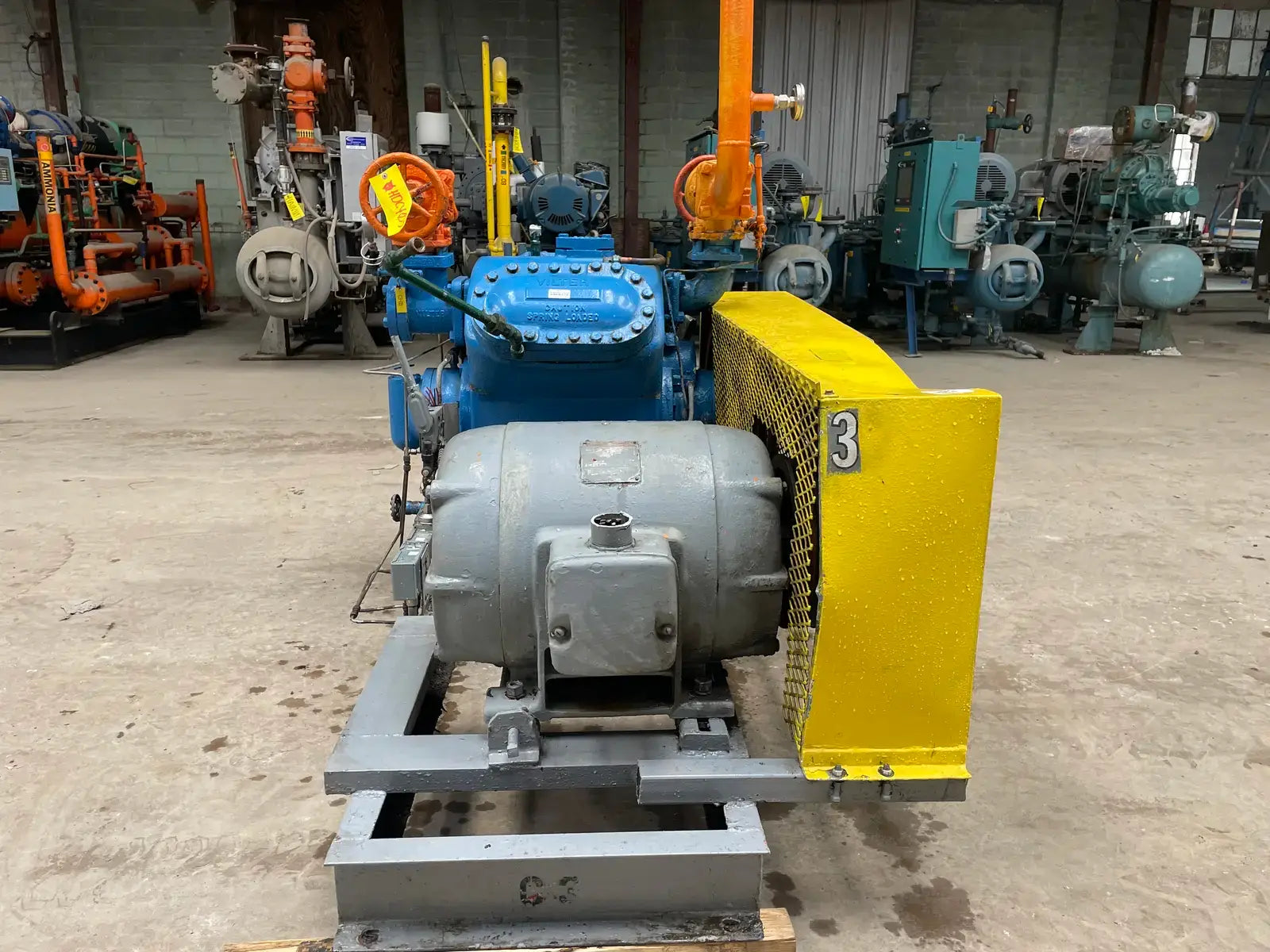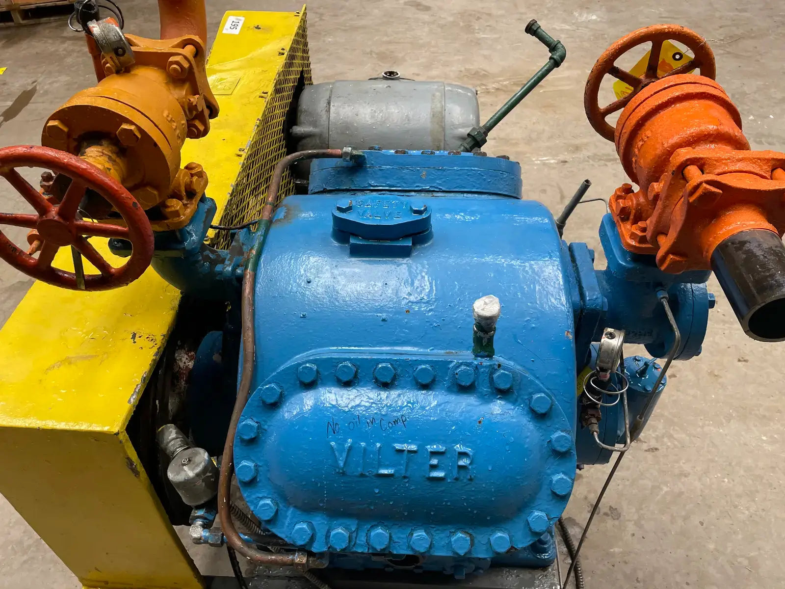 Compresor alternativo Vilter de 4 cilindros accionado por correa. Modelo: 444. Refrigerante: R-717. Desplazamiento a RPM máximas (CFM): 155. Número de cilindros: 4. Conexiones del compresor (tamaño de línea en pulgadas): Succión: 3 1/2, Descarga: 2 1/2. Motor Eléctrico: 50 HP, 240 Voltios, 1775 RPM. Separador de aceite EL Nickell Co.: Junta Nacional: 7950. Número de serie: C-3491. Utilizado anteriormente en una instalación de refrigeración de Borden Dairy.