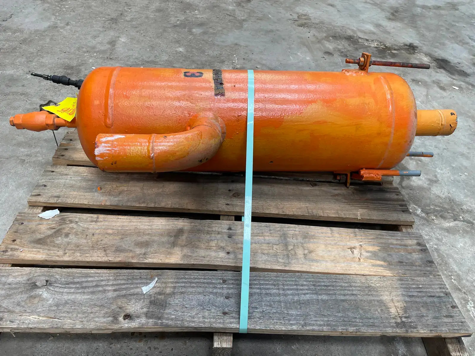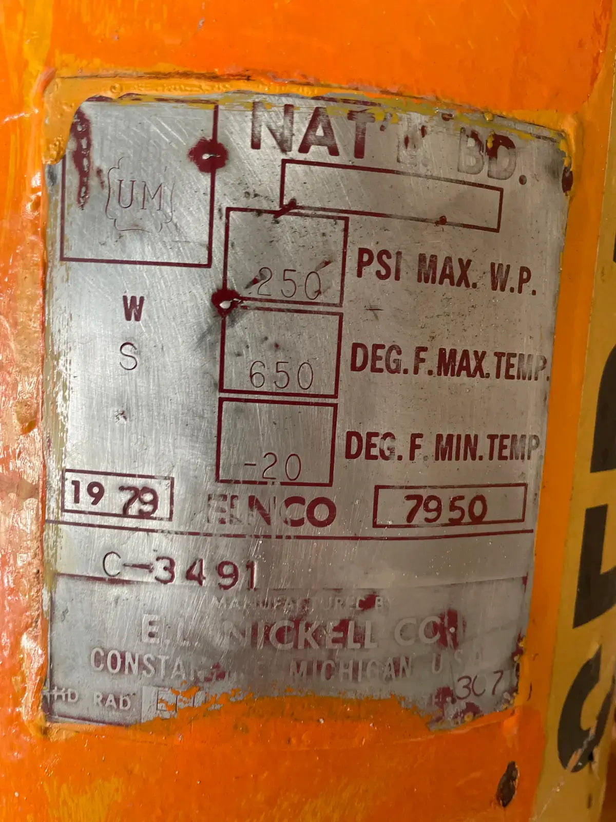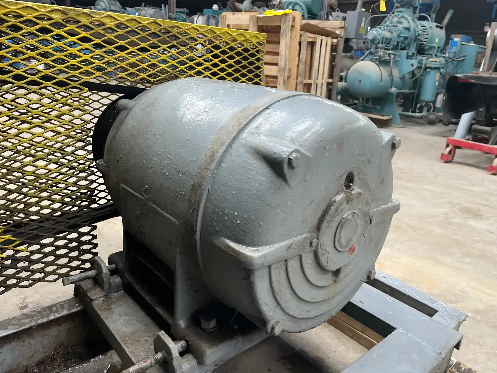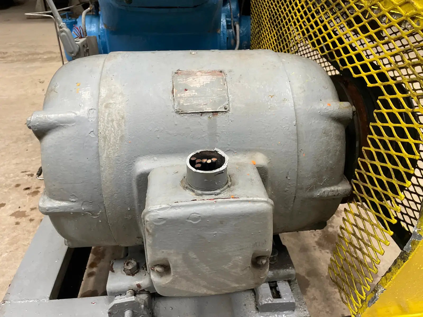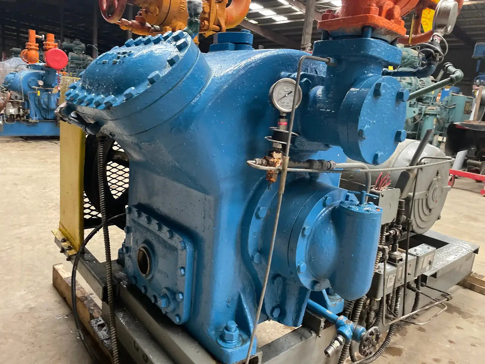Compresor alternativo Vilter de 4 cilindros accionado por correa. Modelo: 444. Refrigerante: R-717. Desplazamiento a RPM máximas (CFM): 155. Número de cilindros: 4. Conexiones del compresor (tamaño de línea en pulgadas): Succión: 3 1/2, Descarga: 2 1/2. Motor Eléctrico: 50 HP, 240 Voltios, 1775 RPM. Separador de aceite EL Nickell Co.: Junta Nacional: 7950. Número de serie: C-3491. Utilizado anteriormente en una instalación de refrigeración de Borden Dairy.