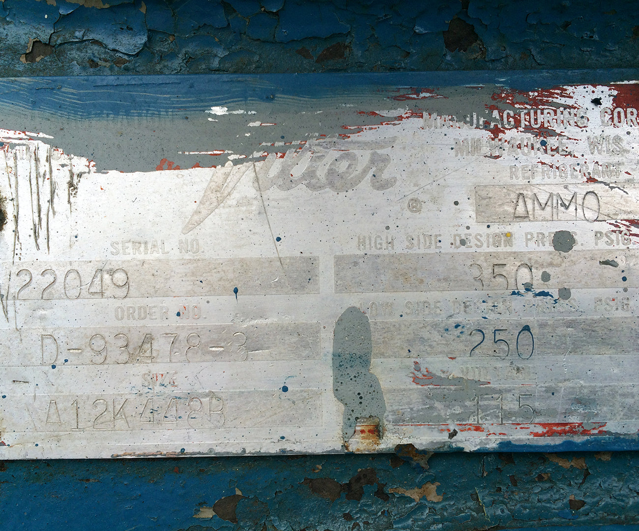 Compresor alternativo Vilter serie 440 usado. Modelo: 448. Serie 22049. Pedido: D-93478-3. Tamaño: A12K448B. Número de cilindros: 8. Desplazamiento: 182 CFM. Clasificaciones nominales: 94 TR a +20F / +95F (freón R-22); 93 TR a +20F / +95F (amoníaco R-717). Motor: 125 HP, 1780 RPM, 460 V, 145 amperios, trifásico, 60 Hz, estructura 405T. Peso del compresor: 3400 lbs. Puertos (succión/descarga): 4 pulg. / 3 pulg. Utilizados anteriormente con refrigerante de amoníaco.