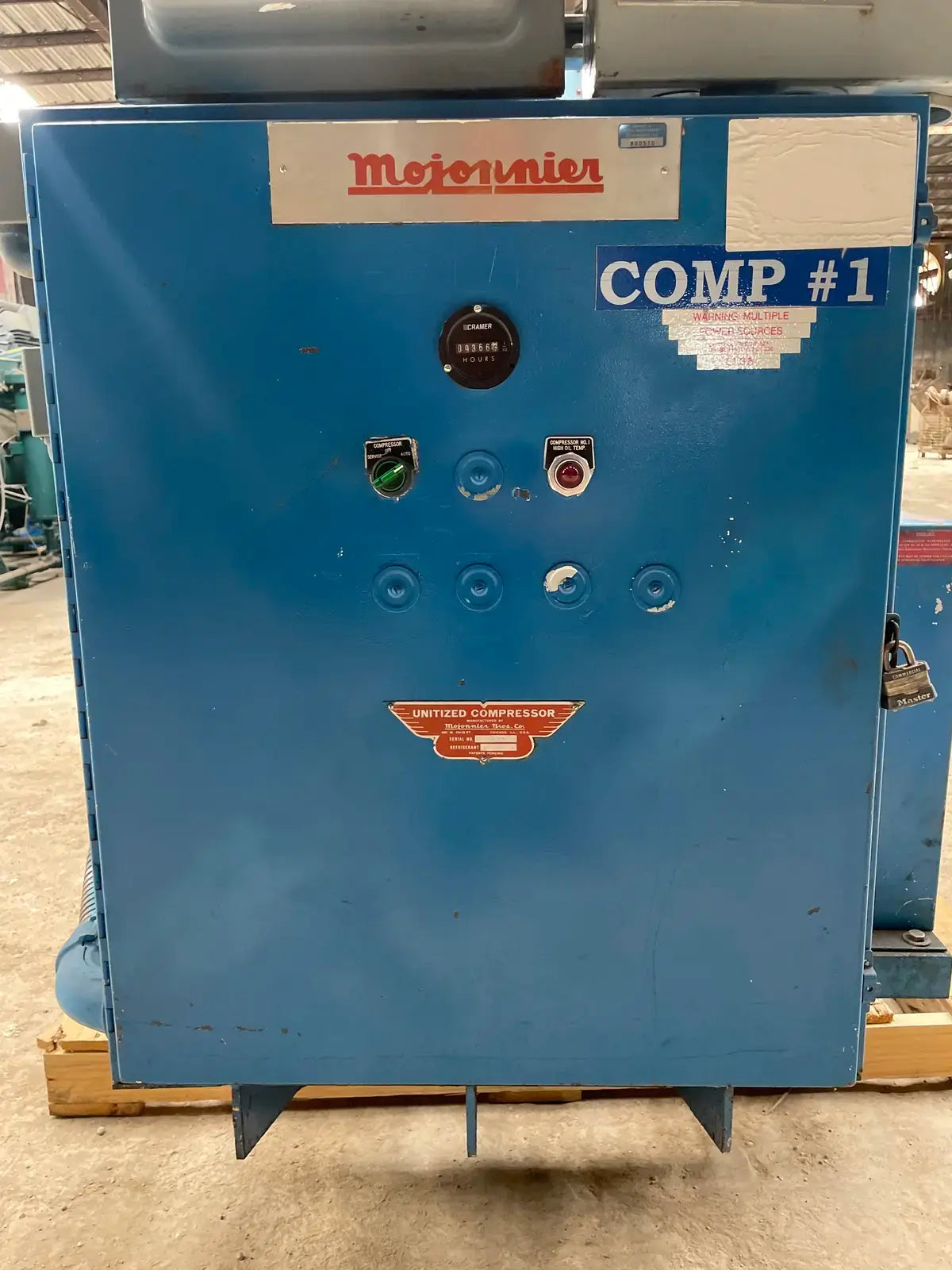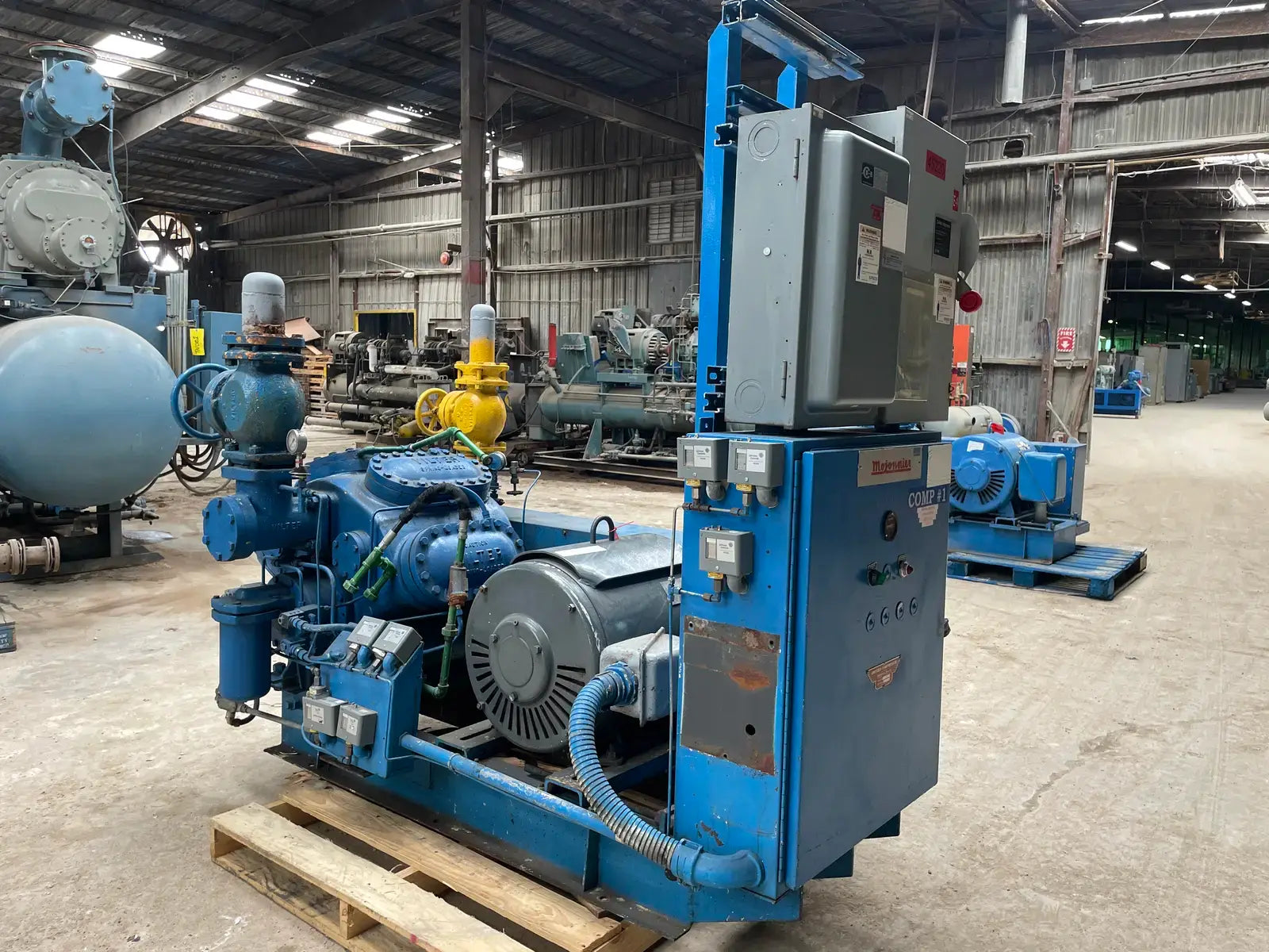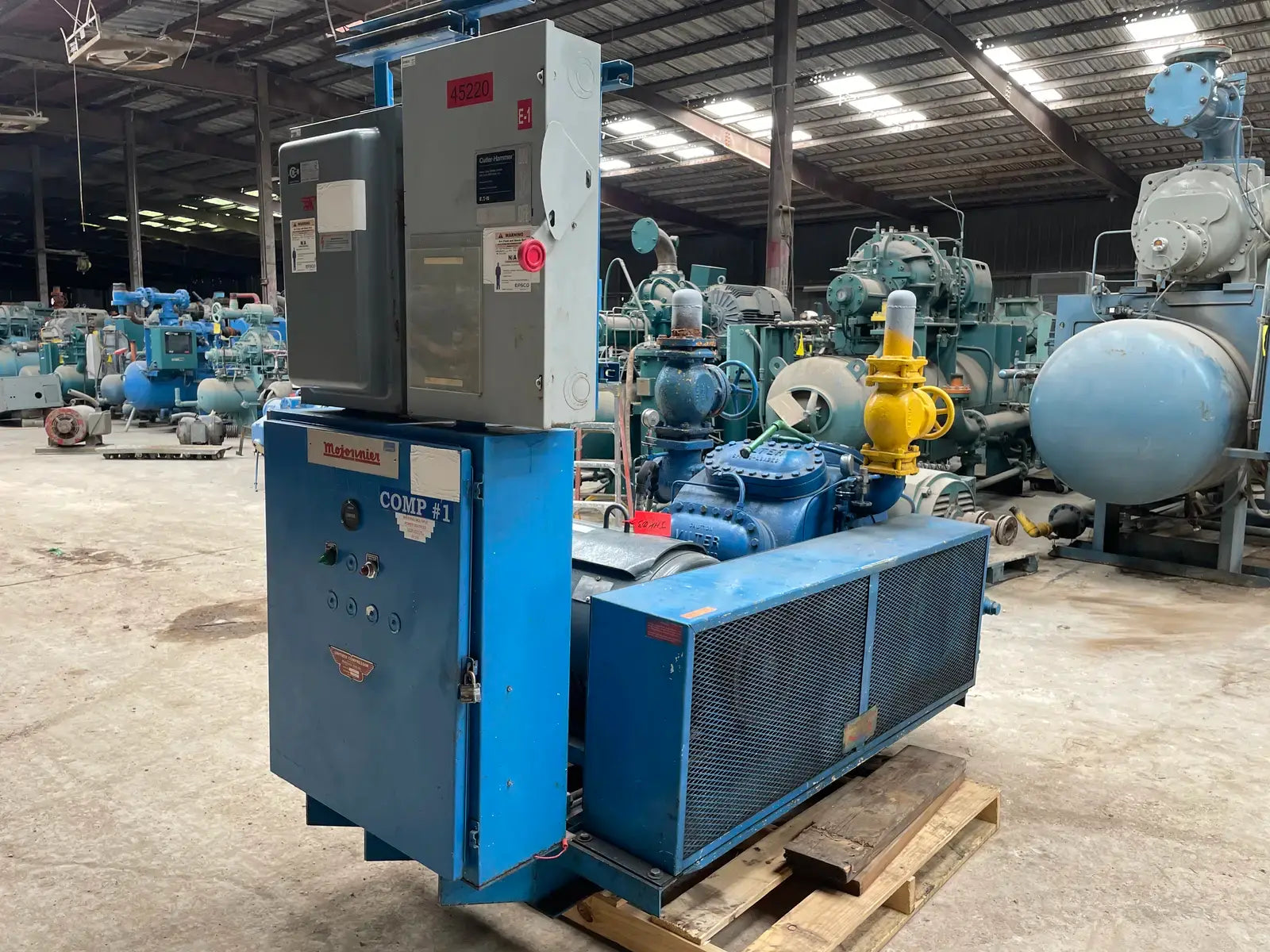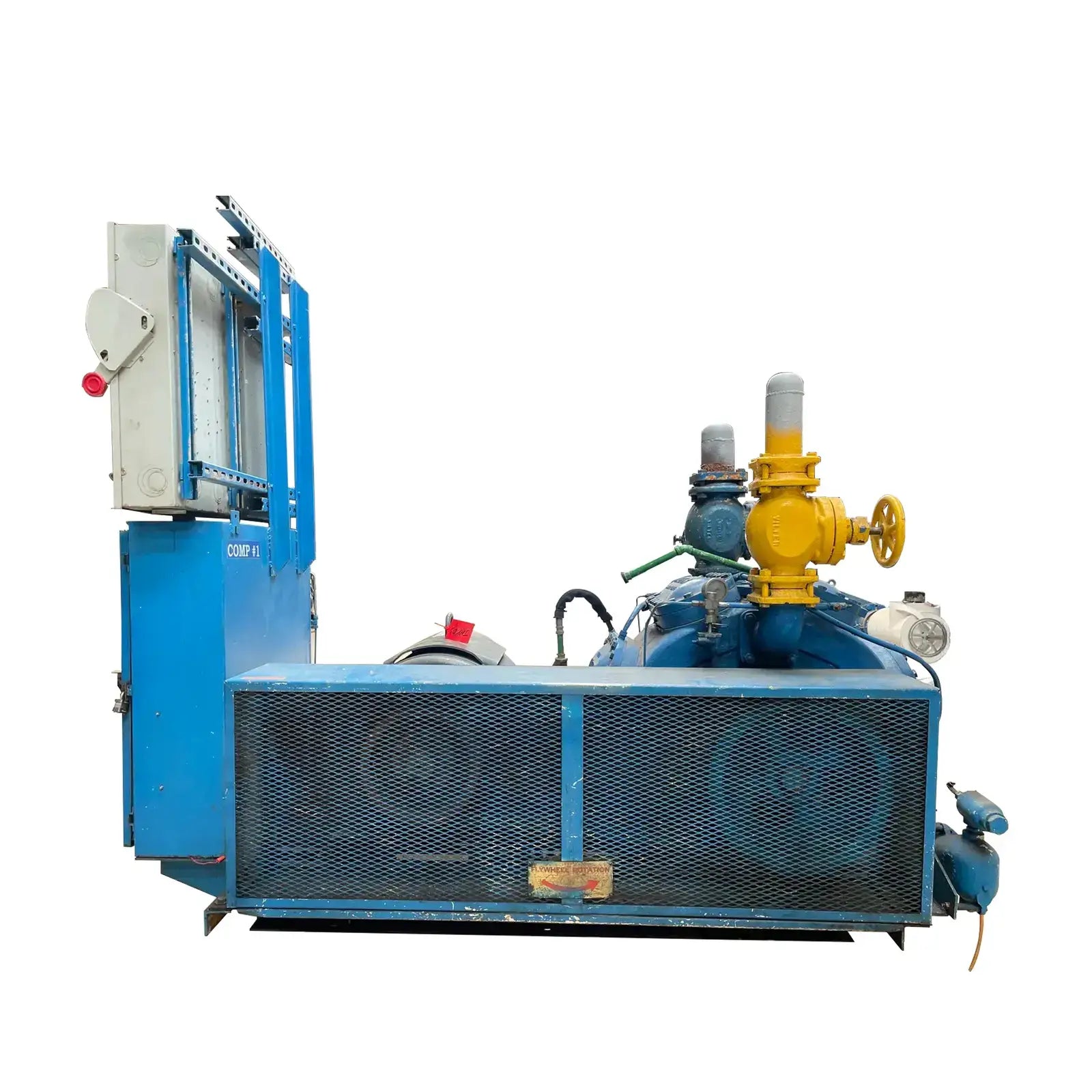 Paquete de compresor alternativo accionado por correa Vilter. Modelo: 448. Número de serie: 22340. Número de pedido: E-25661. Refrigerante anterior: Amoníaco. Prueba hidrostática del compresor (PSIG) - Lado alto: 525. Lado bajo: 375. Voltaje: 115 V. Número de cilindros: 8. RPM máximas: 1200. Conexiones del compresor - Succión: 4 pulg. Descarga: 3 pulg. Motor eléctrico Lincoln - HP: 125, Voltios: 460, Hz: 60, RPM: 1770, Ph: 3. Amperios: 144. Arrancador de motor Mojonnier Bros Co.