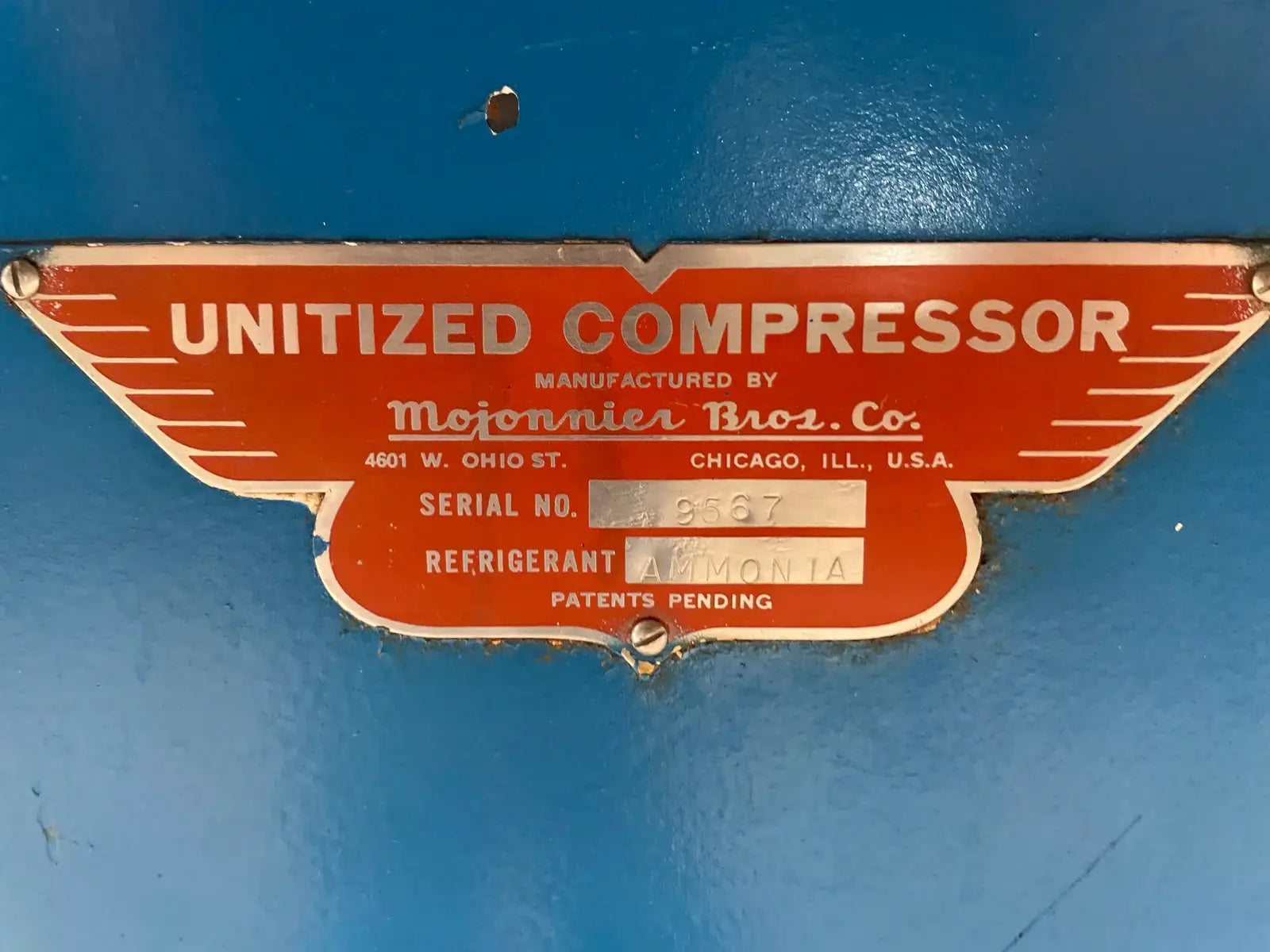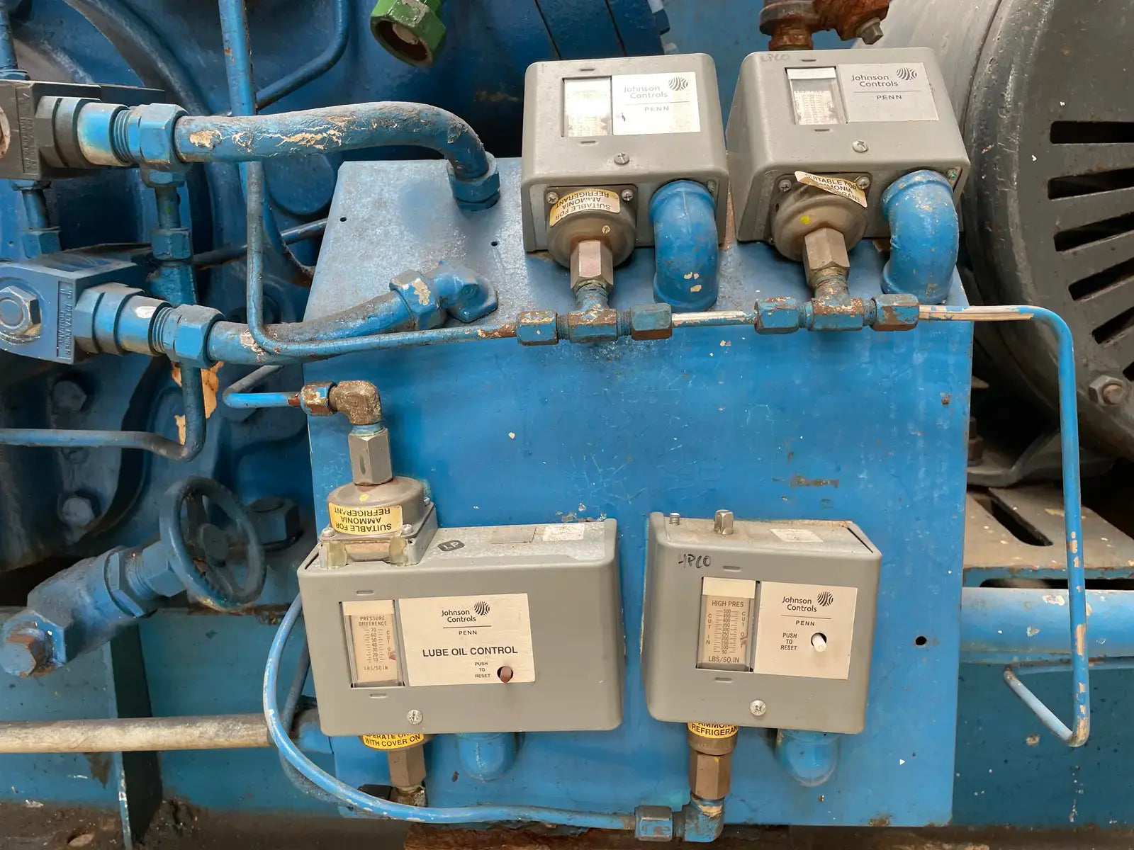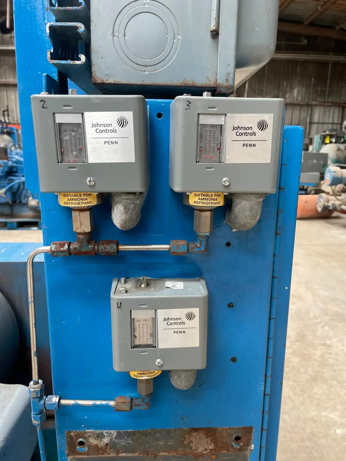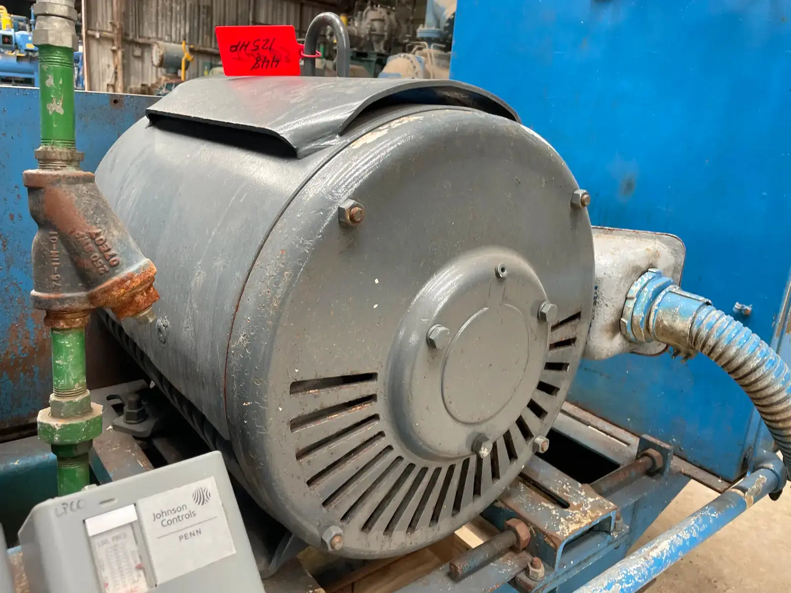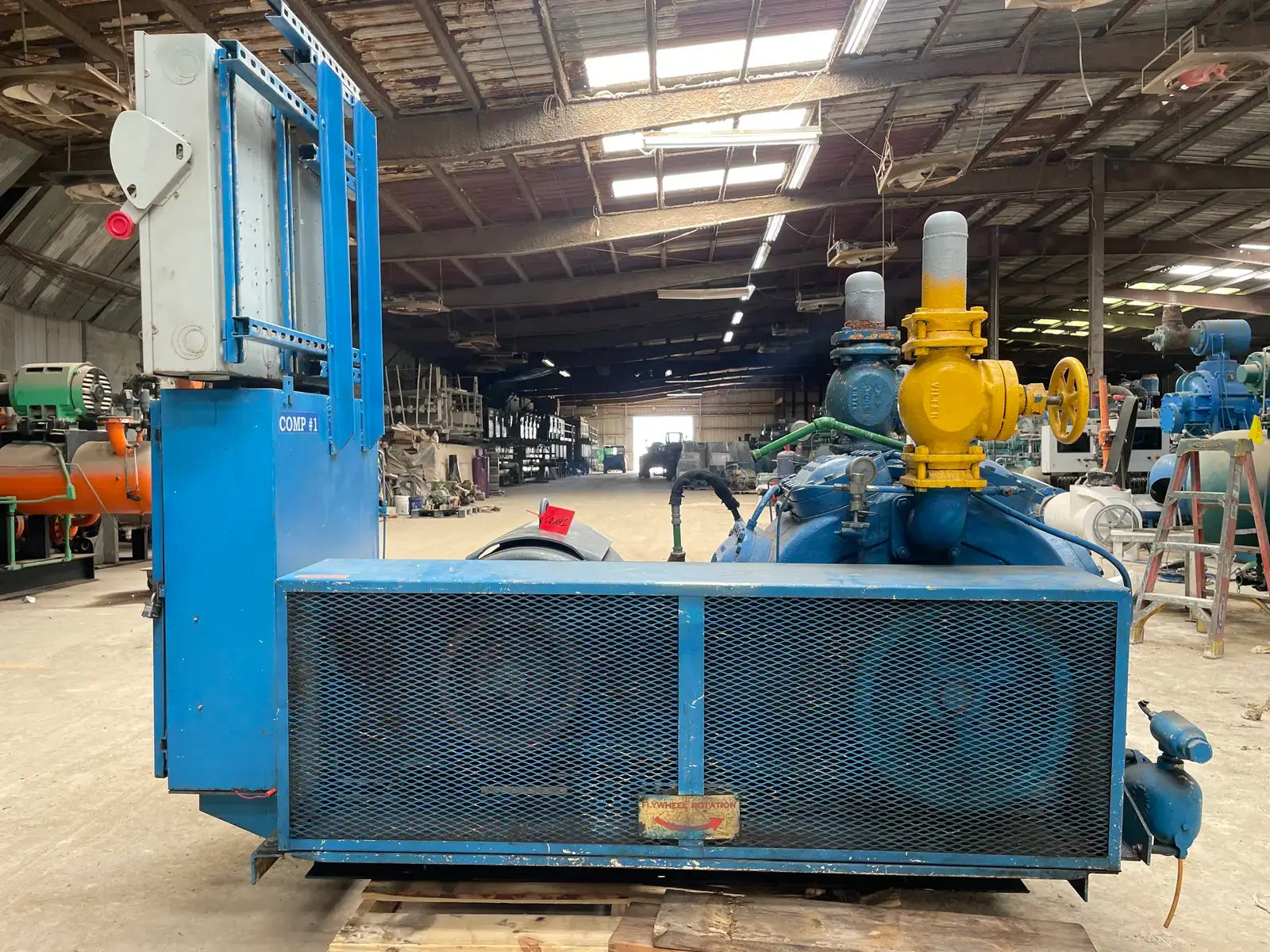 Paquete de compresor alternativo accionado por correa Vilter. Modelo: 448. Número de serie: 22340. Número de pedido: E-25661. Refrigerante anterior: Amoníaco. Prueba hidrostática del compresor (PSIG) - Lado alto: 525. Lado bajo: 375. Voltaje: 115 V. Número de cilindros: 8. RPM máximas: 1200. Conexiones del compresor - Succión: 4 pulg. Descarga: 3 pulg. Motor eléctrico Lincoln - HP: 125, Voltios: 460, Hz: 60, RPM: 1770, Ph: 3. Amperios: 144. Arrancador de motor Mojonnier Bros Co.