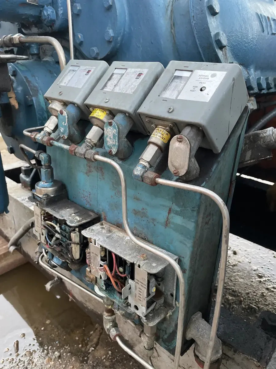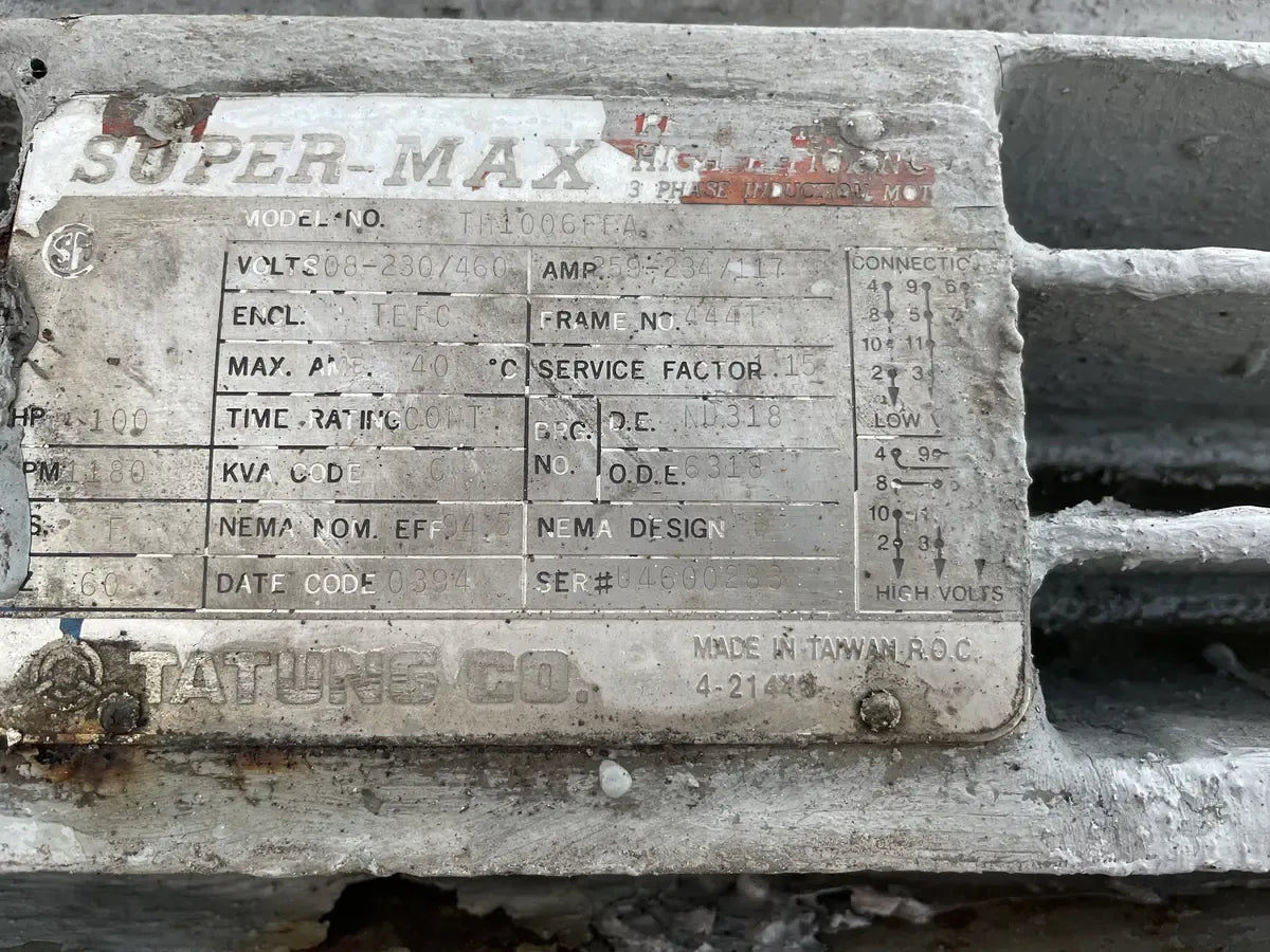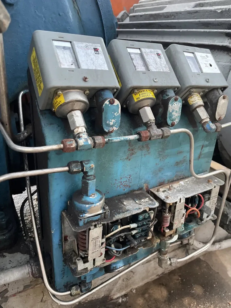 2003 Compresor alternativo Vilter 448 de 8 cilindros. Cantidad de cilindros del compresor: 8, desplazamiento a RPM máximas (CFM): 209, RPM máximas 1200. Los datos proporcionados sobre el compresor se obtuvieron de un manual de Vilter y de Prodalim Group, donde se compró la unidad. Falta la placa de datos del compresor. Motor de inducción de alta eficiencia Super Max: N.º de modelo: TH1006FFA, Voltios: 208-230/460, AMP: 259-234/117, Encl: TEFC, N.º de bastidor: 444T, AMB máximo: 40 C, Factor de servicio: 1,15, HP: 100, RPM: 1180, Hz: 60, Número de serie: 04600283, Código de fecha: 0394.
