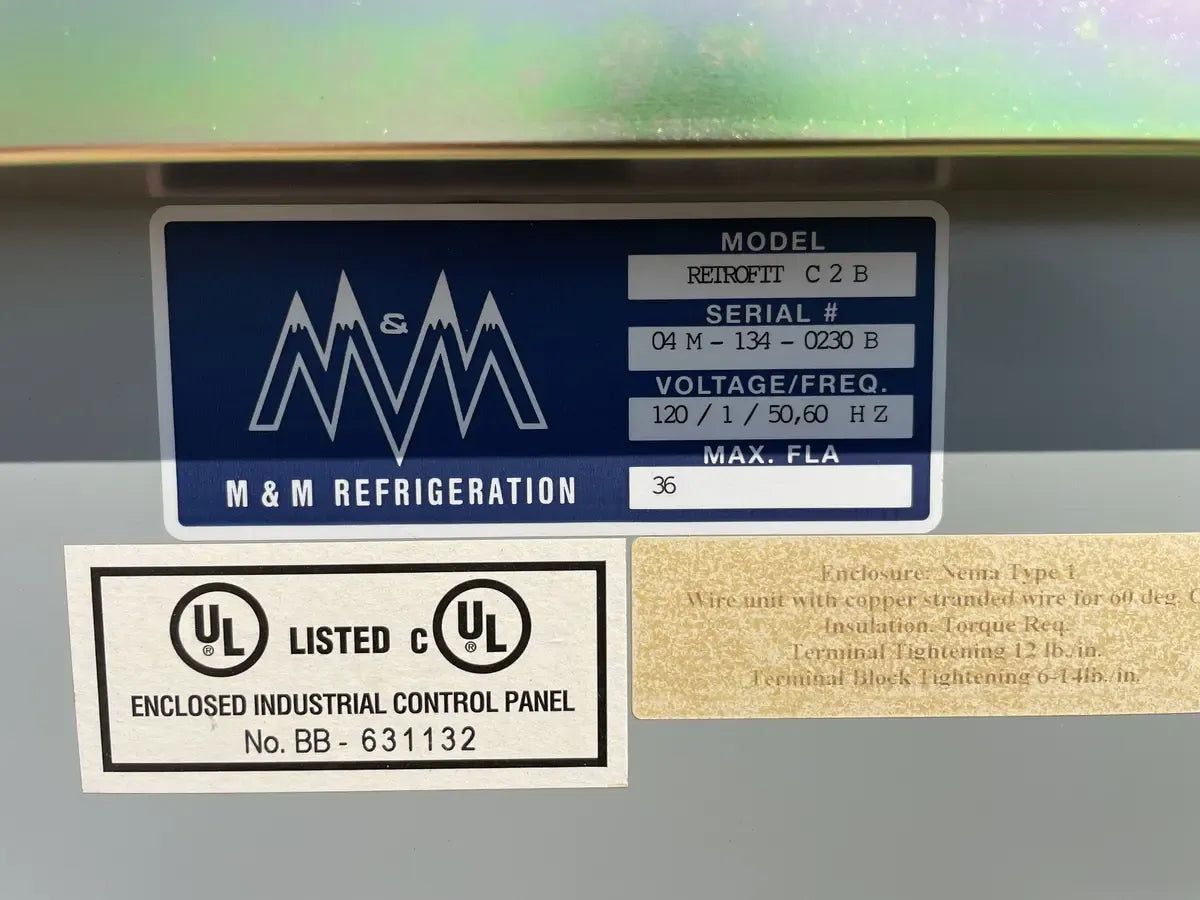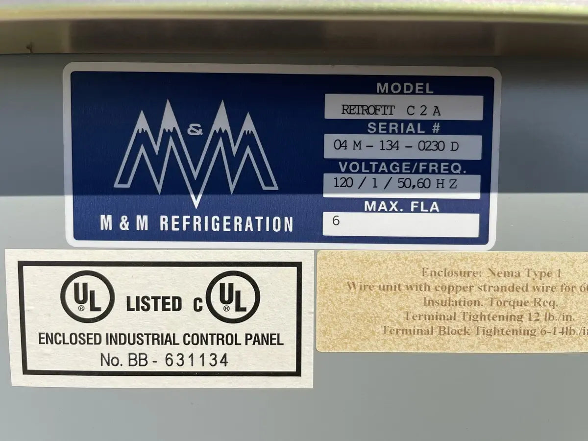 - Descripción del micropanel de control: (2) M&M Refrigeration(1): Model: Retrofit C2A, Serial: 04M-134-0230D, Voltage/Freq: 120/1/50,60 Hz, Max.FLA: 6. (2): Model: Retrofit C2B, Serial No: 04M-134-0230B, Voltage/Freq: 120/1/50,60 Hz, Max FLA: 36