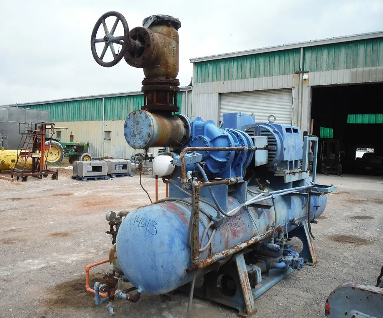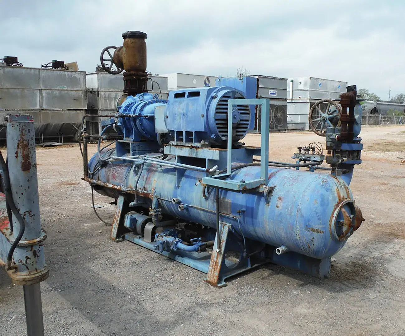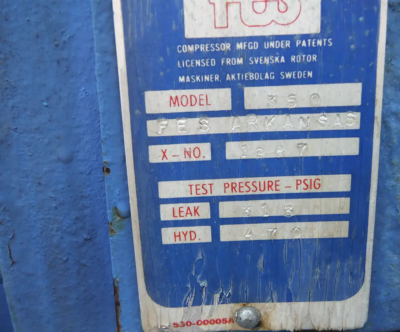 Compresor de tornillo rotativo FES Dunham-Bush. FES modelo 350, año 1987, presión de prueba: 313 PSIG de fuga / 470 Hyd. PSIG. Enfriador de aceite RECO: Nat'l Bd. 7476. Shell DWP: 350 PSIG a 300 F, prueba de 525 PSIG, MDMT: -20 F a 350 PSIG. Tubos DWP: 350 PSIG a 300 F, prueba de 525 PSIG, MDMT: -20 F a 350 PSIG. Año: 1989. S/N: M907-870-B. UG 20. Refrigeration Systems Co. San Antonio, Texas, EE. UU. Motor Toshiba de alta eficiencia: 500 HP, 3570 RPM, 460 V, 560 amperios, 60 Hz, trifásico. Toshiba Int'l Corp. Houston, Texas, EE.UU. Bomba de aceite FES: 290-000030-000, S/N: 11725870, York, PA EE. UU. Dimensiones totales: 167 pulgadas de largo x 65 pulgadas de ancho x 112 de alto.