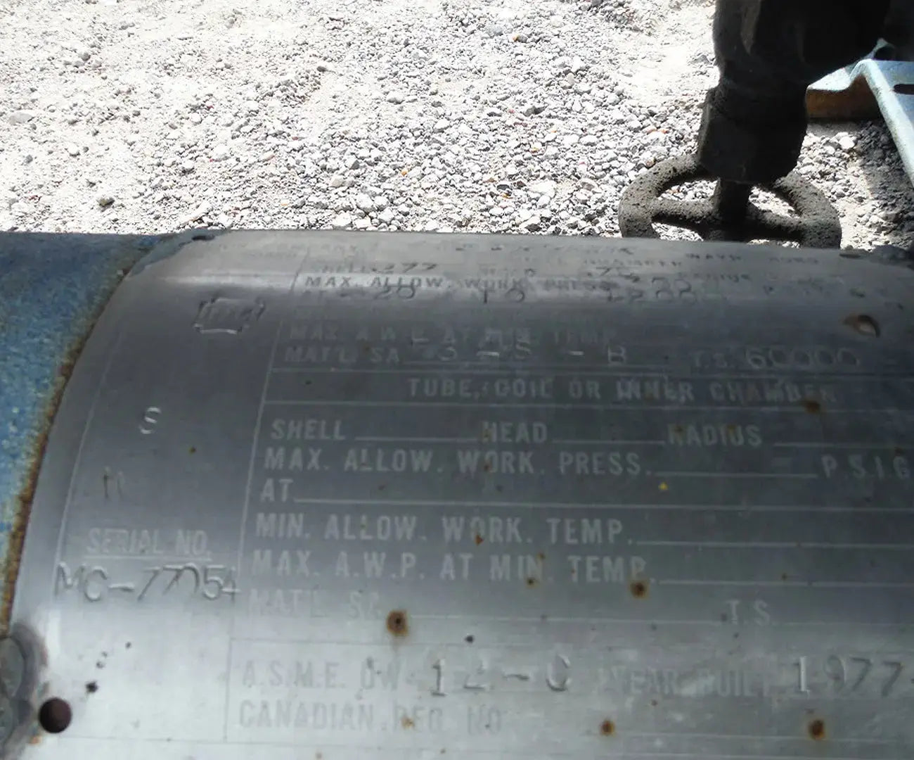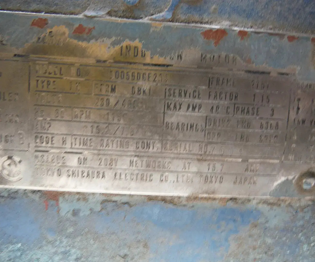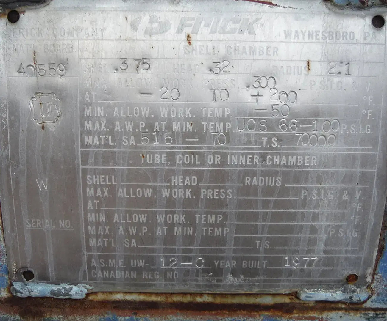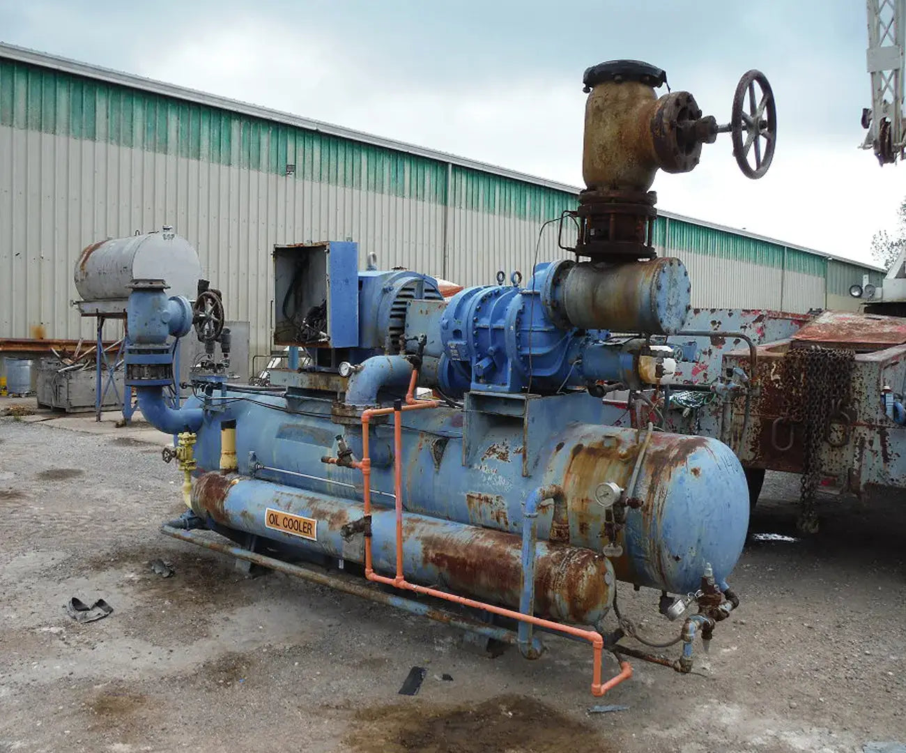 Compresor de tornillo rotativo FES Dunham-Bush. FES modelo 350, año 1987, presión de prueba: 313 PSIG de fuga / 470 Hyd. PSIG. Enfriador de aceite RECO: Nat'l Bd. 7476. Shell DWP: 350 PSIG a 300 F, prueba de 525 PSIG, MDMT: -20 F a 350 PSIG. Tubos DWP: 350 PSIG a 300 F, prueba de 525 PSIG, MDMT: -20 F a 350 PSIG. Año: 1989. S/N: M907-870-B. UG 20. Refrigeration Systems Co. San Antonio, Texas, EE. UU. Motor Toshiba de alta eficiencia: 500 HP, 3570 RPM, 460 V, 560 amperios, 60 Hz, trifásico. Toshiba Int'l Corp. Houston, Texas, EE.UU. Bomba de aceite FES: 290-000030-000, S/N: 11725870, York, PA EE. UU. Dimensiones totales: 167 pulgadas de largo x 65 pulgadas de ancho x 112 de alto.