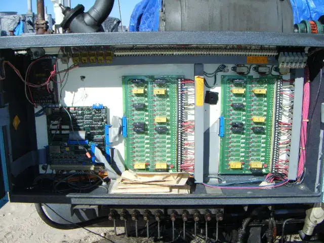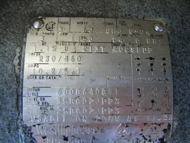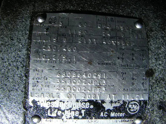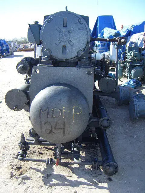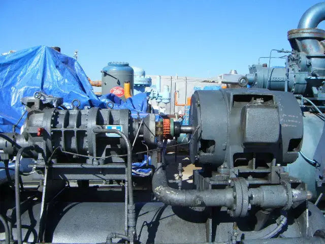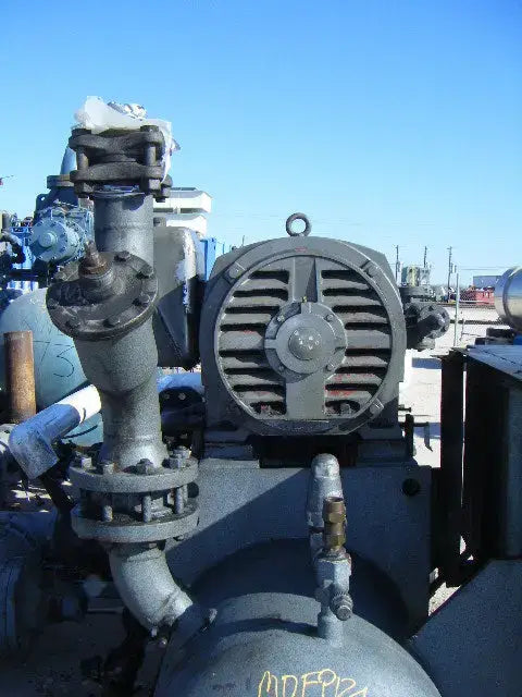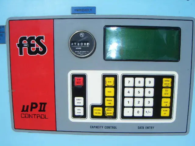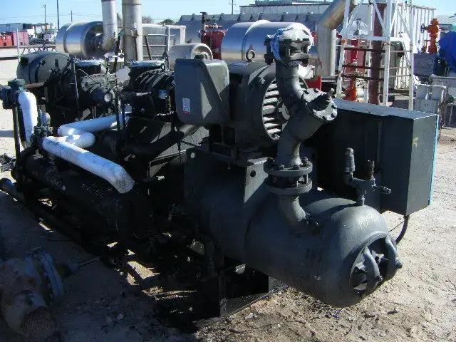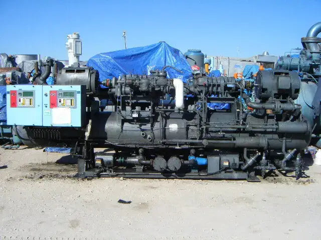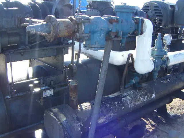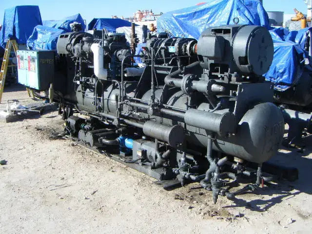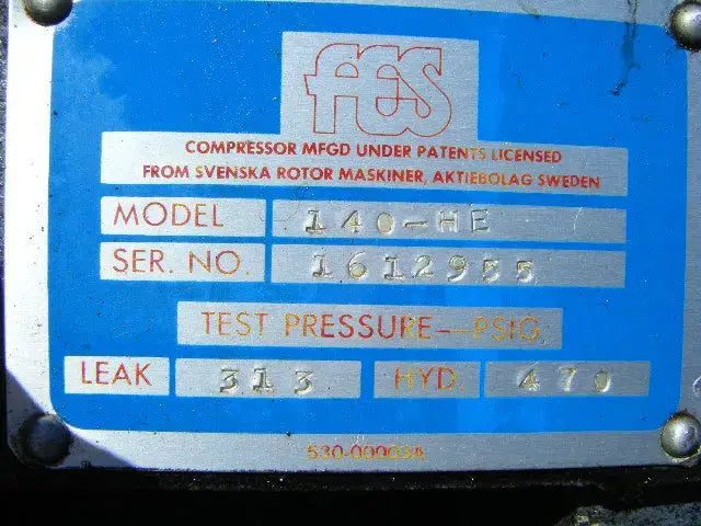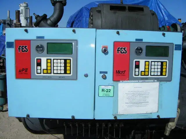 Paquete de compresor de tornillo rotativo de doble freón FES 140-140. Modelo: 140-140. Refrigerante: usado por última vez con R-22. (2) Motores eléctricos Westinghouse, 150 hp, 3550 rpm, 460 V, 169 amperios, 60 Hz, trifásicos. (2) Arrancadores de motor Westinghouse. Separador de aceite compartido FES, MAWP: 300 psi a 400 °F. Enfriador de aceite de intercambiadores de calor Acme. (2) Paneles de control FES Micro II. (2) Compresores de tornillo rotativo Mycom 160L, capacidad nominal (cada uno): 47,5 toneladas a 134,5 bhp usando R-22 con una temperatura de succión de -35 °F y una temperatura de descarga de 90 °F. Ajuste VI: 5.8. Desplazamiento: 439 cfm. Tiempo de funcionamiento del compresor n.° 1 (S/N: 162955): 41,408 h. Tiempo de funcionamiento del compresor n.° 2 (162956): 49 428 h. Dimensiones totales: 16 pies 7 pulgadas de largo x 5 pies 3 pulgadas de ancho x 6 pies 6 pulgadas de alto (H11).
