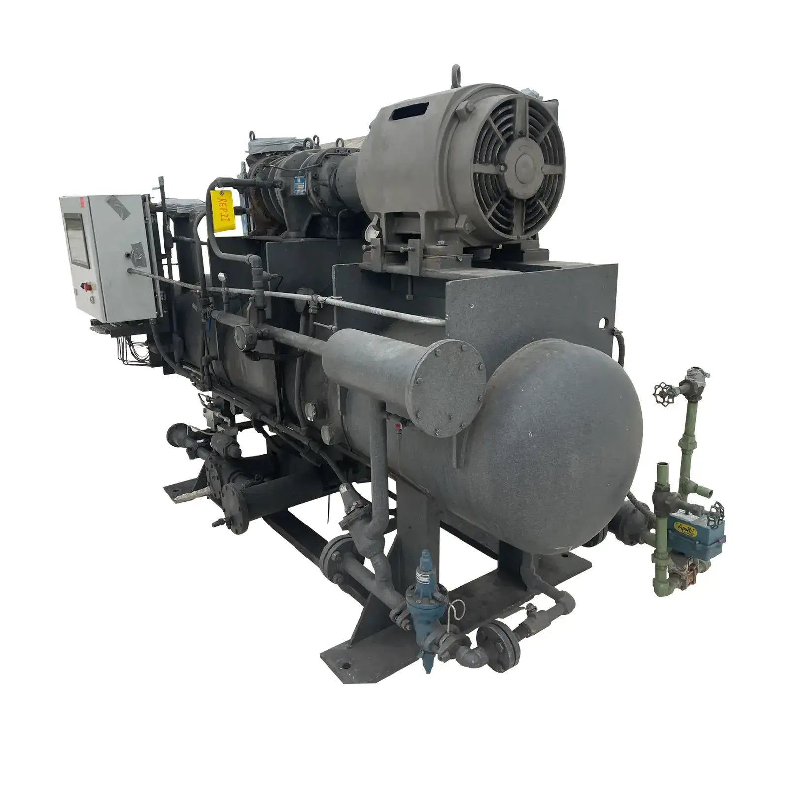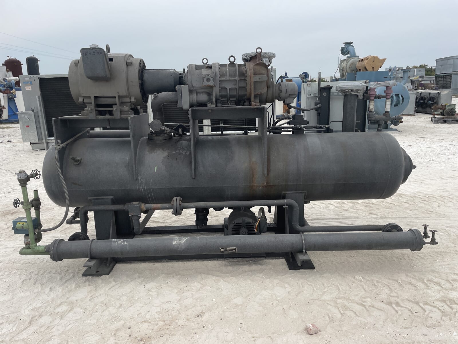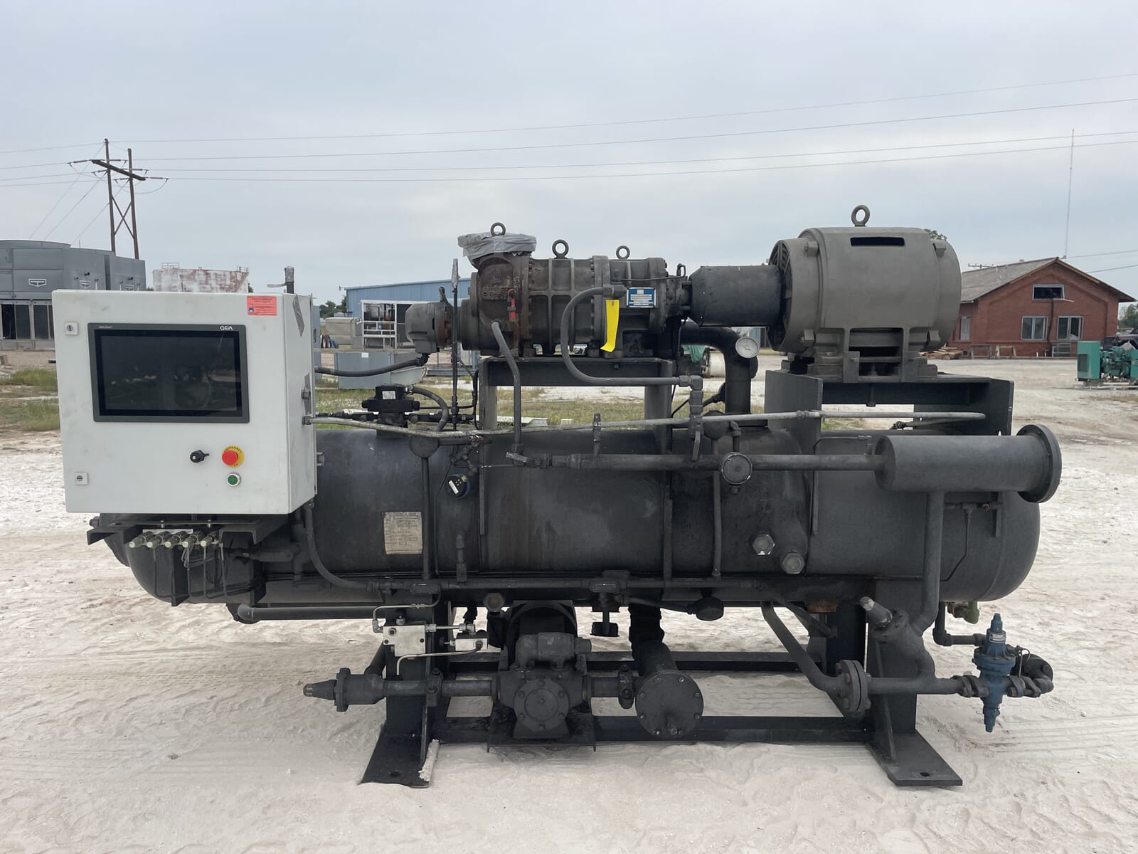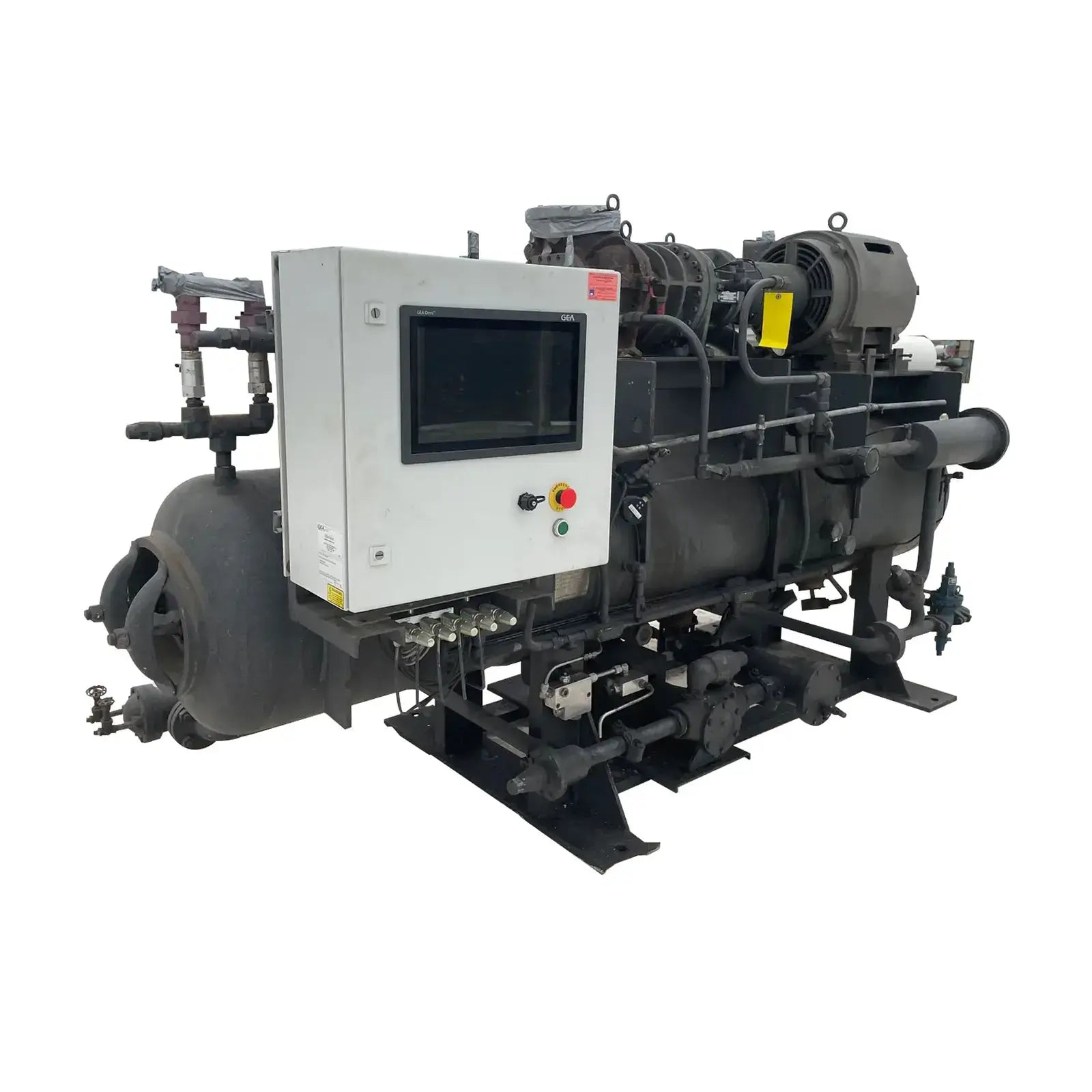 Paquete compresor de tornillo FES. Compresor de tornillo desnudo FES - Modelo: 140B-LE, Número de serie: 1613066 Presión de prueba (PSIG): Fuga: 313, HYD: 470. Refrigerante: R22. Motor de inducción trifásico de alta eficiencia Toshiba - Hp: 75, Tipo: TIKK, Voltios: 230/460, Hz: 60, RPM: 3540, Amp: 176/88, Número de serie: 9906011D. Separador de aceite FES - Junta Nacional: 3121, Número de serie: 87150, Año de construcción: 1987, Presión máxima de trabajo: 300 PSI, Temperatura máxima: 400 F. Panel de control industrial GEA Omni - Fuente de alimentación: 120 VCA, 50/60 Hz, 1 Ph, 25 amperios.