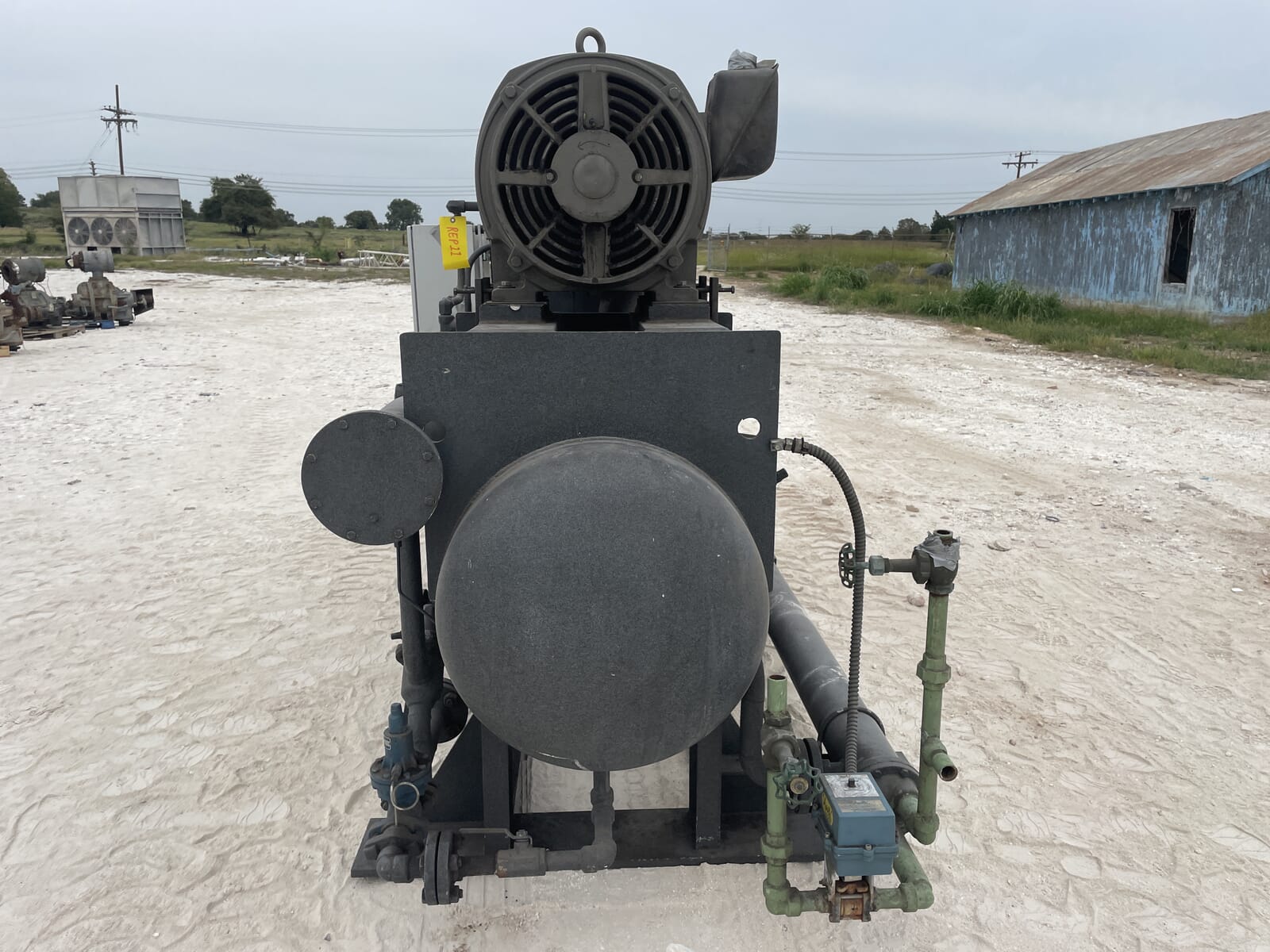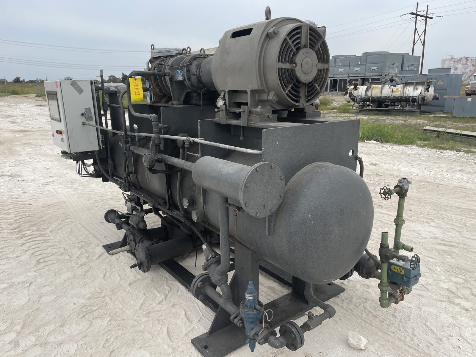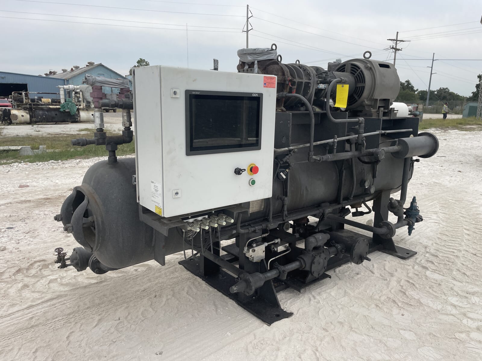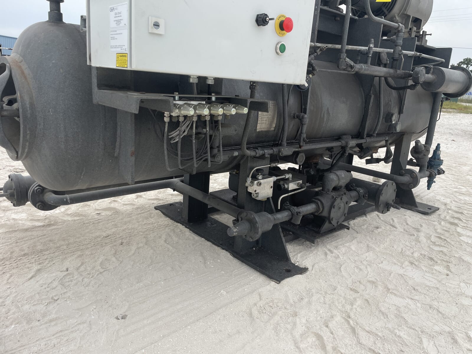 Paquete compresor de tornillo FES. Compresor de tornillo desnudo FES - Modelo: 140B-LE, Número de serie: 1613066 Presión de prueba (PSIG): Fuga: 313, HYD: 470. Refrigerante: R22. Motor de inducción trifásico de alta eficiencia Toshiba - Hp: 75, Tipo: TIKK, Voltios: 230/460, Hz: 60, RPM: 3540, Amp: 176/88, Número de serie: 9906011D. Separador de aceite FES - Junta Nacional: 3121, Número de serie: 87150, Año de construcción: 1987, Presión máxima de trabajo: 300 PSI, Temperatura máxima: 400 F. Panel de control industrial GEA Omni - Fuente de alimentación: 120 VCA, 50/60 Hz, 1 Ph, 25 amperios.