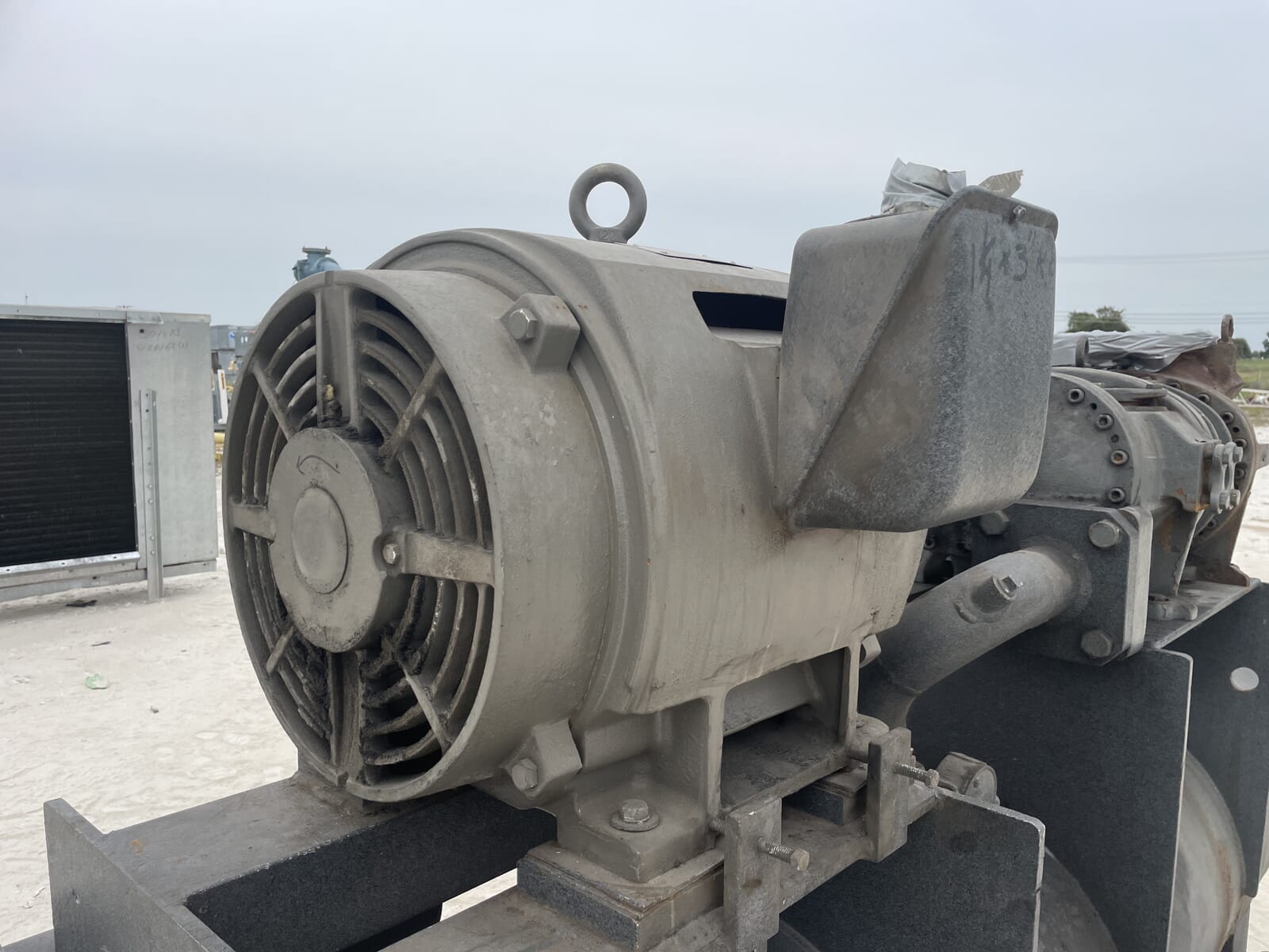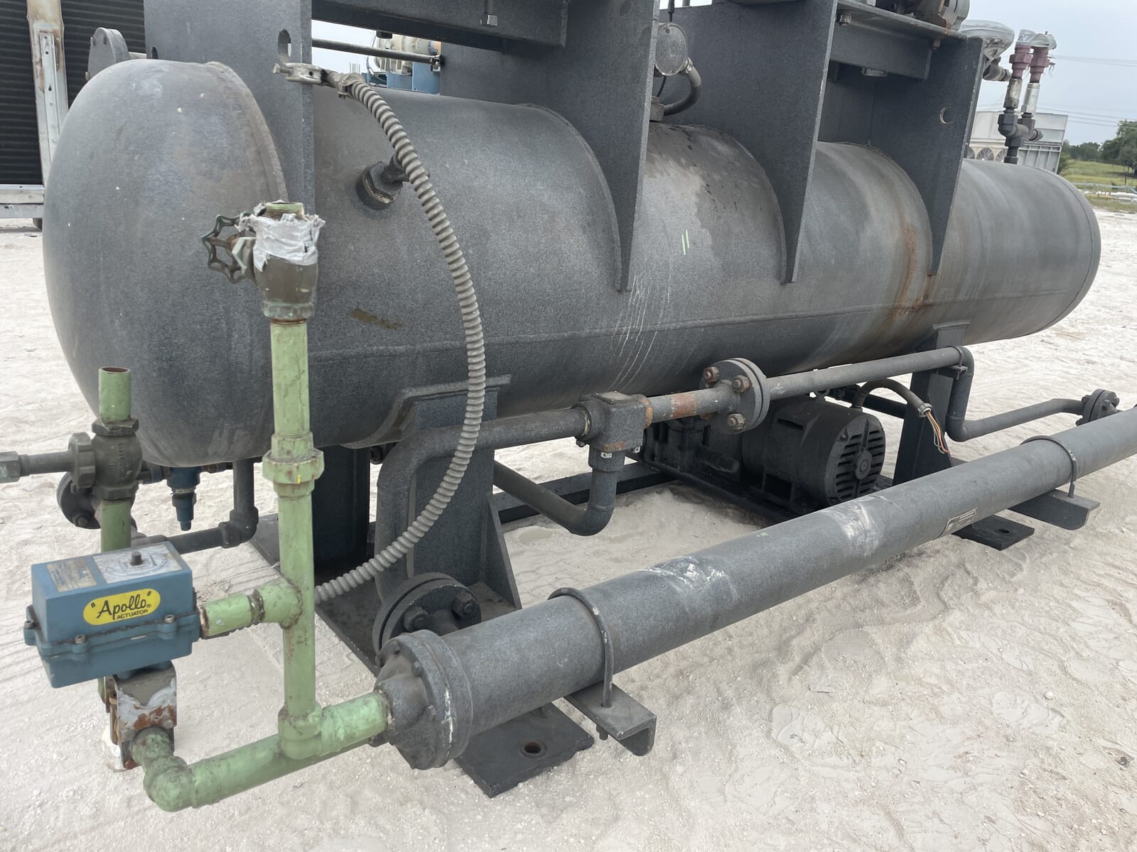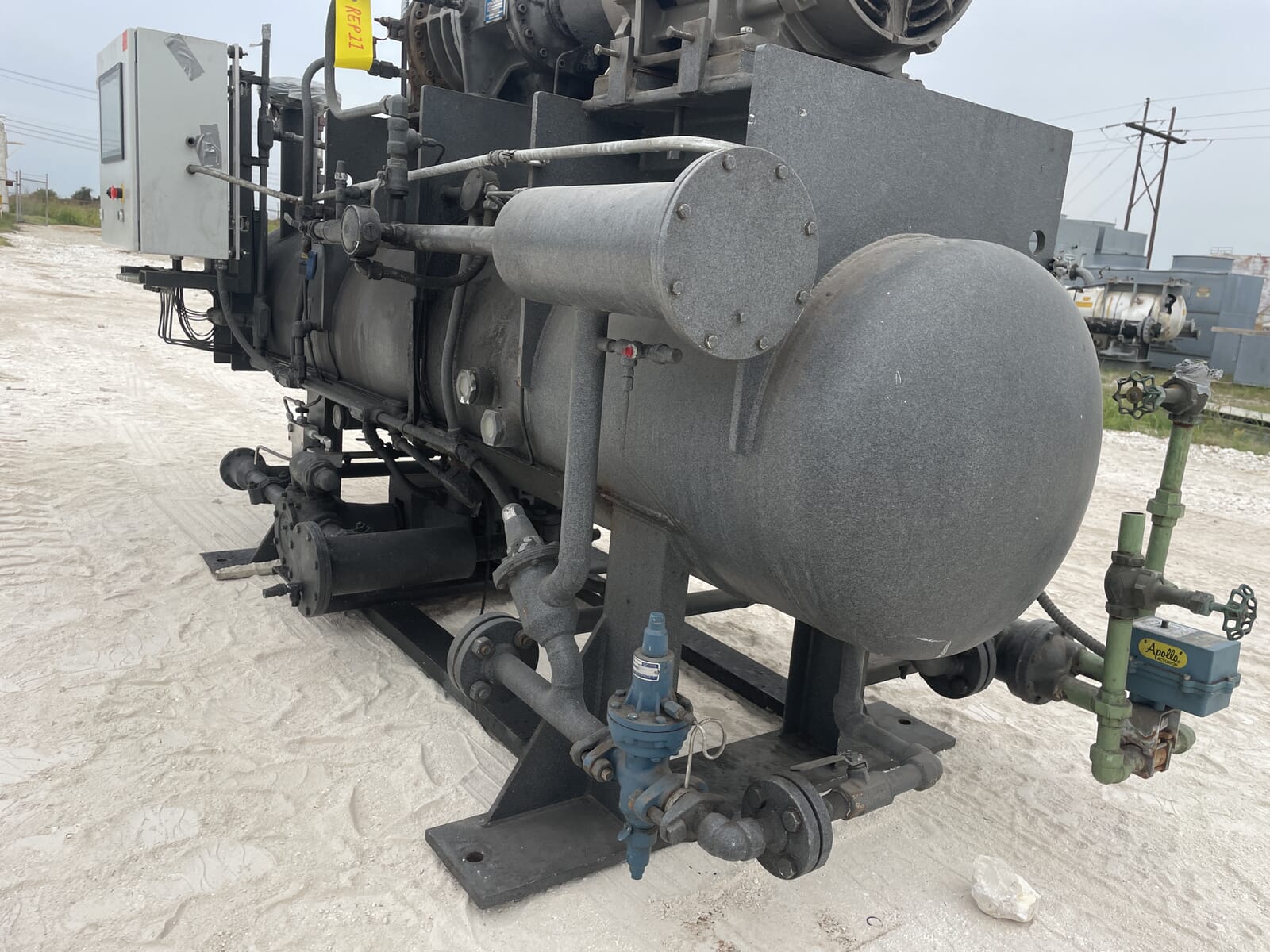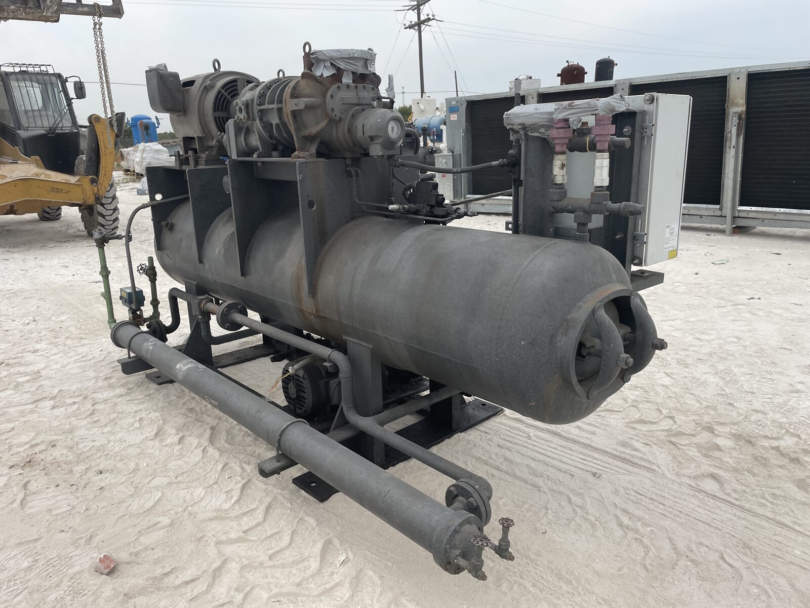 Paquete compresor de tornillo FES. Compresor de tornillo desnudo FES - Modelo: 140B-LE, Número de serie: 1613066 Presión de prueba (PSIG): Fuga: 313, HYD: 470. Refrigerante: R22. Motor de inducción trifásico de alta eficiencia Toshiba - Hp: 75, Tipo: TIKK, Voltios: 230/460, Hz: 60, RPM: 3540, Amp: 176/88, Número de serie: 9906011D. Separador de aceite FES - Junta Nacional: 3121, Número de serie: 87150, Año de construcción: 1987, Presión máxima de trabajo: 300 PSI, Temperatura máxima: 400 F. Panel de control industrial GEA Omni - Fuente de alimentación: 120 VCA, 50/60 Hz, 1 Ph, 25 amperios.