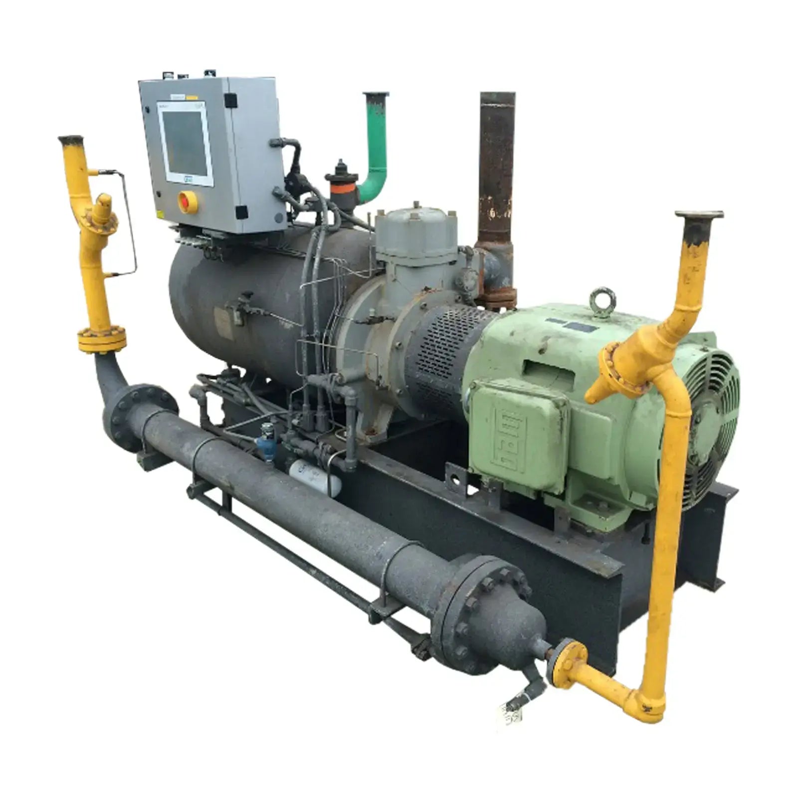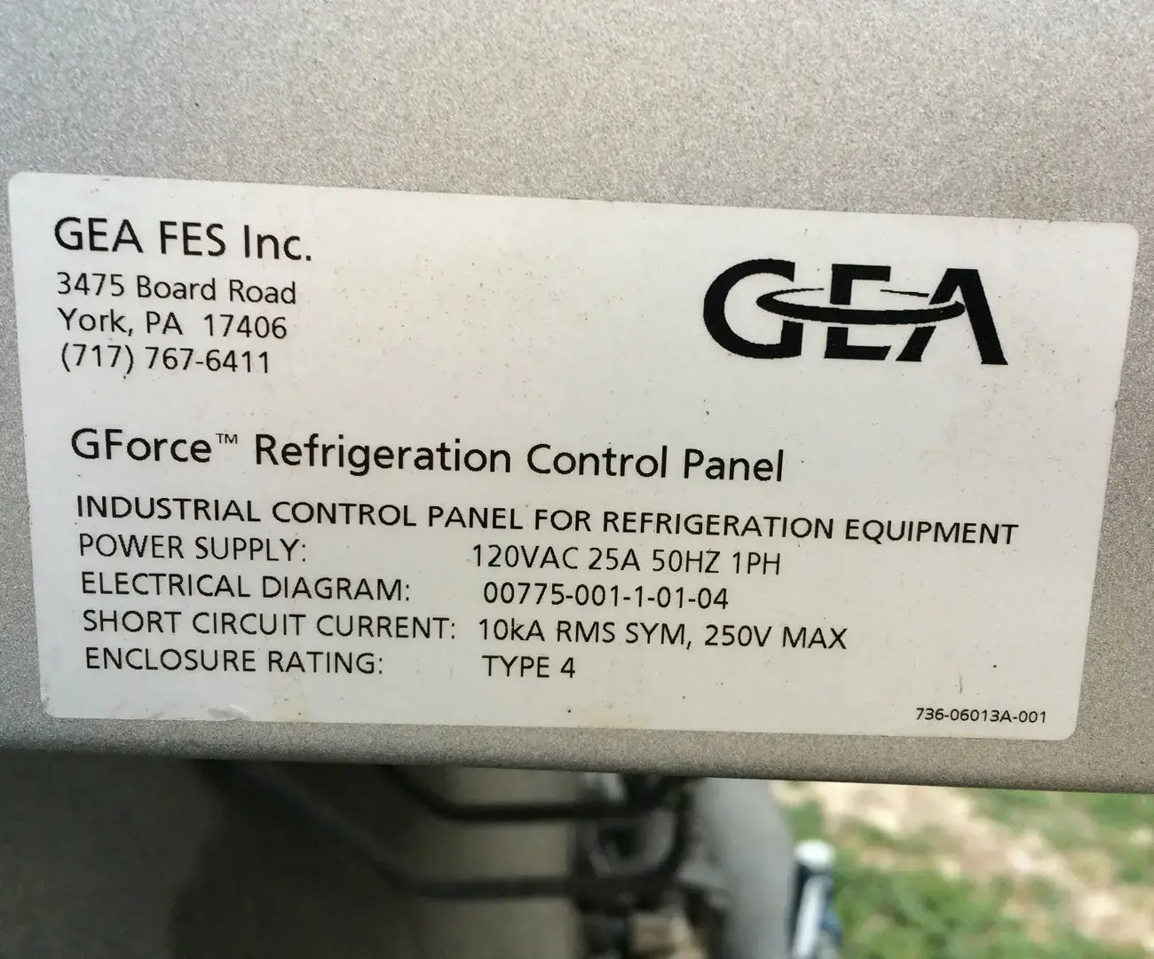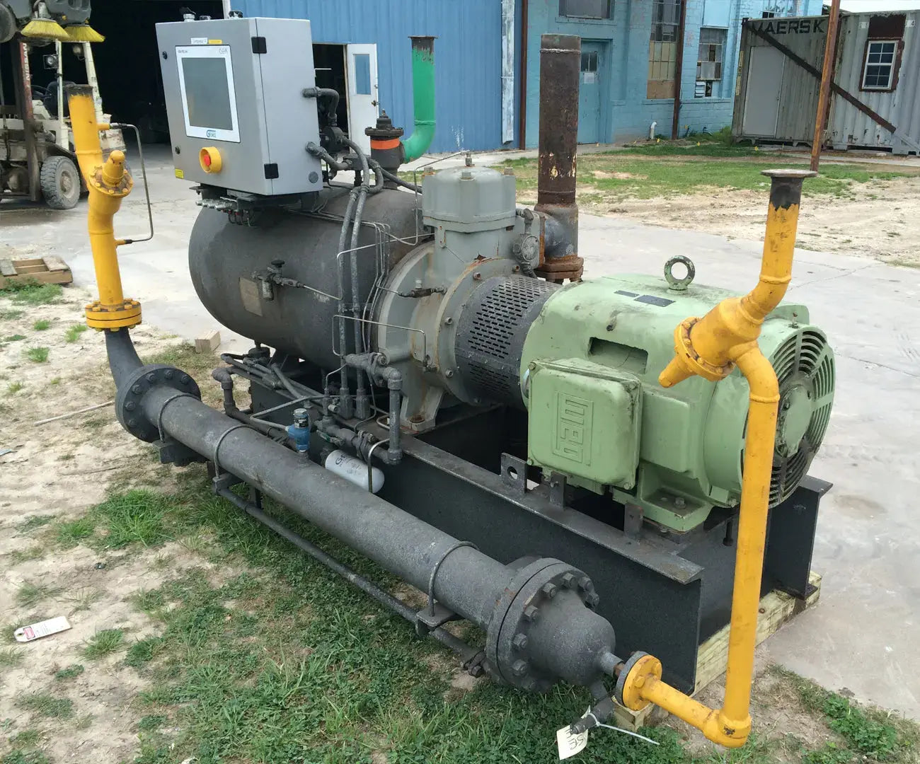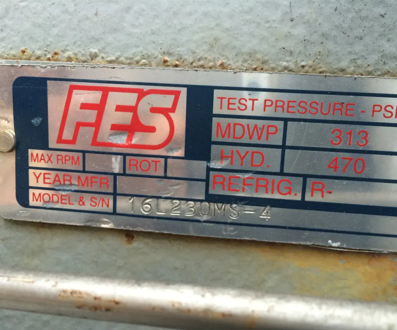 Paquete compresor de tornillo rotativo FES / Kobelco Kobe. Modelo/Serie: 16L230MS-4. MDWP: 313 PSIG. HYD: 470. Clasificación nominal: 145 TR a +9F / +95F. Cuenta con compresor de tornillo rotativo fabricado por Kobelco, Serie GB Modelo 16L, con control de capacidad continuo de válvula deslizante (20-100%). Volumen barrido: 720 M3/h a 3000 RPM (423,8 CFM), 360 M3/h a 1500 RPM (211,9 CFM). Velocidad máxima: 4800 RPM. El compresor fue actualizado en 2002. Recipiente separador de aceite certificado por FES, Inc., Nat'l. Bd.: 5258, serie 900614, año 1991, MAWP: 300 PSI a 200F, MDMT: -20F a 300 PSI. Enfriador de aceite por termosifón. Panel de control de refrigeración (micro) GEA FES GForce instalado en 2009, contrato 00775-001-1-01-04. Motor eléctrico WEG instalado en 2003: 250 HP, 460V, 3560 RPM, Bastidor 444/5TS, trifásico, 60 Hz. El paquete se desinstaló en febrero de 2016. Dimensiones totales: 10 pies de largo x 4 pies de ancho x 8 pies de alto. Horas: 4317 horas