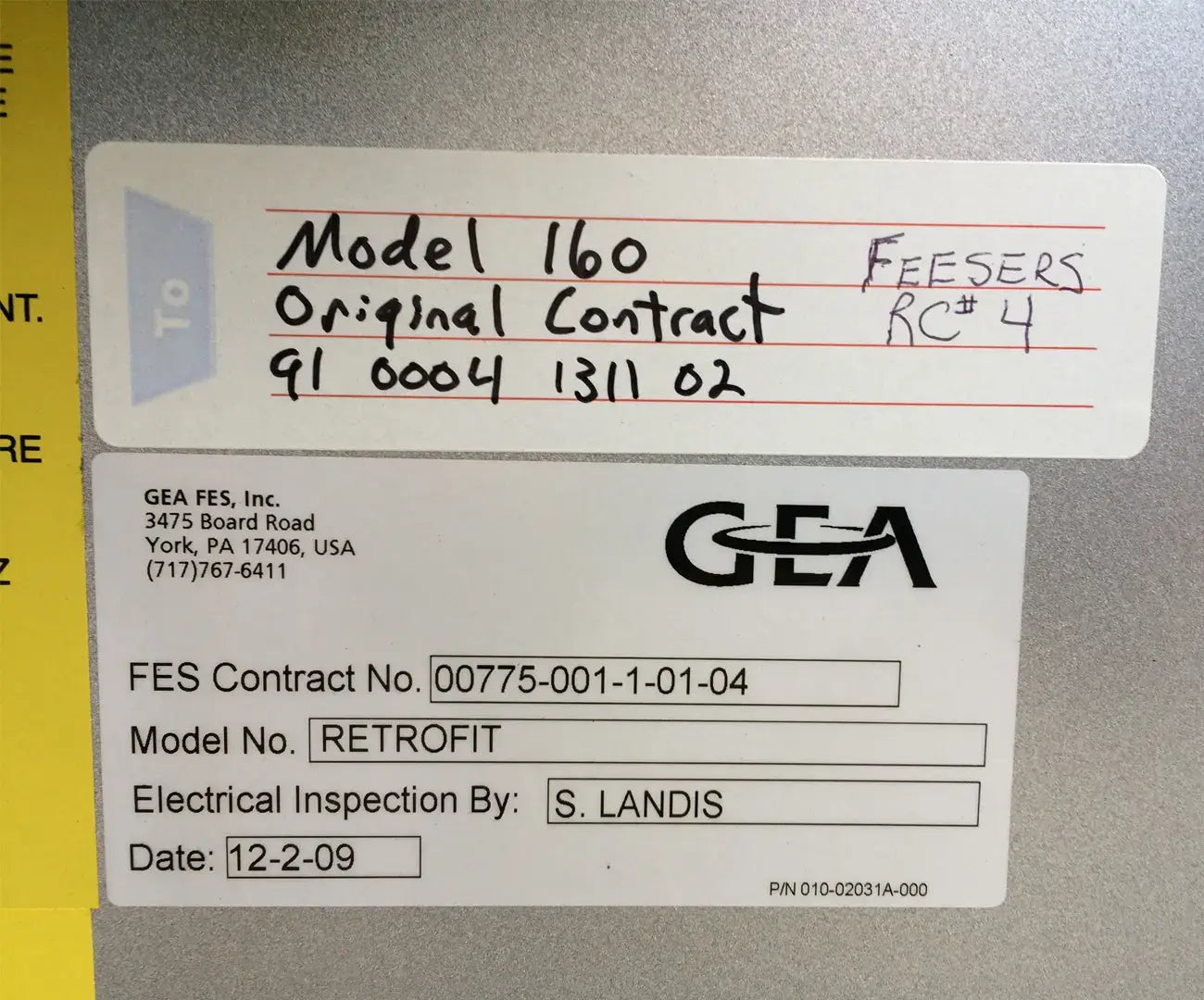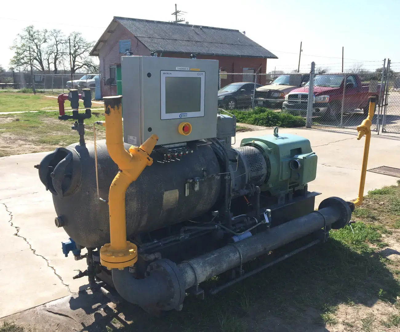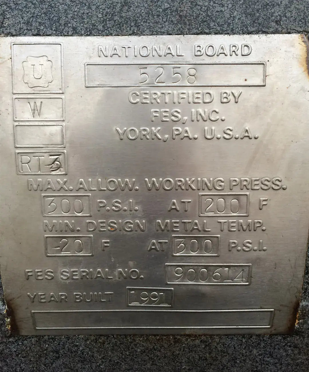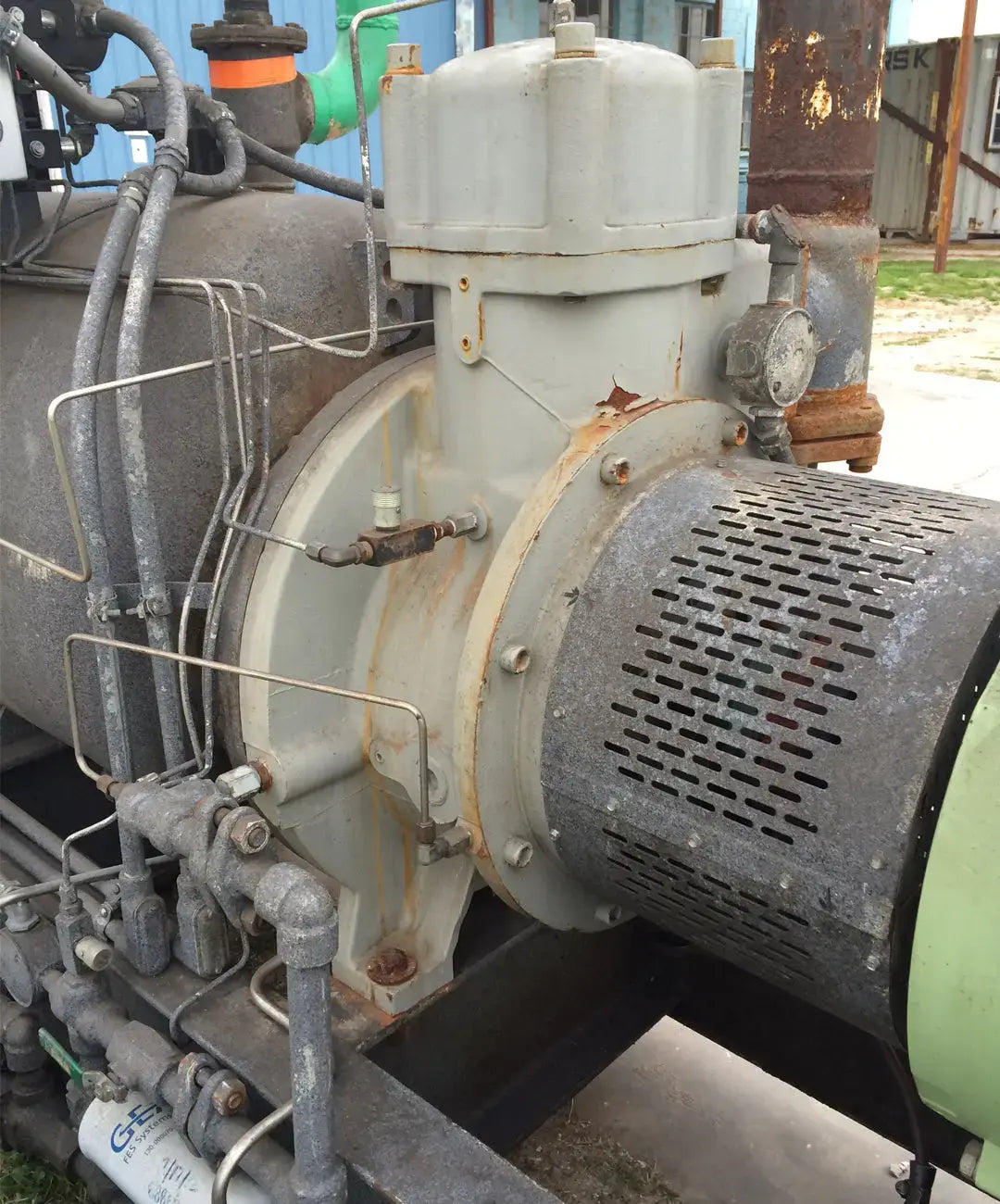Paquete compresor de tornillo rotativo FES / Kobelco Kobe. Modelo/Serie: 16L230MS-4. MDWP: 313 PSIG. HYD: 470. Clasificación nominal: 145 TR a +9F / +95F. Cuenta con compresor de tornillo rotativo fabricado por Kobelco, Serie GB Modelo 16L, con control de capacidad continuo de válvula deslizante (20-100%). Volumen barrido: 720 M3/h a 3000 RPM (423,8 CFM), 360 M3/h a 1500 RPM (211,9 CFM). Velocidad máxima: 4800 RPM. El compresor fue actualizado en 2002. Recipiente separador de aceite certificado por FES, Inc., Nat'l. Bd.: 5258, serie 900614, año 1991, MAWP: 300 PSI a 200F, MDMT: -20F a 300 PSI. Enfriador de aceite por termosifón. Panel de control de refrigeración (micro) GEA FES GForce instalado en 2009, contrato 00775-001-1-01-04. Motor eléctrico WEG instalado en 2003: 250 HP, 460V, 3560 RPM, Bastidor 444/5TS, trifásico, 60 Hz. El paquete se desinstaló en febrero de 2016. Dimensiones totales: 10 pies de largo x 4 pies de ancho x 8 pies de alto. Horas: 4317 horas