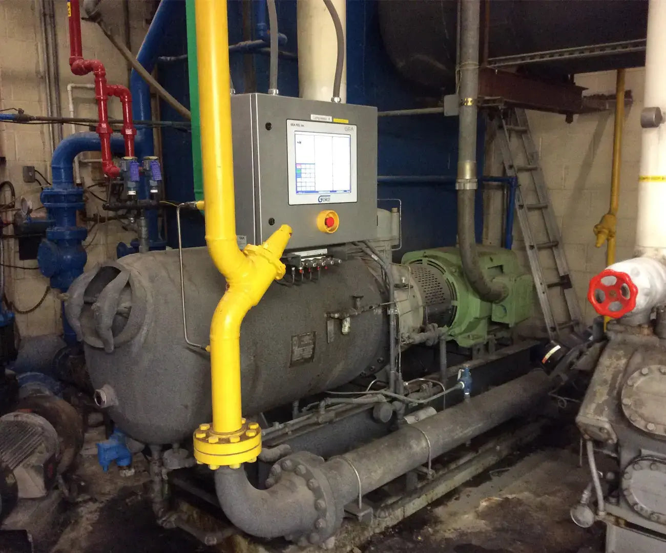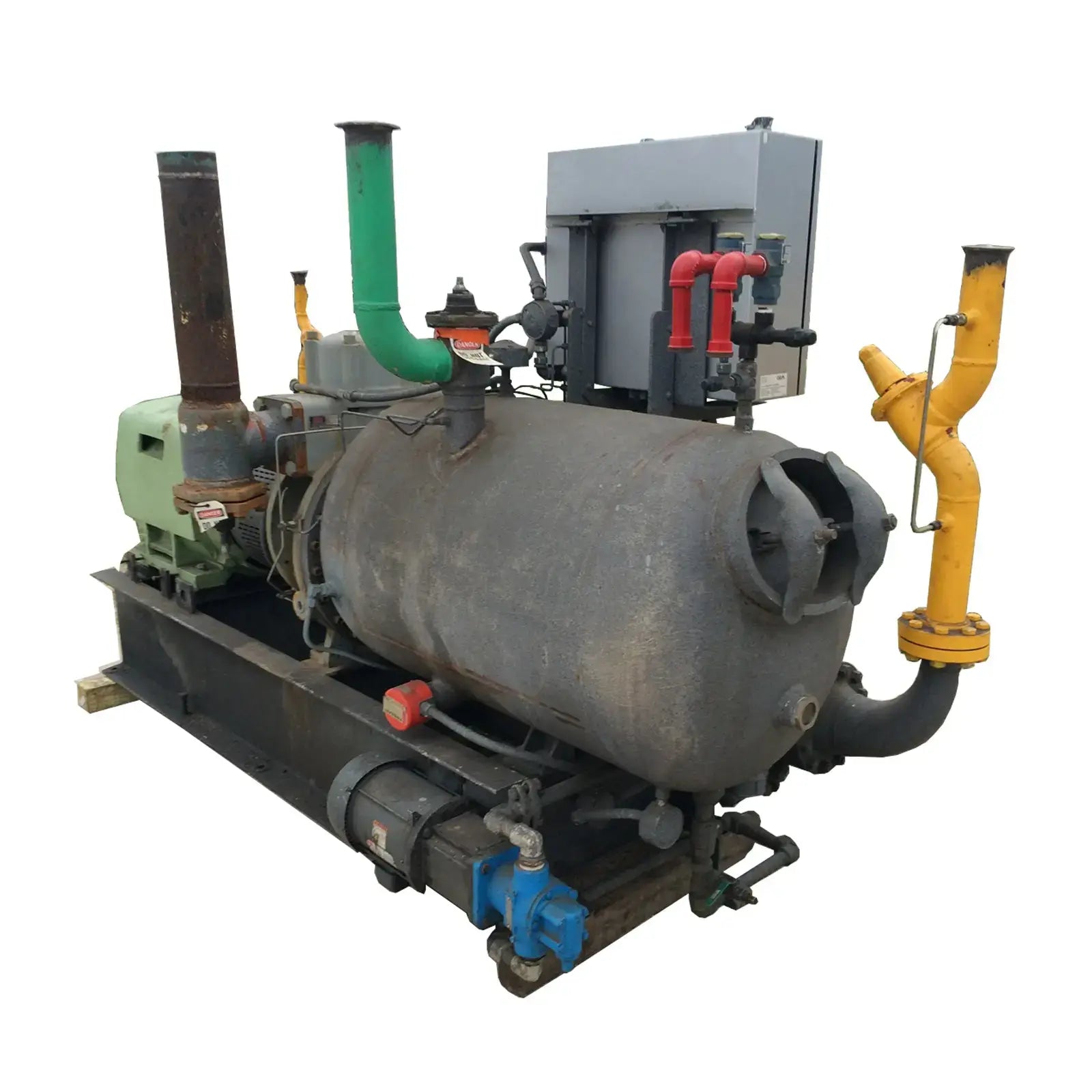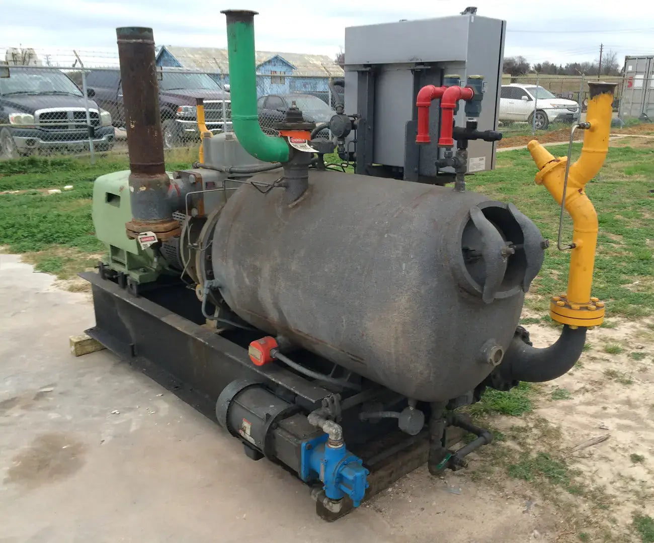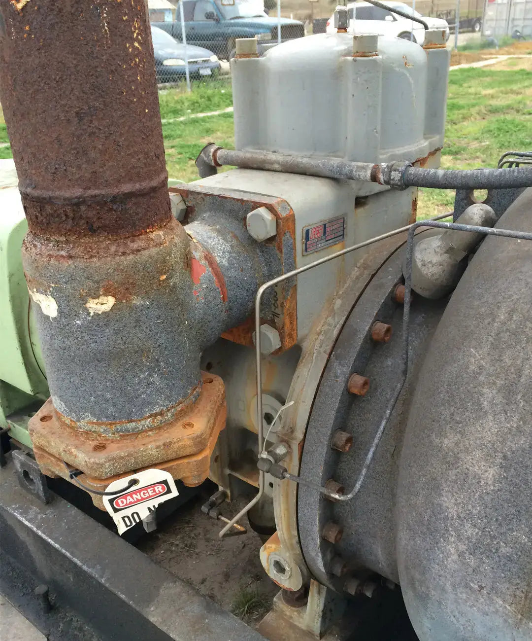 Paquete compresor de tornillo rotativo FES / Kobelco Kobe. Modelo/Serie: 16L230MS-4. MDWP: 313 PSIG. HYD: 470. Clasificación nominal: 145 TR a +9F / +95F. Cuenta con compresor de tornillo rotativo fabricado por Kobelco, Serie GB Modelo 16L, con control de capacidad continuo de válvula deslizante (20-100%). Volumen barrido: 720 M3/h a 3000 RPM (423,8 CFM), 360 M3/h a 1500 RPM (211,9 CFM). Velocidad máxima: 4800 RPM. El compresor fue actualizado en 2002. Recipiente separador de aceite certificado por FES, Inc., Nat'l. Bd.: 5258, serie 900614, año 1991, MAWP: 300 PSI a 200F, MDMT: -20F a 300 PSI. Enfriador de aceite por termosifón. Panel de control de refrigeración (micro) GEA FES GForce instalado en 2009, contrato 00775-001-1-01-04. Motor eléctrico WEG instalado en 2003: 250 HP, 460V, 3560 RPM, Bastidor 444/5TS, trifásico, 60 Hz. El paquete se desinstaló en febrero de 2016. Dimensiones totales: 10 pies de largo x 4 pies de ancho x 8 pies de alto. Horas: 4317 horas
