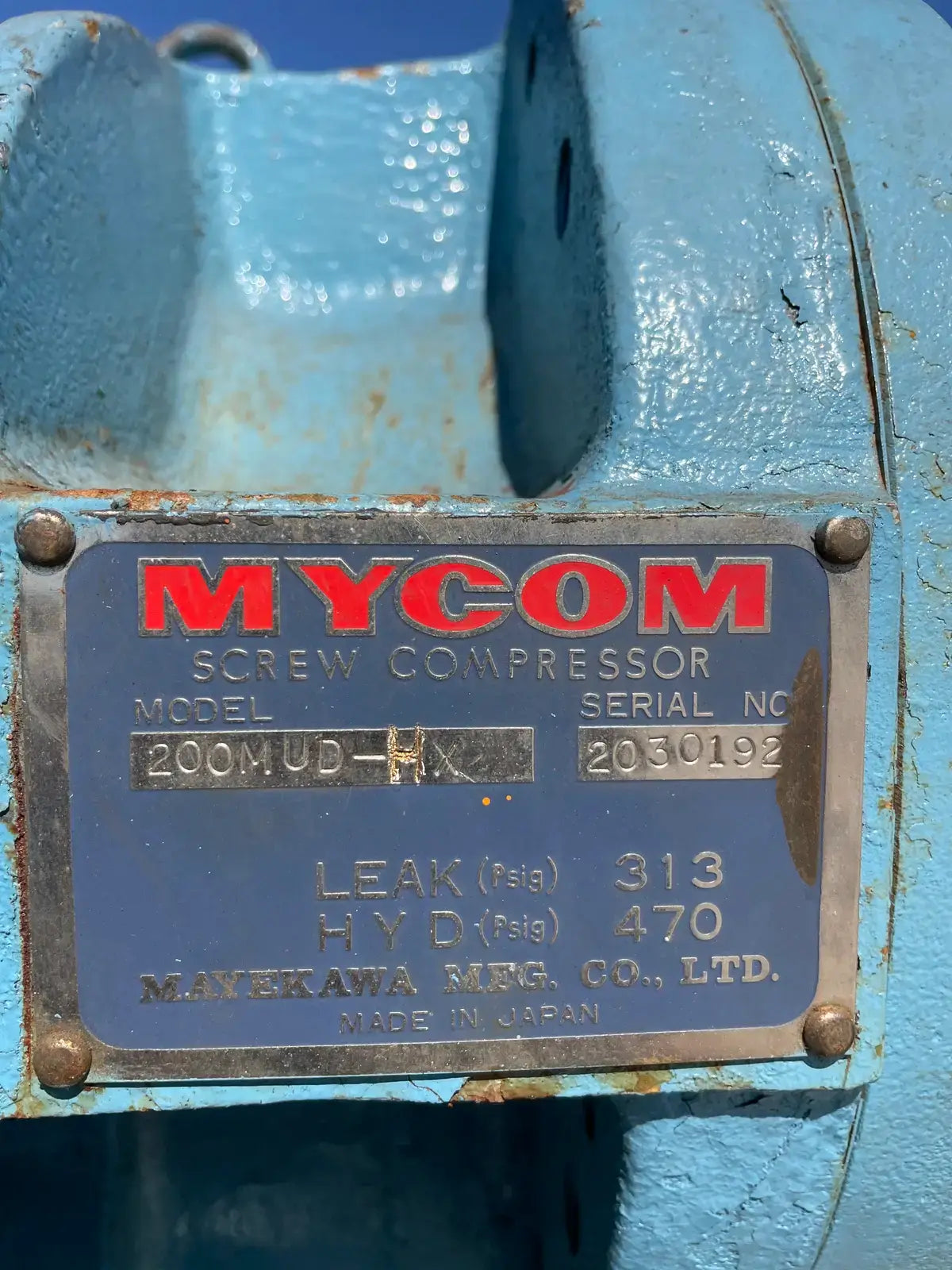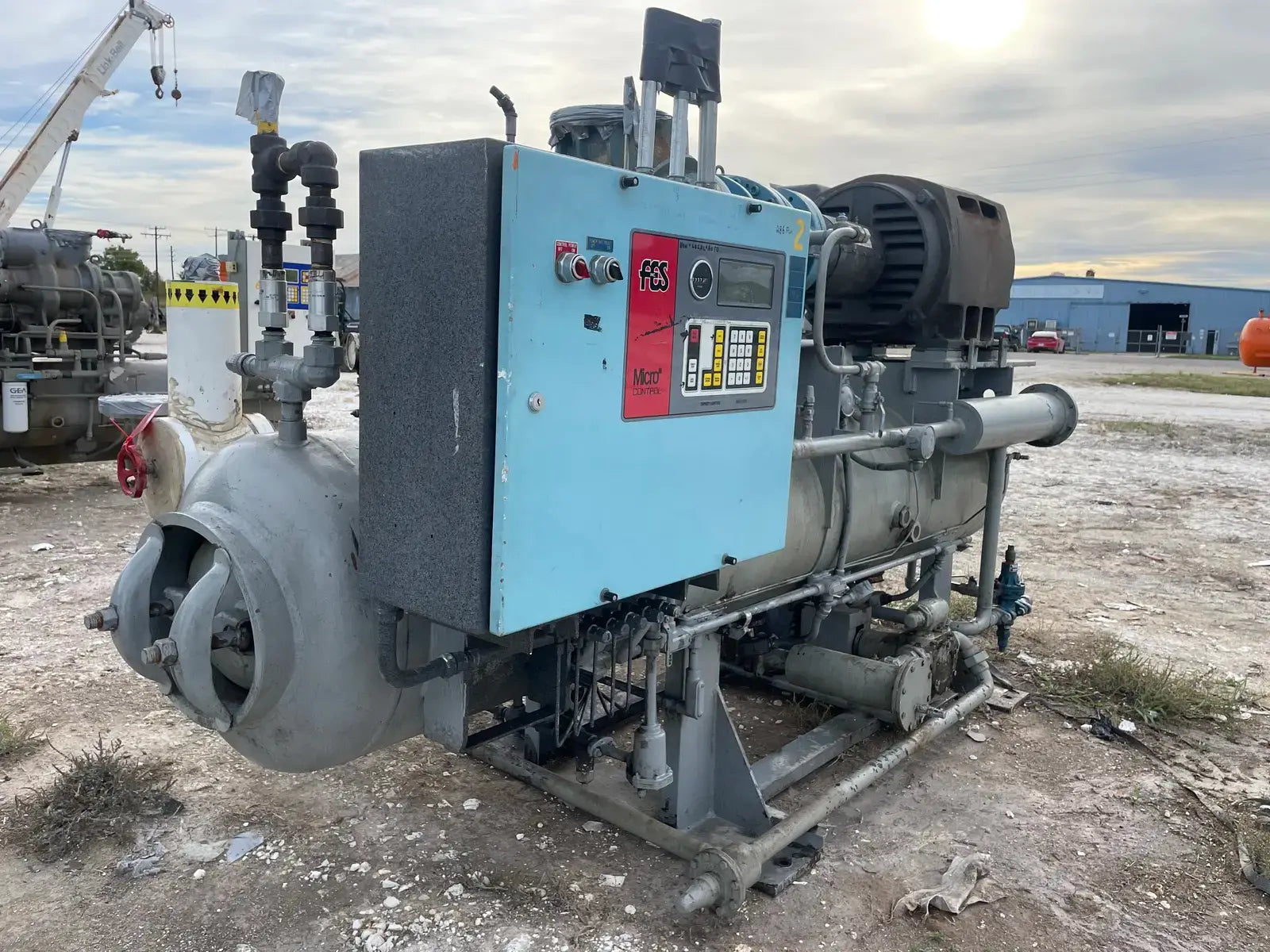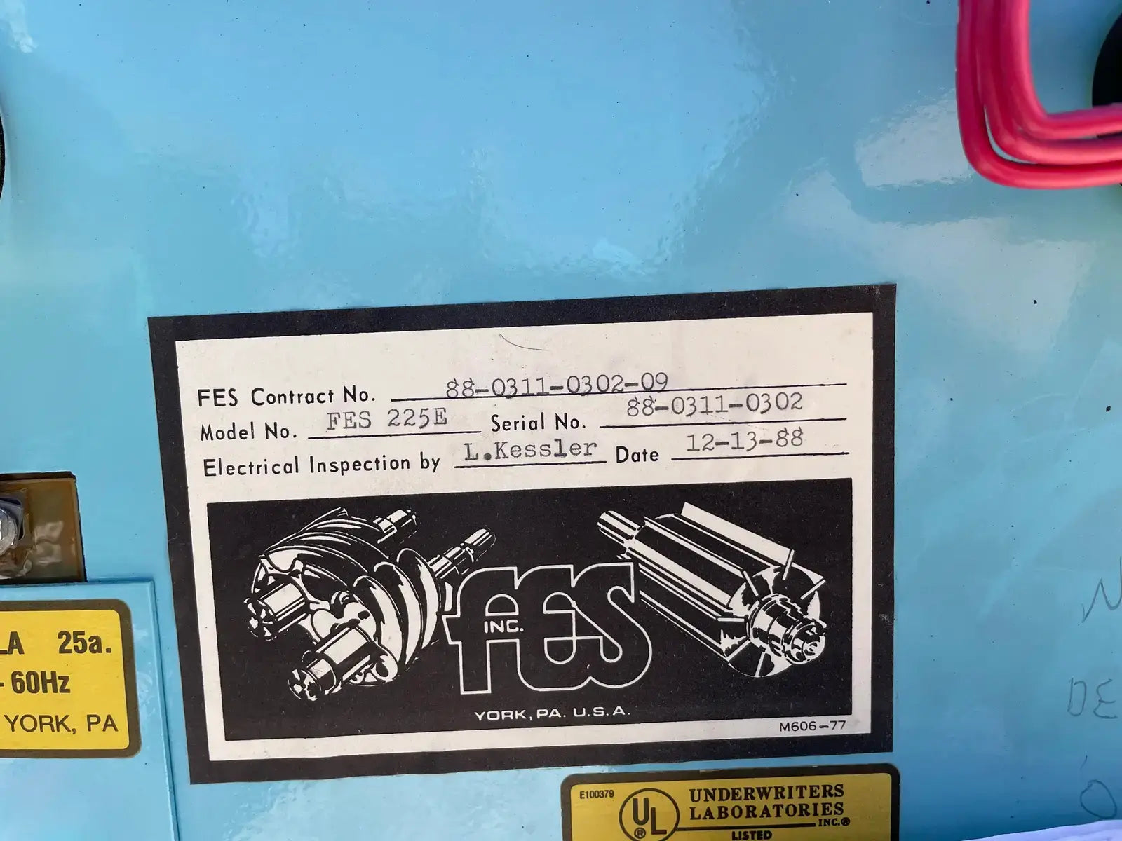 Paquete compresor de tornillo rotativo FES. Modelo: FES 225E. Número de serie: 88-0311-0302. Contrato FES No: 88-0311-0302-09. Fecha: 13-12-88. Compresor Rotativo de Tornillo Desnudo Mycom - Modelo: 200MUD-HX. Número de serie: 2030192. FUGA (PSIG): 313. HYD (PSIG): 470. Certificado por el separador de aceite FES - Junta Nacional: 3695. Número de serie FES: 88442. Presión máxima de trabajo en PSI: 250 PSI. Temperatura máxima: 200 F. Temperatura mínima del metal: -20. Panel de control FES Micro II.