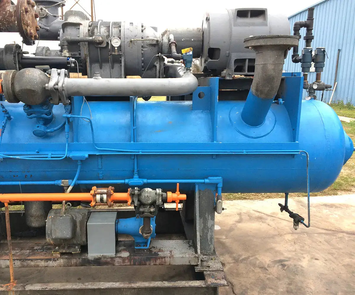 Paquete de compresor de doble tornillo FES Dunham Bush 255B - 125 HP. Compresor izquierdo: FES/Dunham-Bush 255-B, serie 4336. Motor Westinghouse 125 HP, 3545 RPM, 460V, 60 Hz, trifásico, 404TS. Compresor derecho: FES/Dunham-Bush 255-B, serie 4297. Motor Westinghouse 125 HP, 3545 RPM, 460V, 60 Hz, trifásico, 404TS. El compresor FES modelo 255 tiene un rendimiento nominal de 776 CFM. (2) Controles Micro Master FES. Dimensiones totales: 15 pies 8 pulgadas de largo x 6 pies 2 pulgadas de ancho x 7 pies 7 pulgadas de alto.