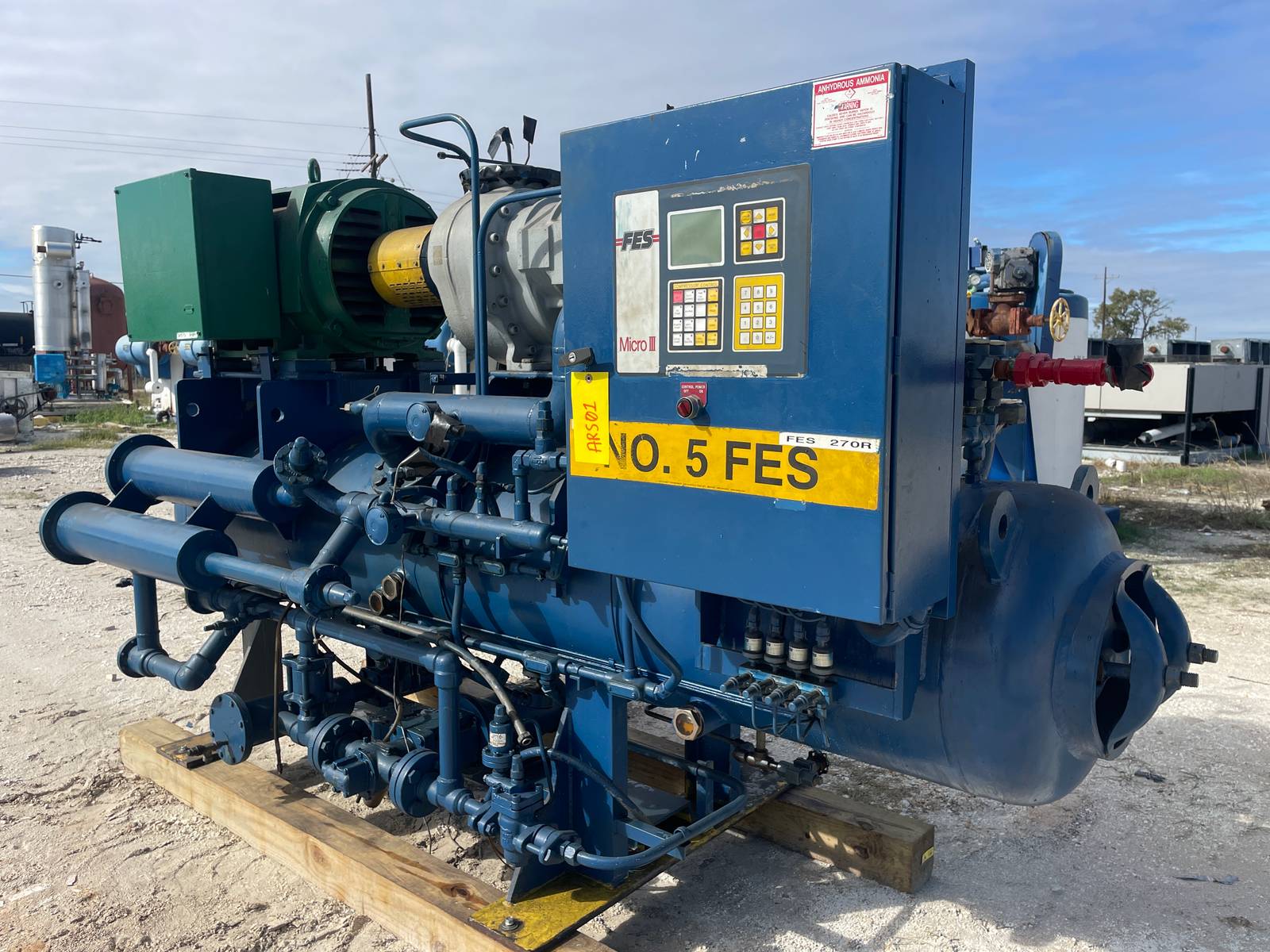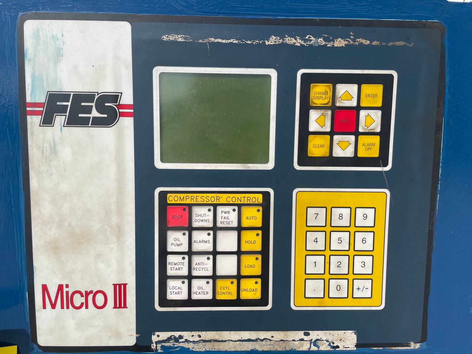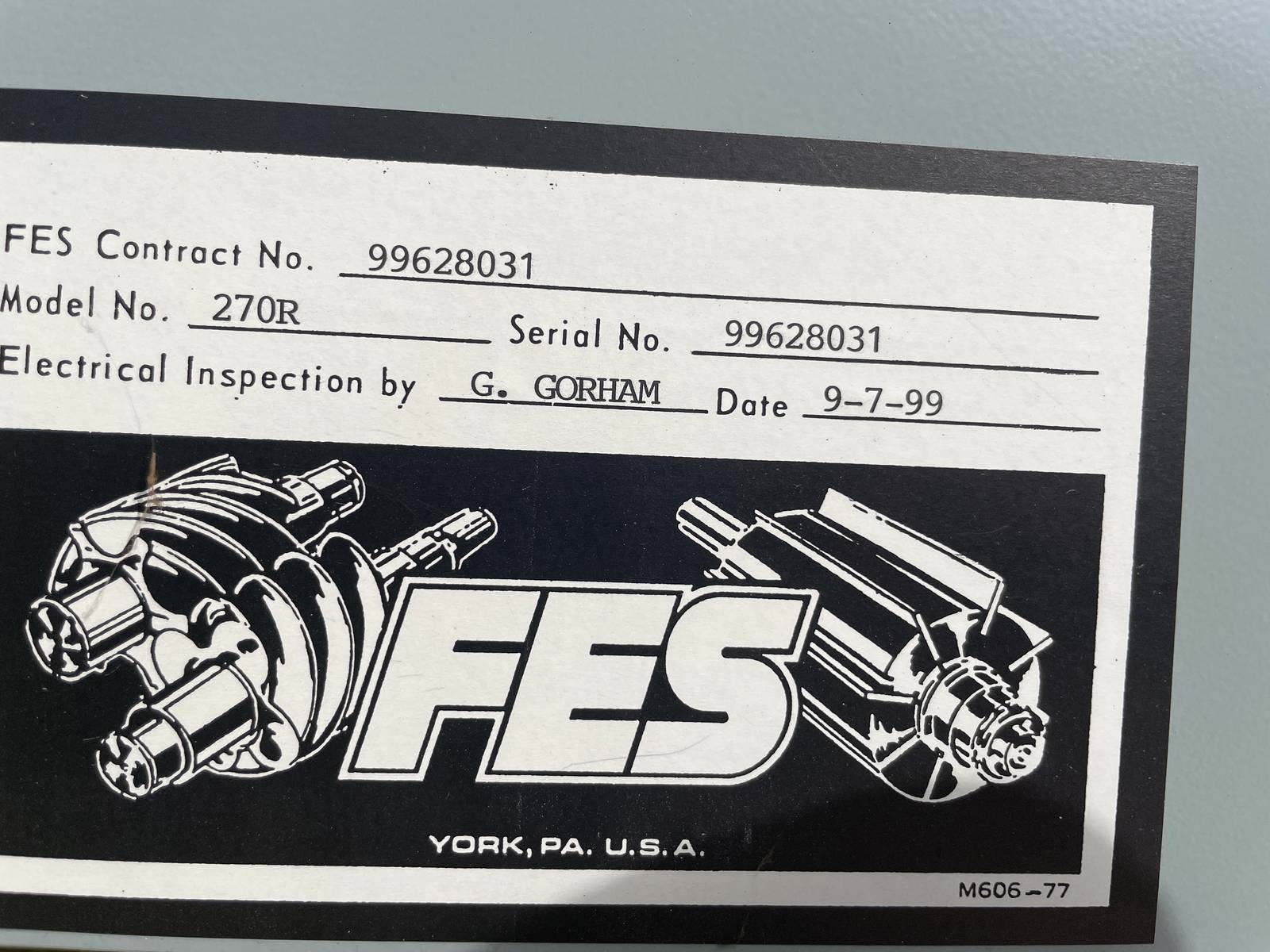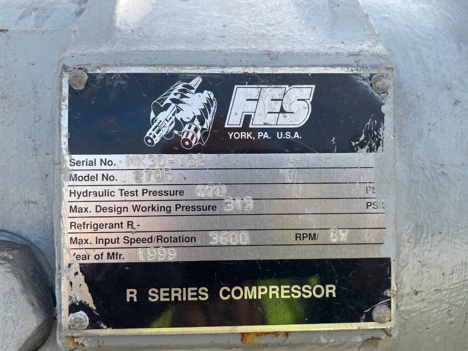 Paquete de compresor de tornillo rotativo FES 270R usado con un motor Toshiba de 350 HP y un micropanel FES Micro III. Detalles del paquete: N.° de contrato FES: 99628031, N.° de modelo: 270R, N.° de serie: 99628031. Compresor de tornillo desnudo FES: Modelo: 270R, N.° de serie: MK3D-132, Presión de prueba hidráulica: 470 PSIG, Presión máxima de trabajo de diseño: 313 PSIG. RPM máximas: 3600. Año de fabricación: 1999.