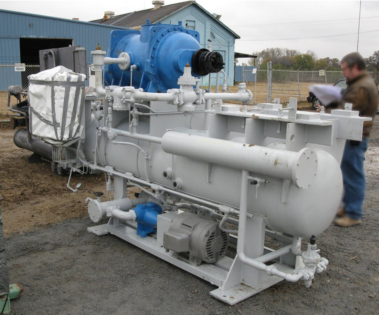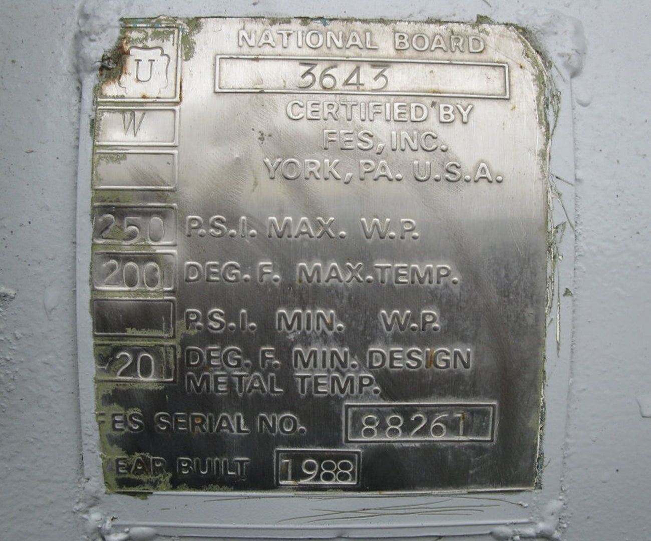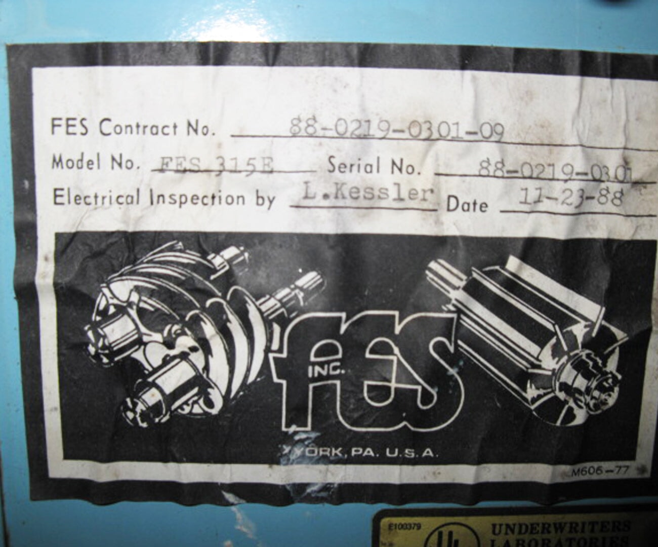 Paquete compresor de tornillo rotativo FES 315 / Howden 204/1.93. Modelo: 315. S/N: WRV204-19336-081. Panel de control: Modelo: FES315E. Número de serie: 88-0219-0301. Refrigerante: R-717. Configuración de Vi fija: 3.6. Desplaza 488 CFM a 1800 rpm o 950 CFM a 3000 RPM. Presión de prueba de fugas: 313. Presión de prueba hidrostática: 470. Separador de aceite: FES, S/N: 88261. Nat'l Bd: 3643. MAWP: 250 psi @ 200ºF. MDMT: -20ºF a 250 psi. Radio: extremos elípticos. Bomba: Bomba Viking: Modelo: AV428AL. S/N: 5019514. Motor: 7,5 hp, 1175 rpm, 230/460 V, 20,4/10,2 amperios, 60 Hz, trifásico. Entradas/Salidas: (2) 1 pulg. de diámetro. puerto. (1) 2 pulgadas de diámetro. puerto. Dimensiones totales: 10 pies 10 pulgadas de largo x 4 pies 3 pulgadas de ancho x 6 pies 5 pulgadas de alto. Tiempo de funcionamiento del compresor: 8291 horas (ACN328a-BC/Motor-88).
