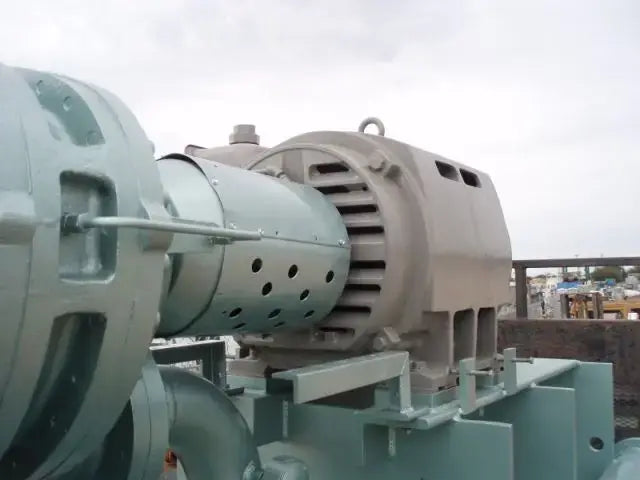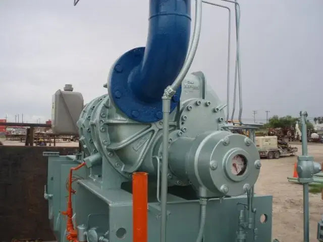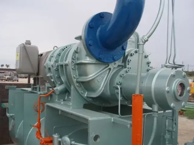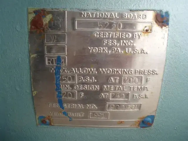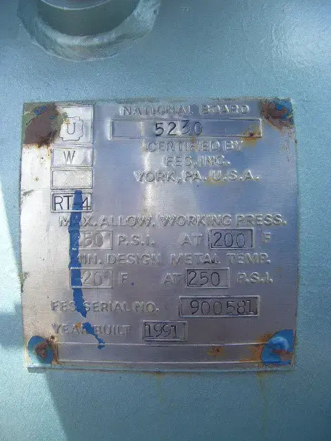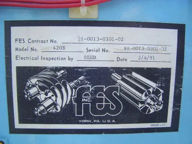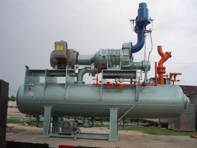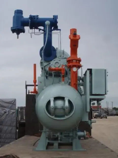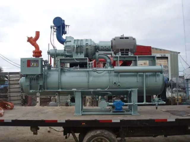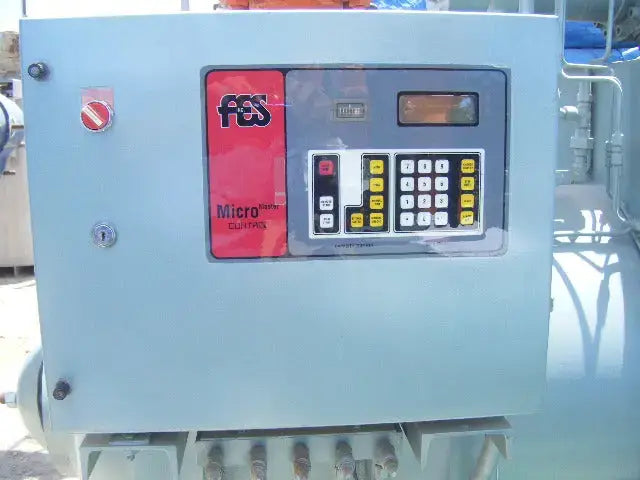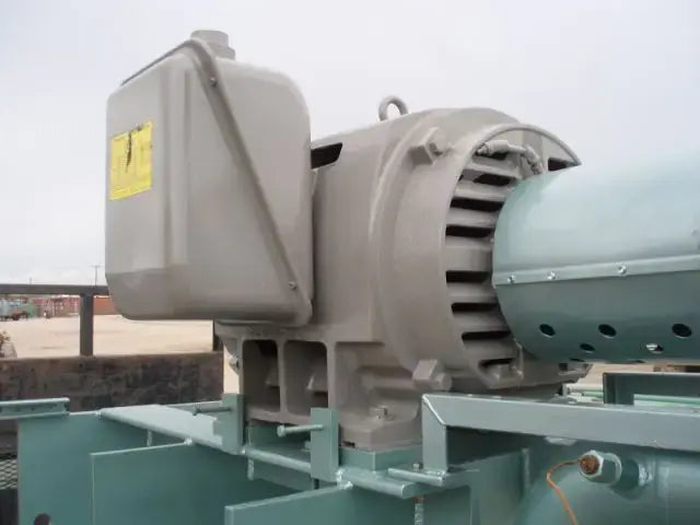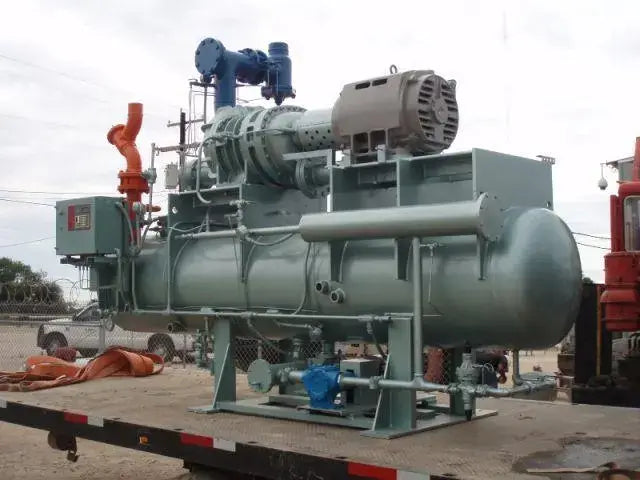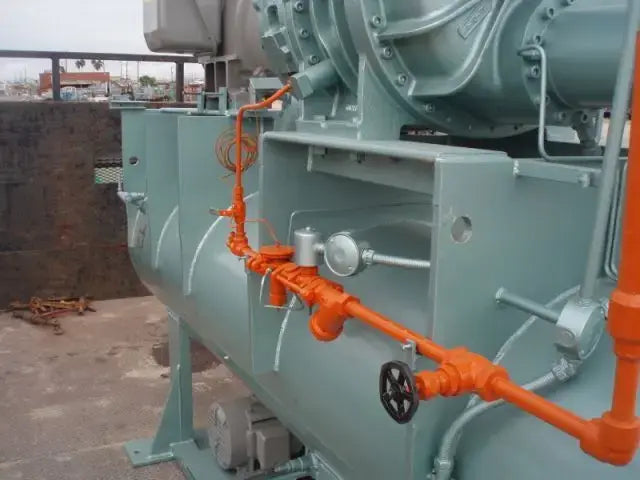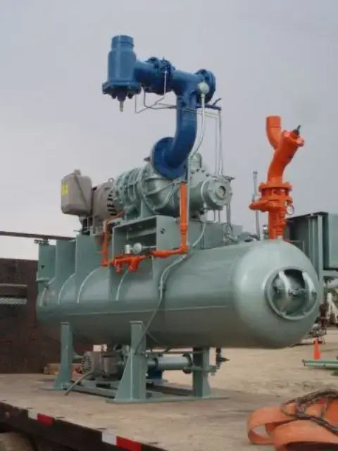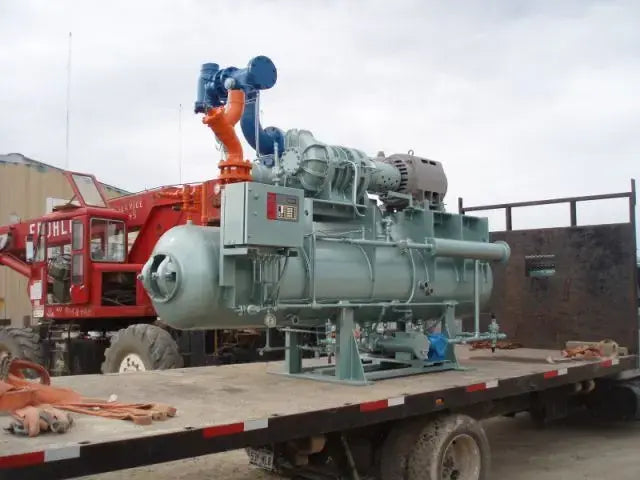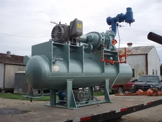 1991 Paquete reforzador de compresor de tornillo rotativo FES / Dunham-Bush. Compresor de tornillo rotativo Dunham-Bush/Hartford. Modelo: 420B. Presión de prueba de fugas: 250 psig. Presión de prueba hidrostática: 300 psig. Separador de aceite FES, MAWP: 250 psi a 200 °F, MDMT: -20 °F a 250 psi. Motor de alta eficiencia de Ram Industries. 150 HP, 3544 rpm, 348/174 amperios, 230/460 V, 60 Hz, trifásico., panel de control Micro Master, fuente de alimentación: 120 V / 25 FLA / 60 Hz / monofásico. Esta generación de compresores de tornillo de gran tamaño ha sido diseñada para ofrecer una larga vida útil, bajos niveles de ruido y vibración, mayor confiabilidad y menores costos operativos. Entradas: (1) 6 pulg. de diámetro. puerto de succión de refrigerante, (1) puerto de 1 ½ pulgadas. Salidas: (1) 4 pulg. de diámetro. Puerto de descarga de refrigerante, (2) 1 pulg. de diámetro. Puertos, dimensiones totales: 13 pies 2 pulgadas de largo x 5 pies 7 pulgadas de ancho x 9 pies 2 ½ pulgadas de alto. Tiempo de funcionamiento del compresor: 74,708 horas (H4). (ACN720).