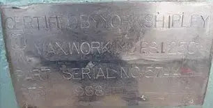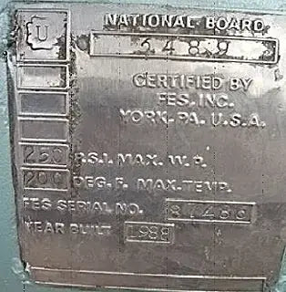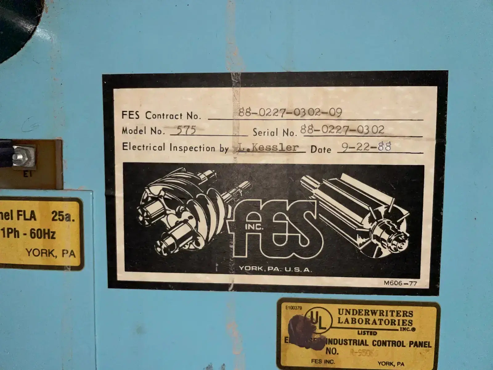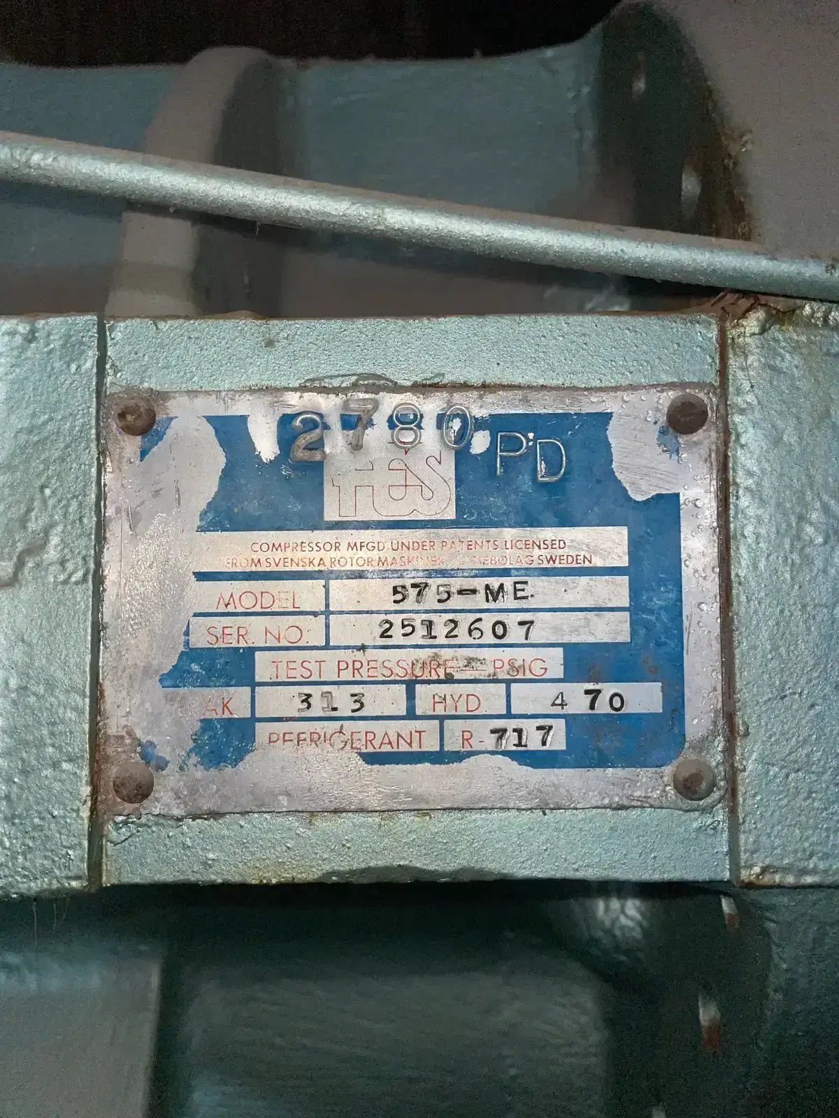 Paquete compresor de tornillo de amoníaco FES 575 / Mycom 250L - 700 HP. Modelo 575/250L. S/N: 2512607. Número de contrato: 88-0227-0302-09. Refrigerante: R-717, amoniaco. Presión de prueba de fugas: 313 psig. Presión de prueba hidrostática: 470 psig. FES MAWP: 250 psi. Configuración Vi: 3.6. Desplazamiento: 1.670 cfm. Separador de aceite, S/N: 87486, Nat'l Bd: 3489, presión máxima de trabajo: 250 psi, temperatura máxima de trabajo: 300°F, temperatura mínima: -20 °F. Panel de control FES Micro II, 120 V. Motor General Electric, 700 hp, 3570 rpm, 4160 V, 86,3 amperios, 60 Hz, trifásico. Entradas: (1) 13 pulg. de diámetro. puerto con un diámetro de 17-1/2 pulg. brida. Salidas: (1) 4 pulg. de diámetro. puerto. Dimensiones totales: 13 pies 1 pulg. de largo x 4 pies 8 pulg. de ancho x 8 pies 4 pulg. de alto. Tiempo de funcionamiento del compresor: 40,625 horas (H4)(SR450) (ACN950) NOTA: Este paquete ya no contiene este motor.