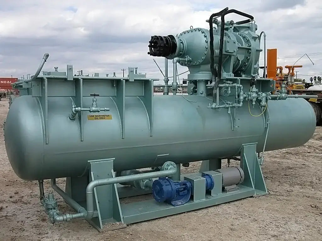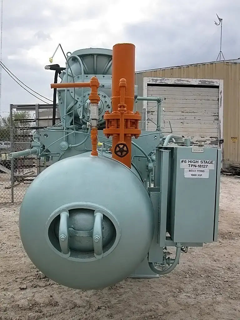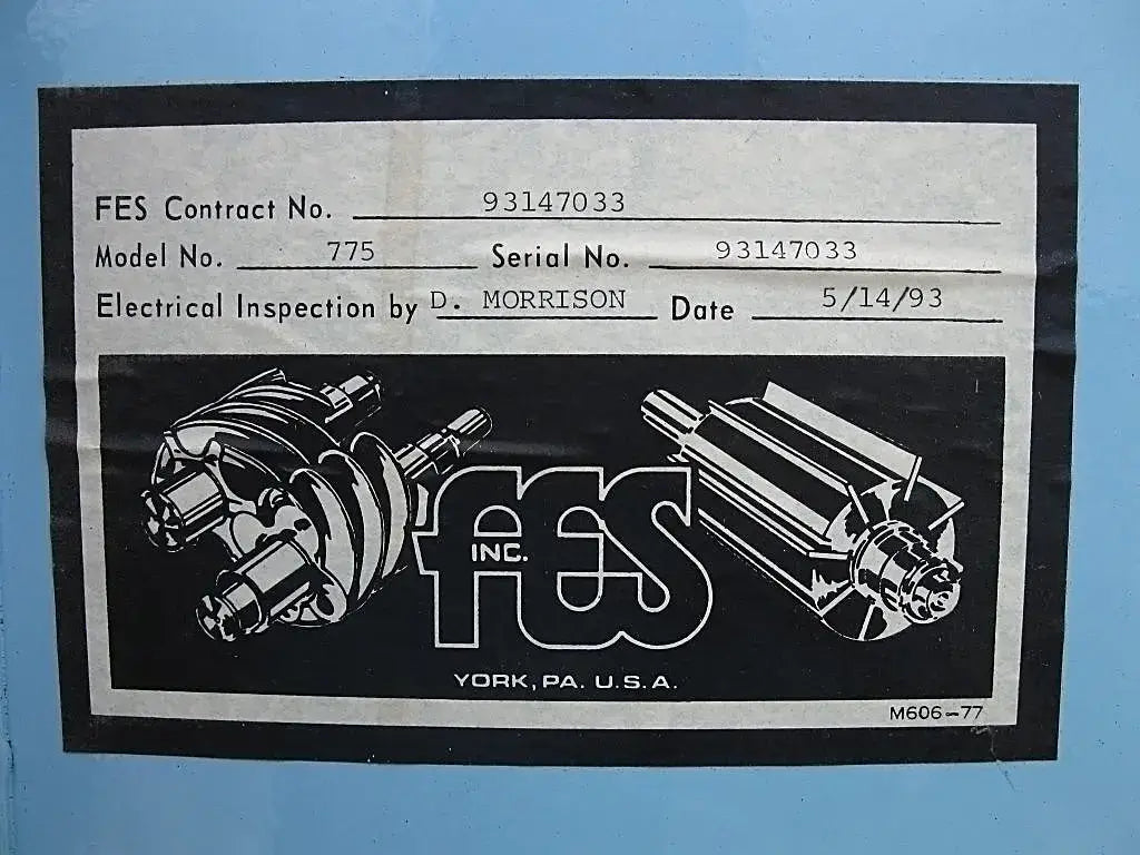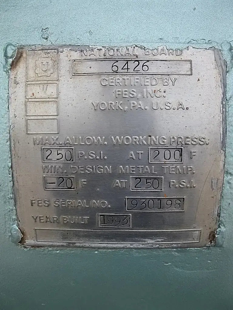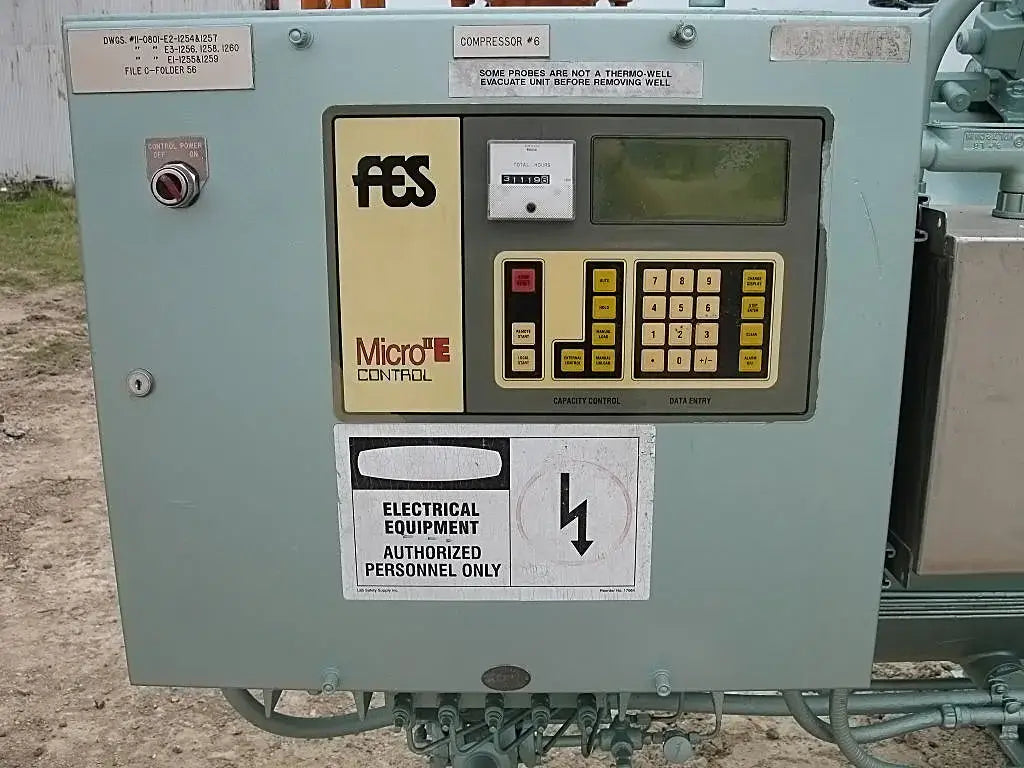 1993 Paquete de compresor de tornillo rotativo FES 775 / Mycom 320SU. Modelo: 775/320SU. Refrigerante R-717. Separador de aceite FES 1993, MAWP: 250 psi a 200 °F, MDMT: -20 °F a 250 psi. Panel de control FES Micro II E. Compresor de tornillo rotativo Mycom, Modelo: 320SU. Configuración Vi: 3.6. Desplazamiento: 2236 cfm. Capacidad nominal: 825 toneladas a 936,2 bhp con una temperatura de condensación de 95ºF y una temperatura de succión de 20ºF. Dimensiones totales: 16 pies 1 pulgada de largo x 5 pies 9 pulgadas de ancho x 10 pies de alto. Tiempo de funcionamiento del compresor: 31.119,6 horas. desde la reconstrucción de Mycom.(H4)(ACN1450).