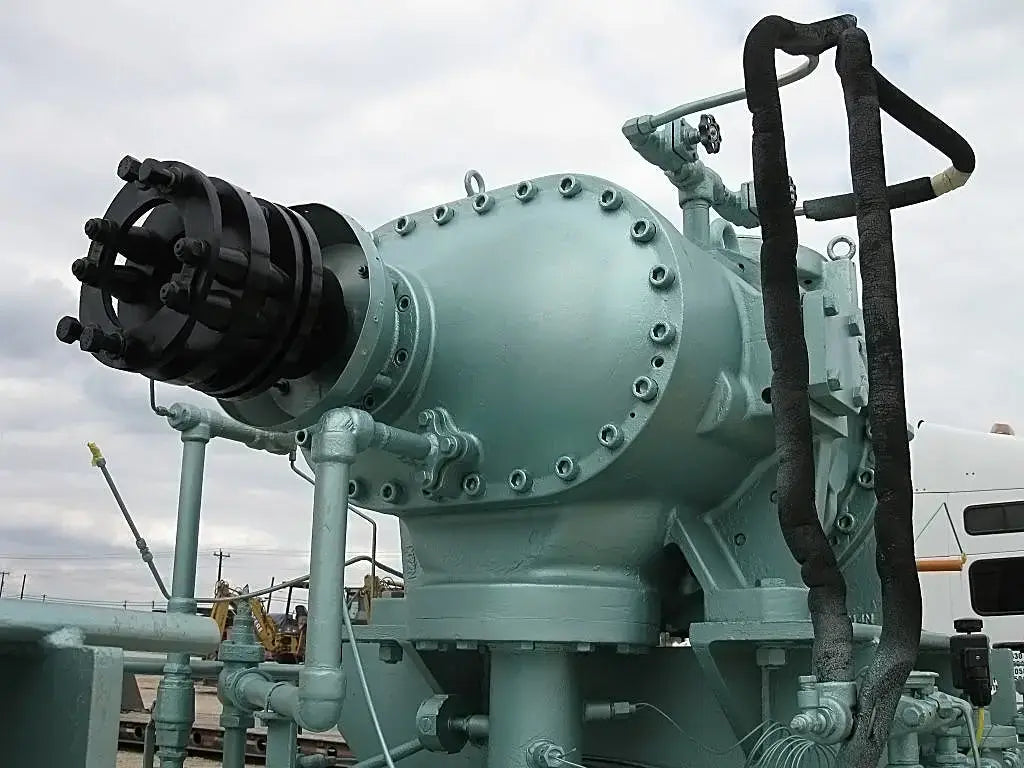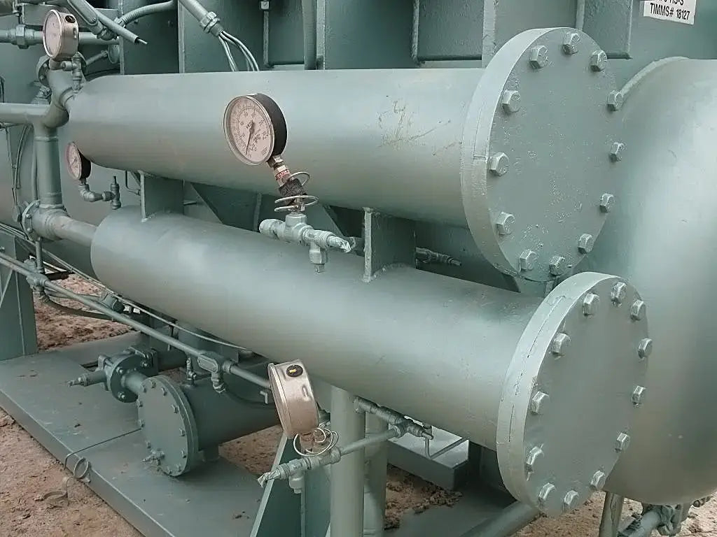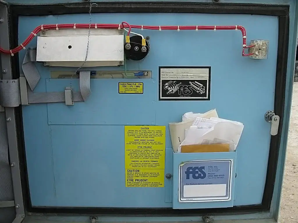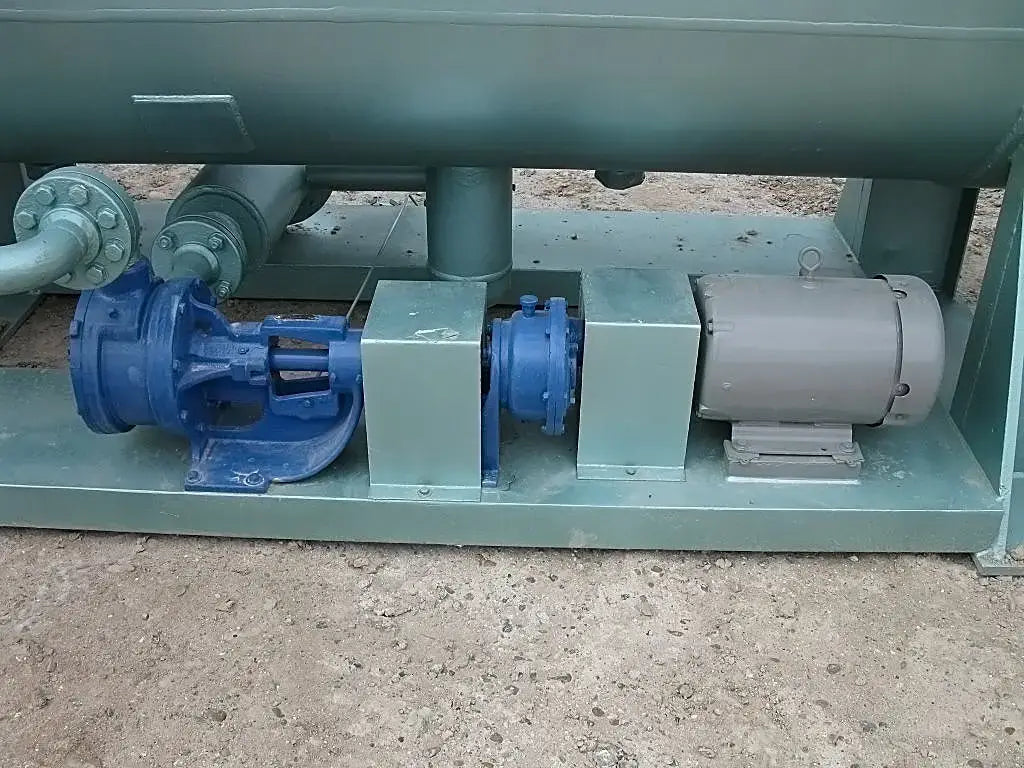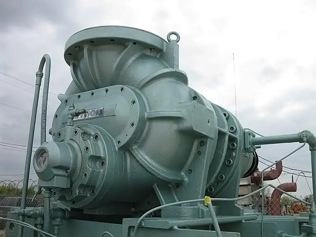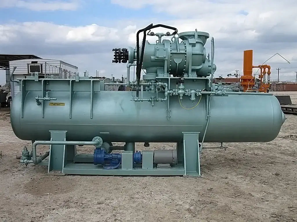 1993 Paquete de compresor de tornillo rotativo FES 775 / Mycom 320SU. Modelo: 775/320SU. Refrigerante R-717. Separador de aceite FES 1993, MAWP: 250 psi a 200 °F, MDMT: -20 °F a 250 psi. Panel de control FES Micro II E. Compresor de tornillo rotativo Mycom, Modelo: 320SU. Configuración Vi: 3.6. Desplazamiento: 2236 cfm. Capacidad nominal: 825 toneladas a 936,2 bhp con una temperatura de condensación de 95ºF y una temperatura de succión de 20ºF. Dimensiones totales: 16 pies 1 pulgada de largo x 5 pies 9 pulgadas de ancho x 10 pies de alto. Tiempo de funcionamiento del compresor: 31.119,6 horas. desde la reconstrucción de Mycom.(H4)(ACN1450).