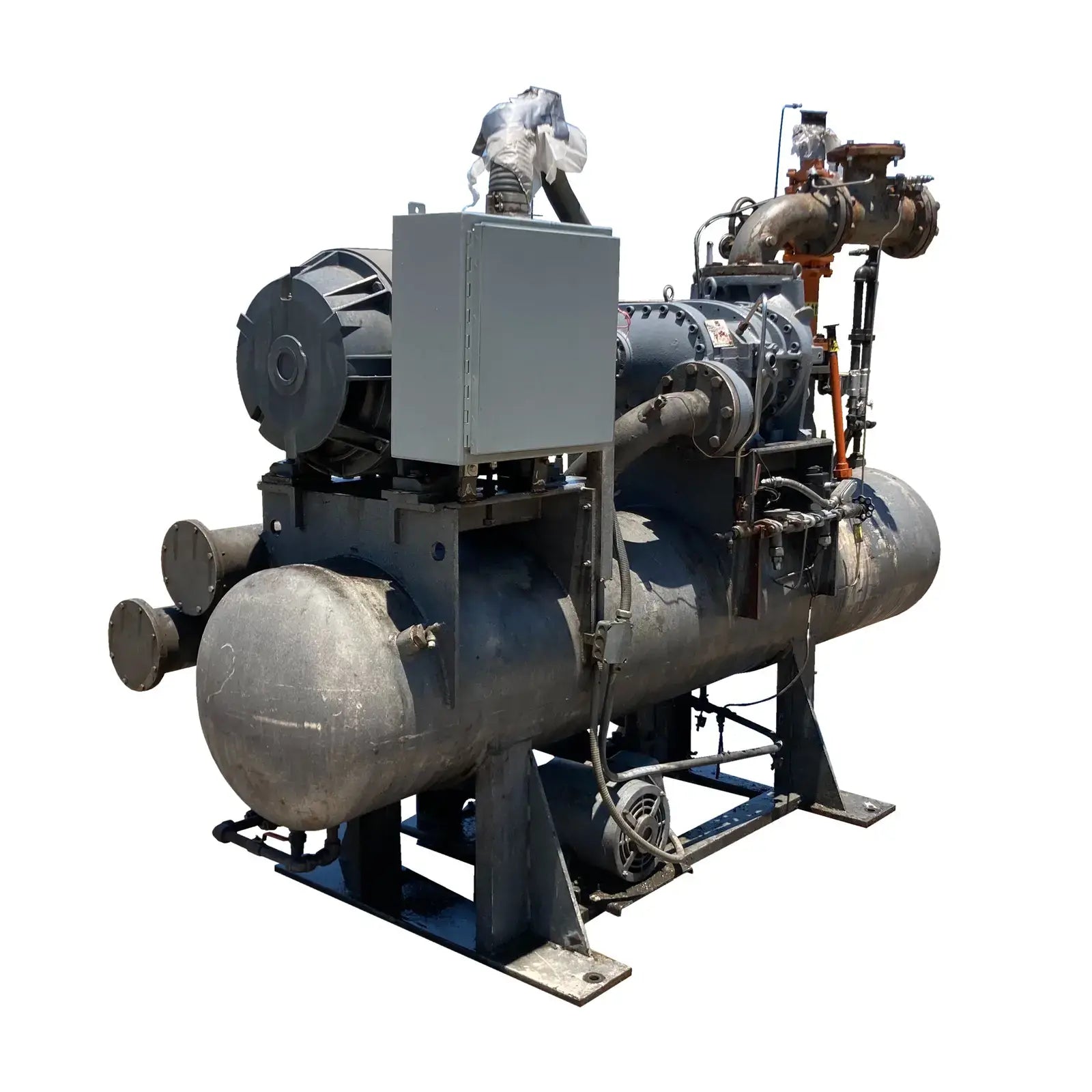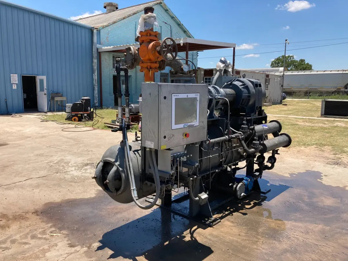 Compresor de tornillo rotativo GEA FES modelo 180-ME de 250 HP que incluye micro y paquete de arranque y tornillo: FES modelo 180-ME, número de serie 20 52 405 Horas de tornillo: enfriador de aceite, placa nacional n.° 982, MAWP de 250 PSI a 300 °F, AWP mínimo de -20 °F . Año 1980. Fabricado por Freezing Equipment Sales, INc. Número FES: 80131. Motor: Motor de inducción de calidad Siemens. 250HP, 268 Amperios, 460v, Trifásico, 60 Hz, 445TS, Año 1997