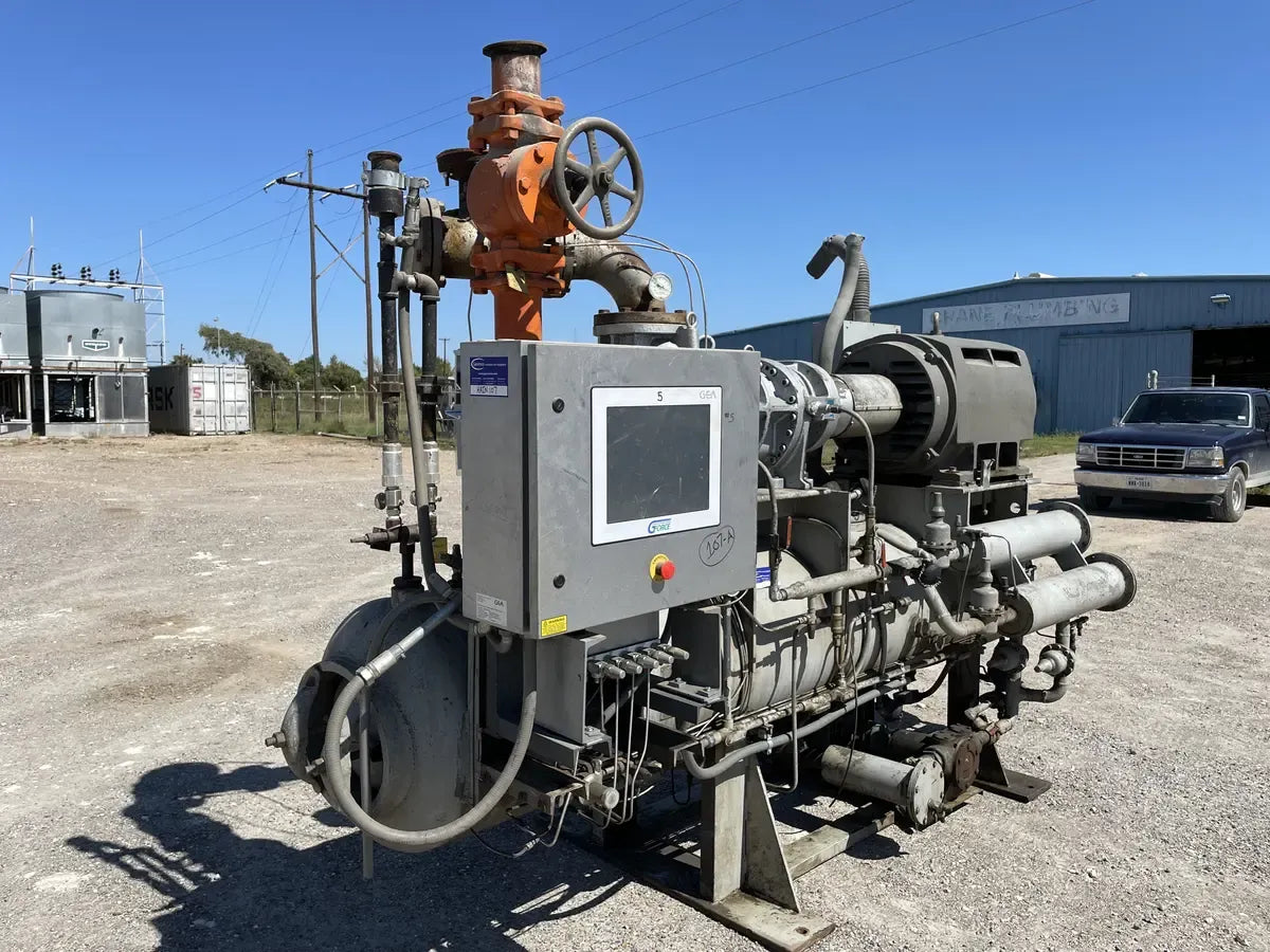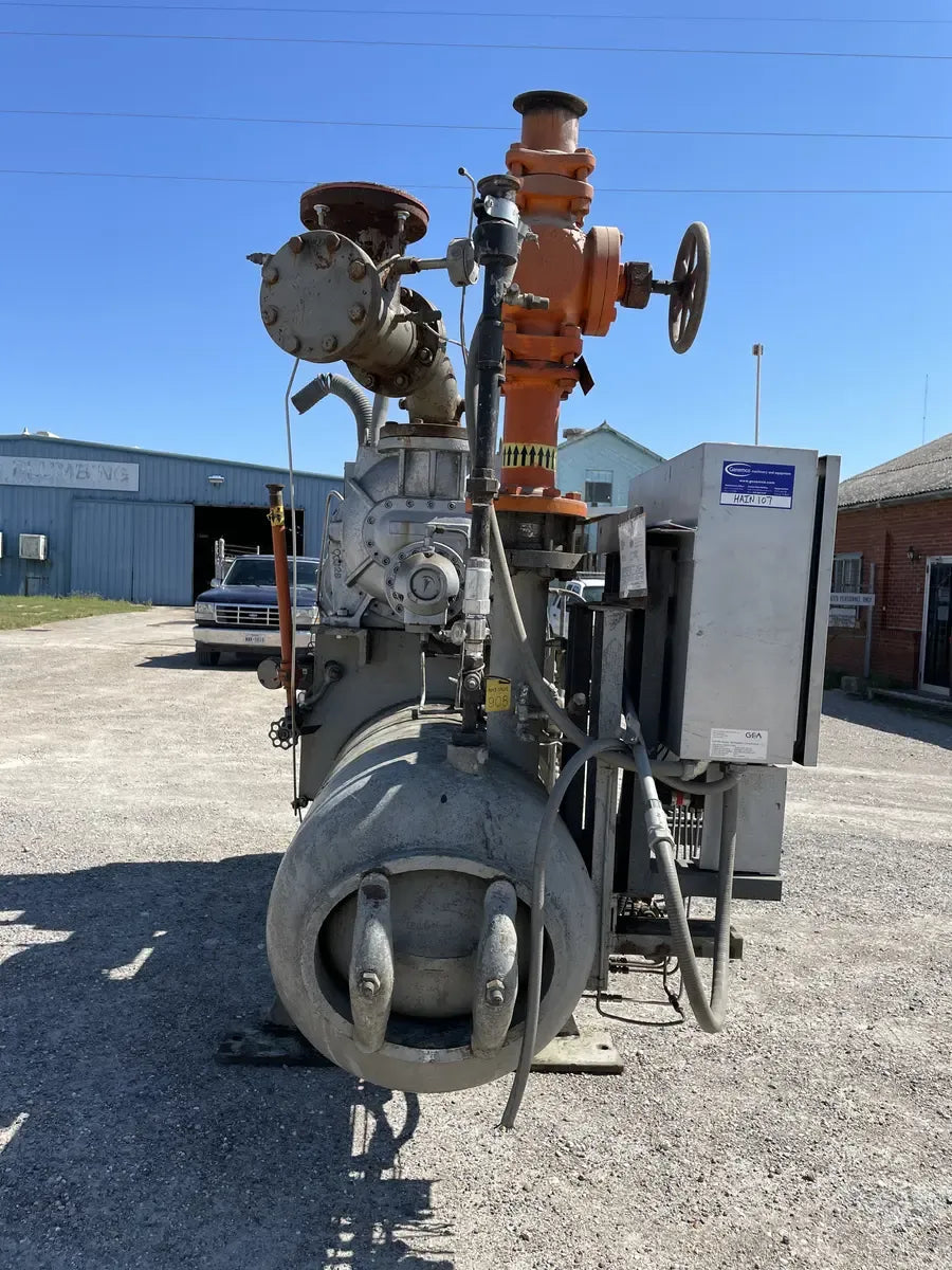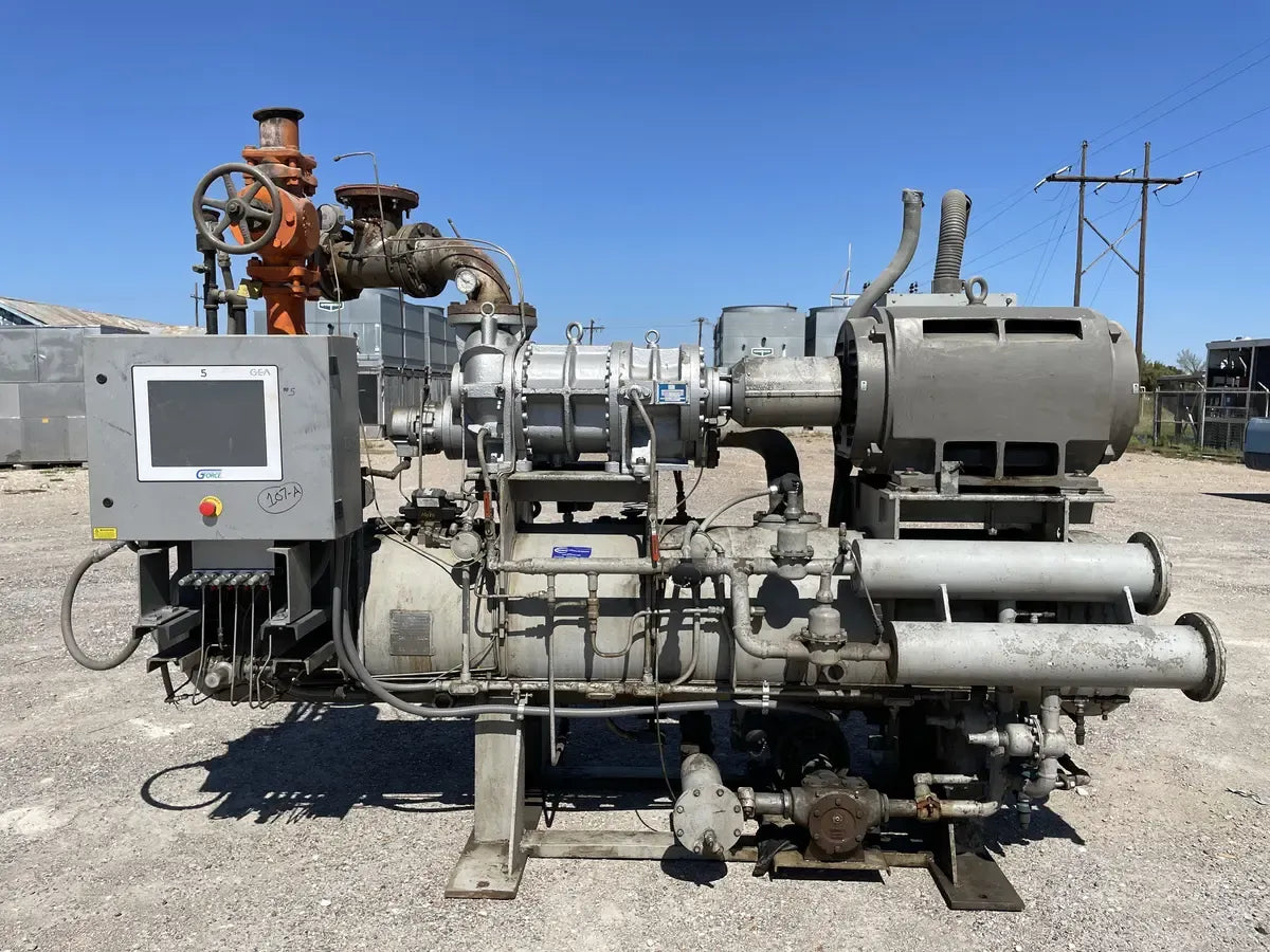 Compresor de tornillo rotativo GEA FES N-5 de 350 HP que incluye micro y paquete de arranque y tornillo: FES modelo 270-ME, número de serie 2012 444 horas de tornillo: Enfriador de aceite: Junta Nacional n.° 984, MAWP de 250 PSI a 300 °F, AWP mínimo de -20 °F. Año 1980. Fabricado por Freezing Equipment Sales, INc. Número FES: 80134. Motor: Motor de inducción de calidad Siemens. 350HP, 3570 RPM, 390 amperios, 460v, trifásico, 60 Hz, 447TSS. Refrigerante anterior: R717 Amoníaco