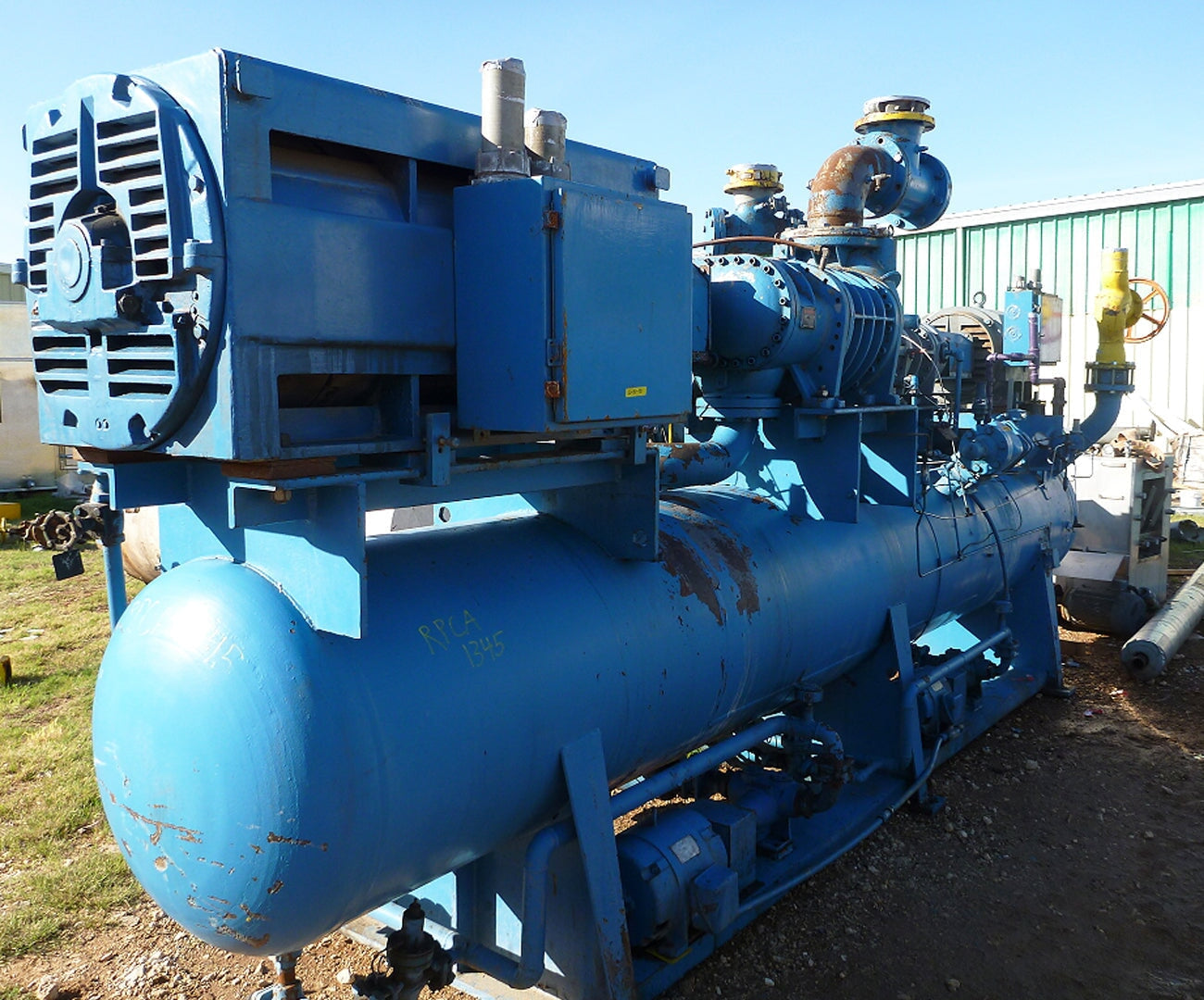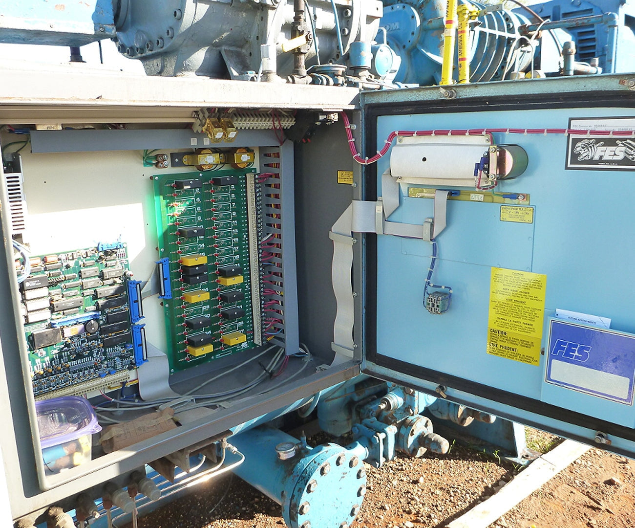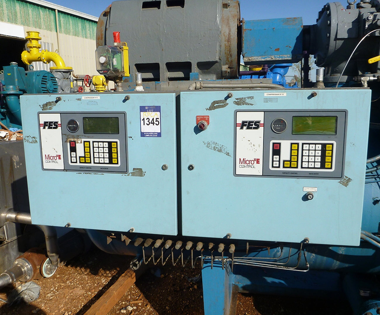 Paquete de compresor de doble tornillo FES / Mycom / Reco. Compresor mycom. Modelo: 250 lúmenes. S/N: 2577185. Conectado al motor GE. 800 CV, 460 V, 896 A, 3575 rpm. Compresor reco. Modelo: 200 LG-MX. S/N: 2012051. Adjunto al motor Toshiba. 350 CV, 460 V, 300 A, 3540 rpm. Montado en tanque común con controles Micro IIE.