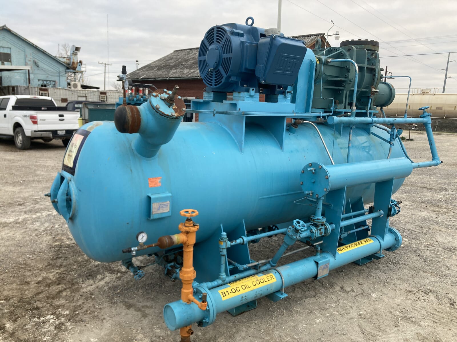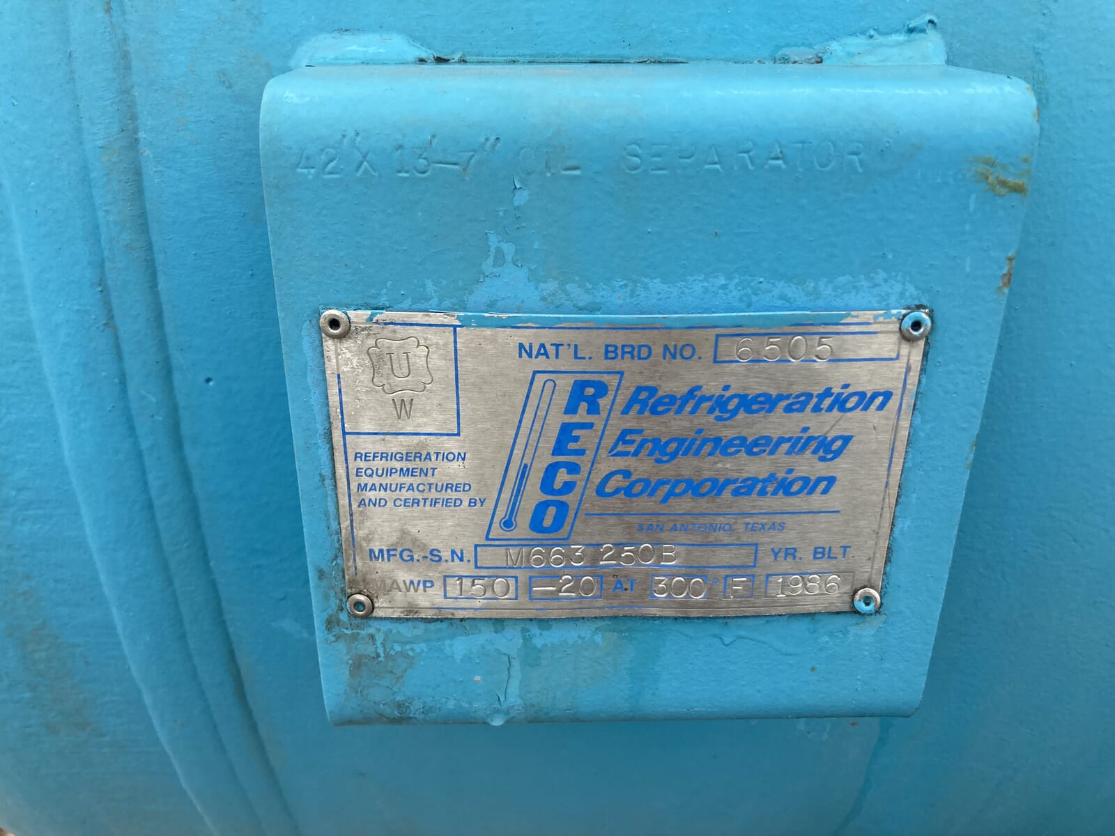 Falta el compresor del compresor de tornillo Frick. Motor WEG: Ph: 3, HP: 250, Voltios: 460, AMPS: 272, RPM: 3570, Nema: Nom Eff: 95.0%, Código: F, Encl: ODP, Utilizable @ 208V. Separador de aceite de Refrigeration Engineering Corporation: Natl Brd No: 6505, Mfg Serial No: M663250B, MAWP: 150 -20 @ 300F Año de construcción: 1986. Tenía un compresor de tornillo Frick: Modelo/Nº de serie: GDSH283L004V, Velocidad máxima Rpm: 3600, Max Prensa de diseño PSIG: 362, relación 22-50.