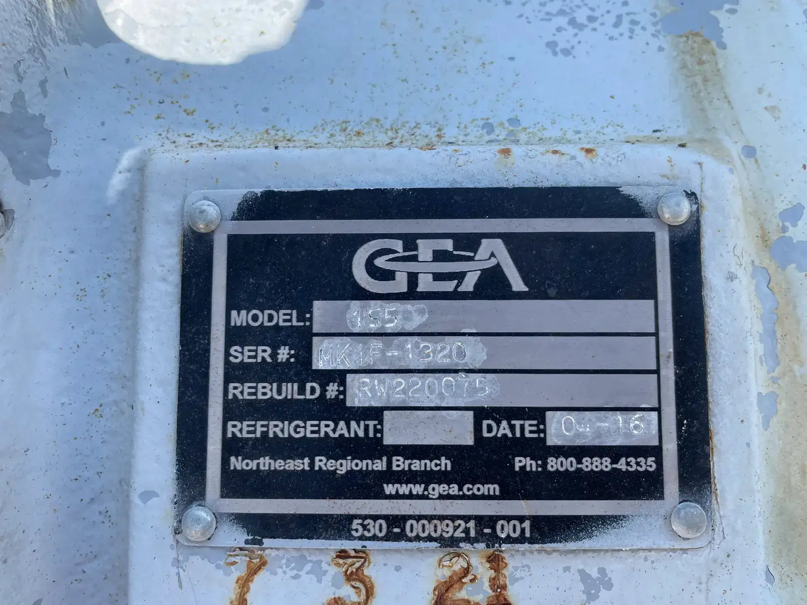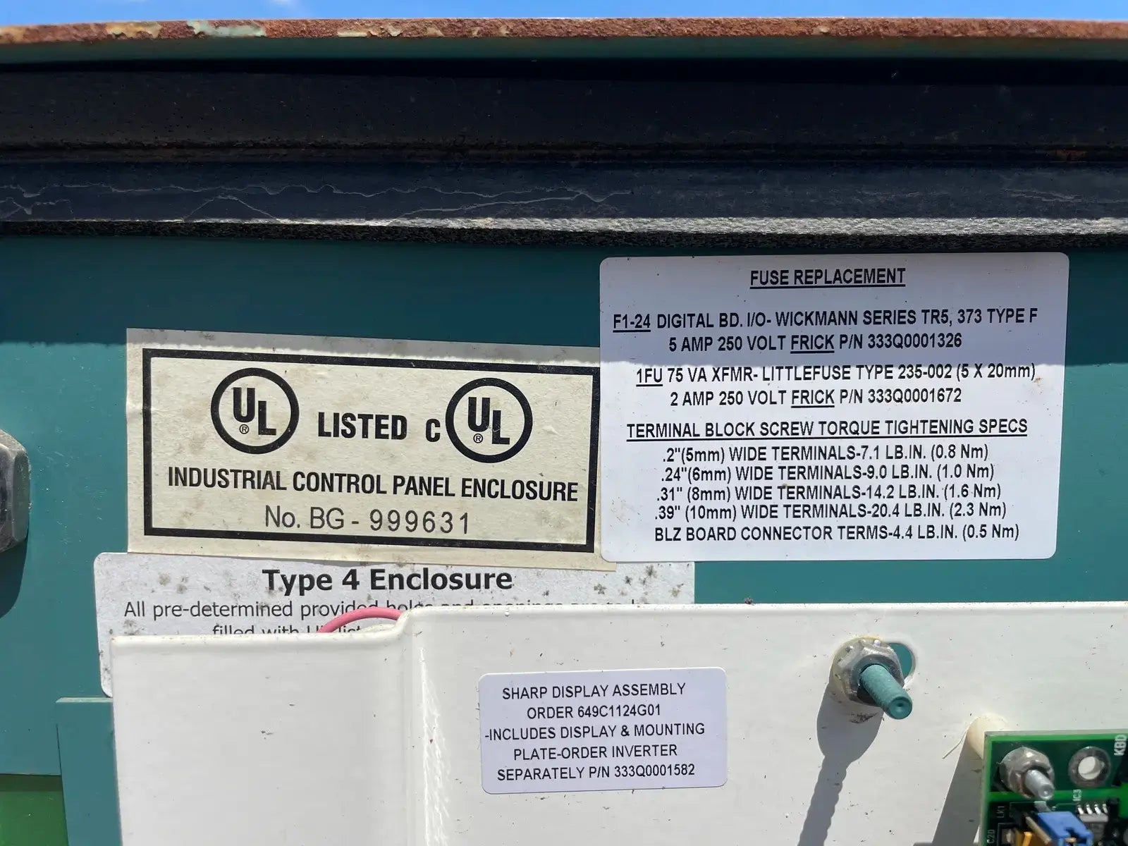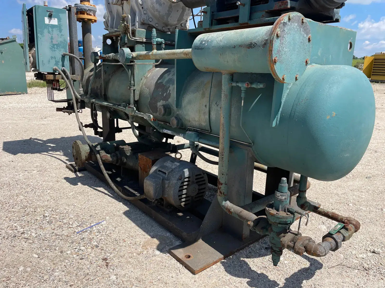 Paquete de compresor de tornillo rotativo Frick. Compresor de tornillo rotativo GEA: Modelo: 155, Número de serie: MK1F-1320, Número de reconstrucción: RW220075, Fecha de reconstrucción: 04-16. Panel de control cuántico de Frick. Separador de aceite certificado FES: Junta Nacional: 5076. Presión máxima de trabajo permitida: 250 PSIG a 200 F. Temperatura mínima del metal de diseño: -20 F a 250 PSI. Número de serie FES: 900292. Año de construcción: 1990. Motor eléctrico Marathon: HP: 150, Hz: 60, Voltios: 460, PH: 3, FLA: 163, RPM: 3575, Bastidor: 405TS.