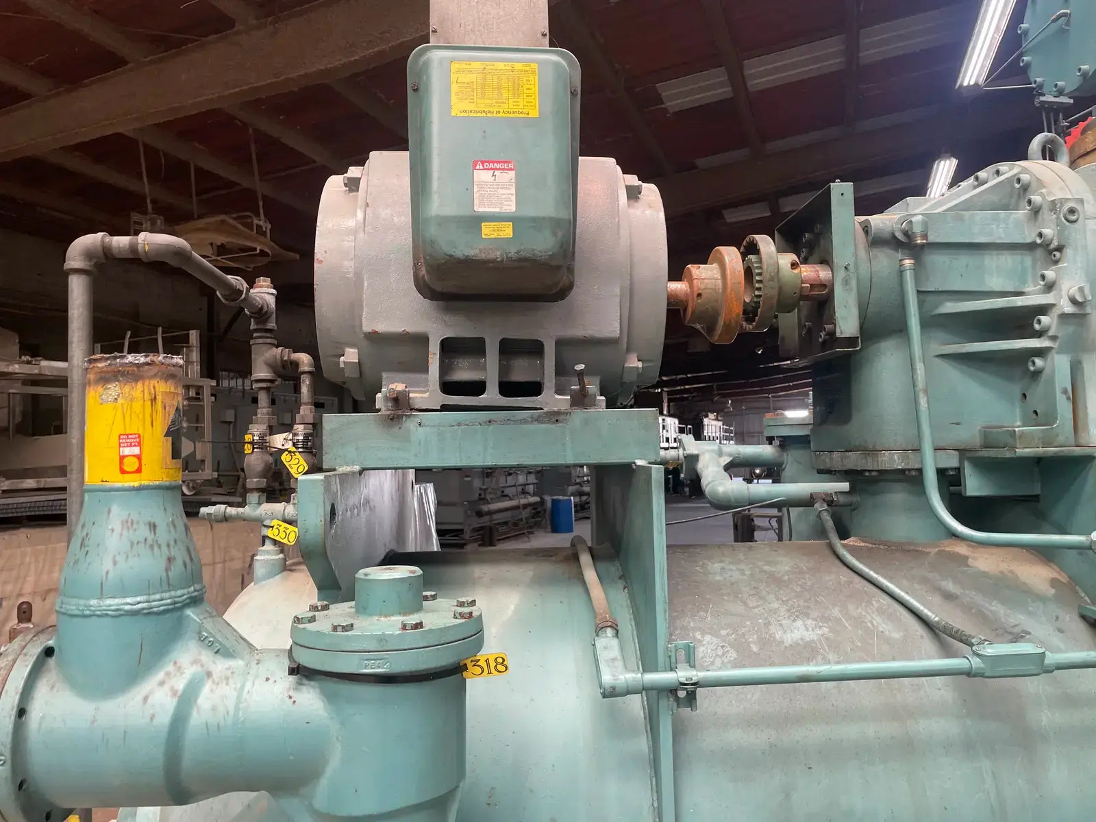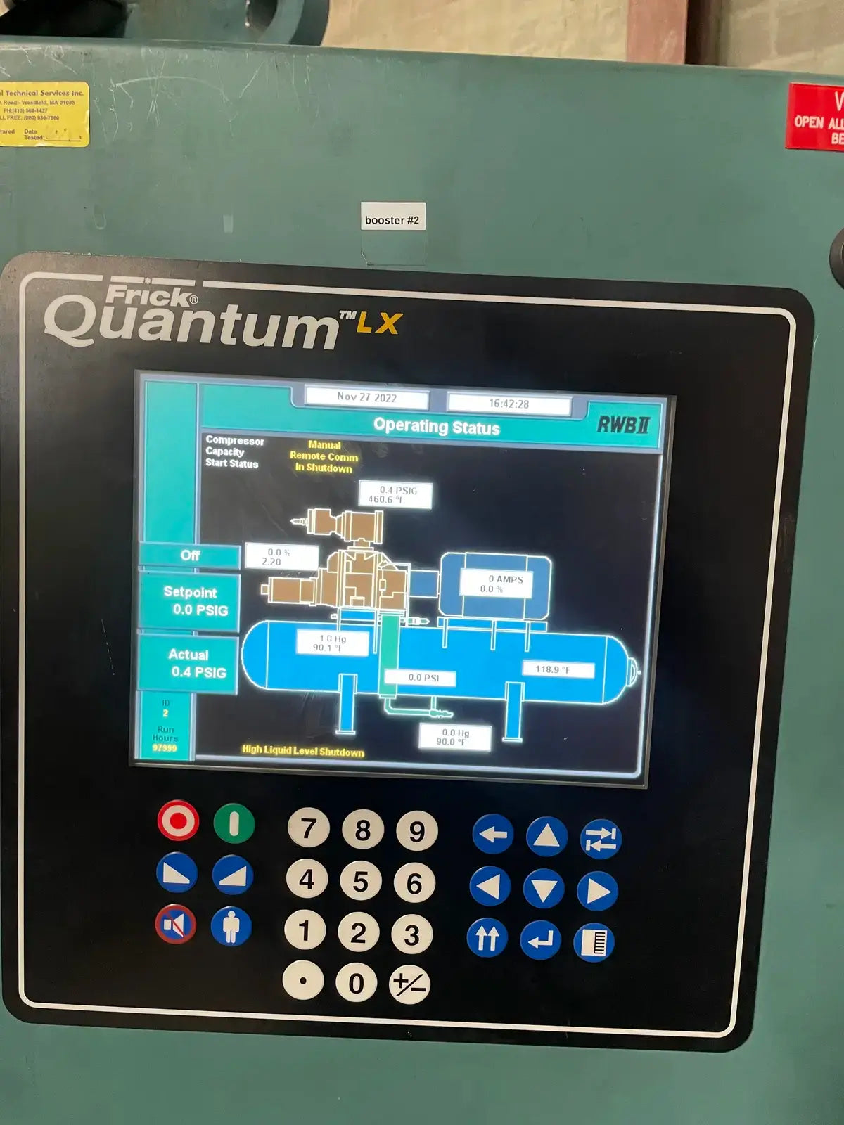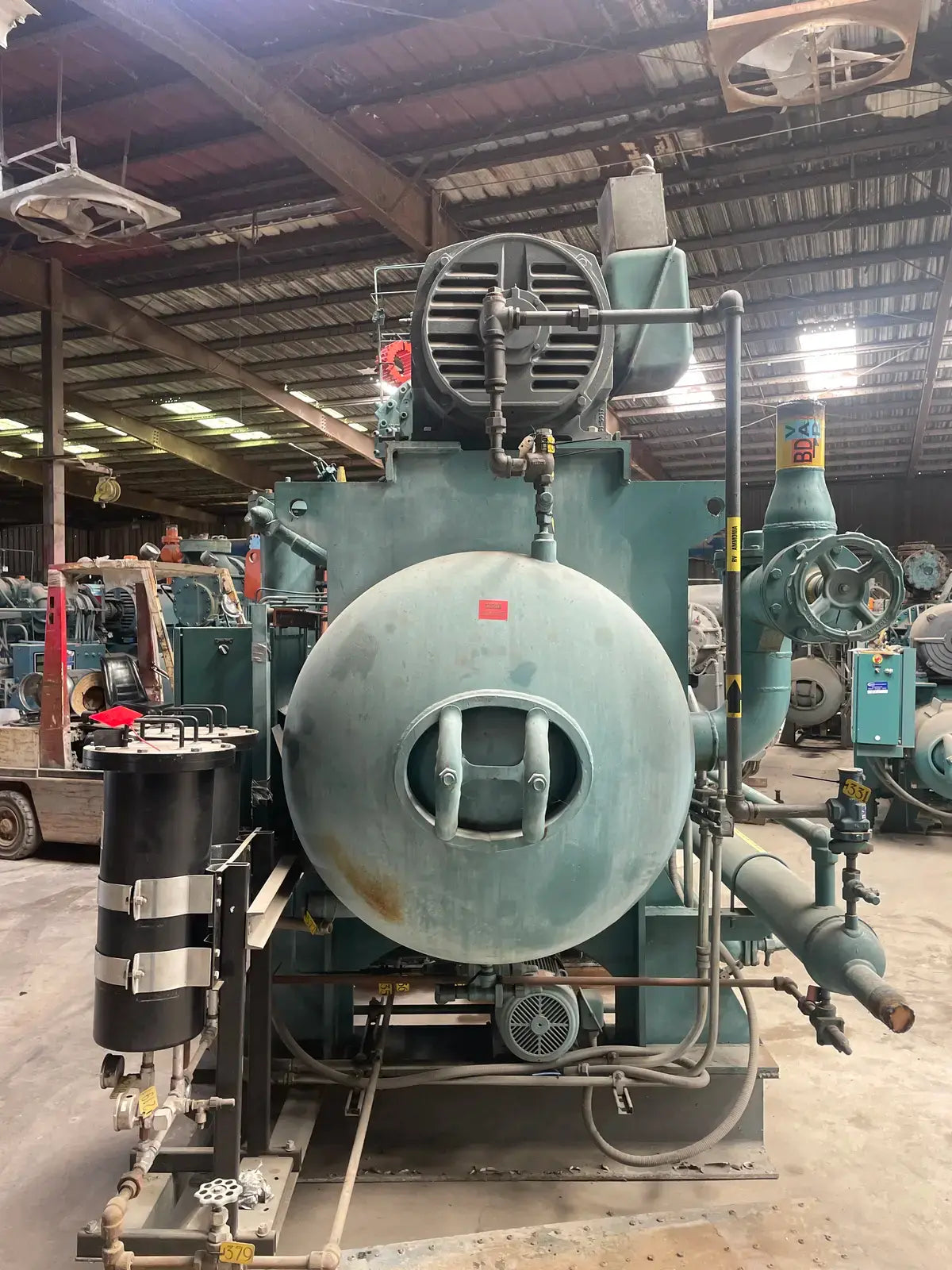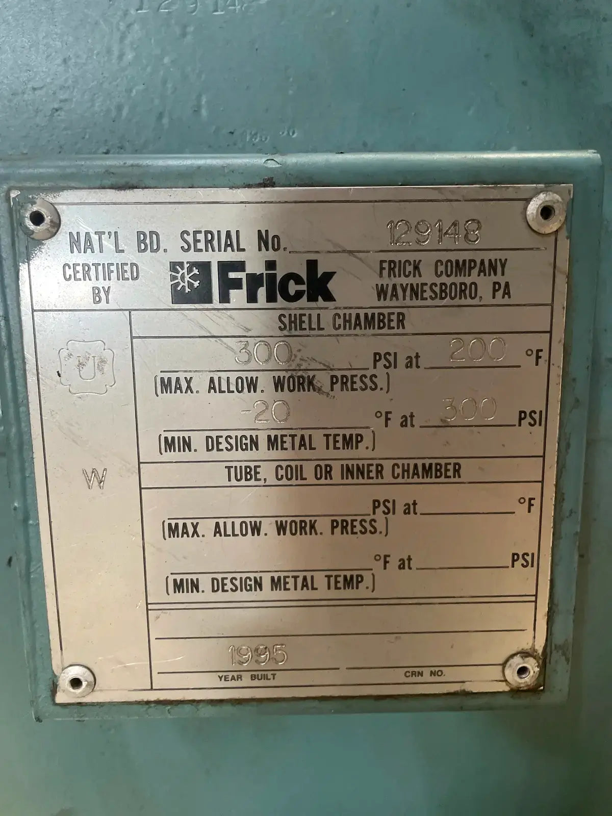Paquete de compresor de tornillo rotativo Frick RWB-II-316B. Tornillo desnudo Frick - Modelo: TDSH283S. Número de serie: 1609C. Refrigerante: R717/R22. Relación de volumen: 2,2-5,0. Velocidad máxima RPM: 3600. Presión de diseño: 350 psig. Año de fabricación: 1995. Paquete Frick - Modelo: RWB II 316B. Número de serie: S0294PFMFT0AA03. Orden de venta de Frick: 2809280100. Refrigerante: R-717. Presión máxima de diseño: 300 PSIG. Motor eléctrico Ram Industries - HP: 200, RPM: 3565, Voltios: 230/460. Hz: 60, Ph: 3, Marco: 444TS. Separador de aceite certificado: Junta Nacional: 129148, MAWP: 300 PSI @ 200 F. MDMT: -20 F @ 300 PSI. Panel de control Frick Quantum LX.