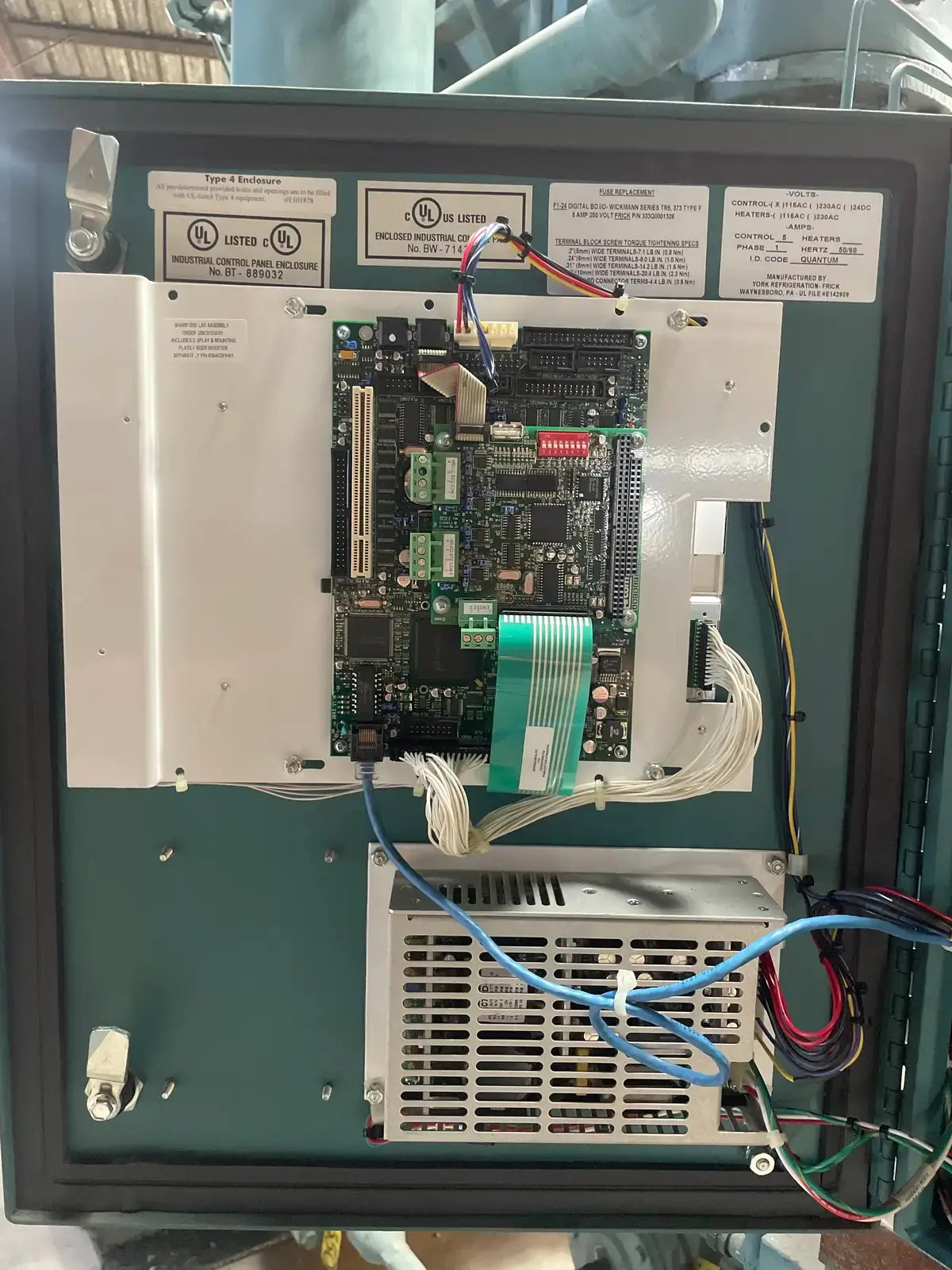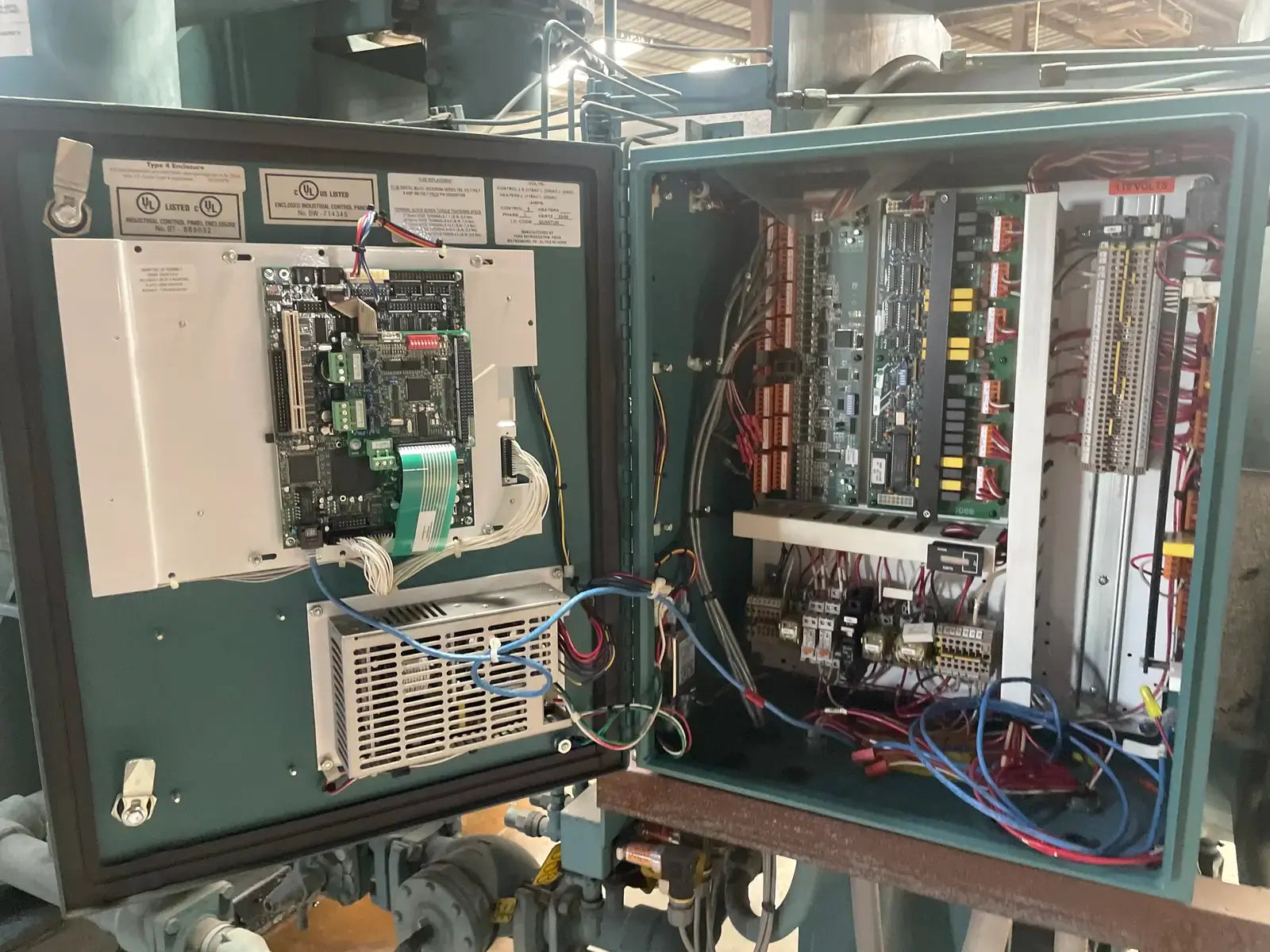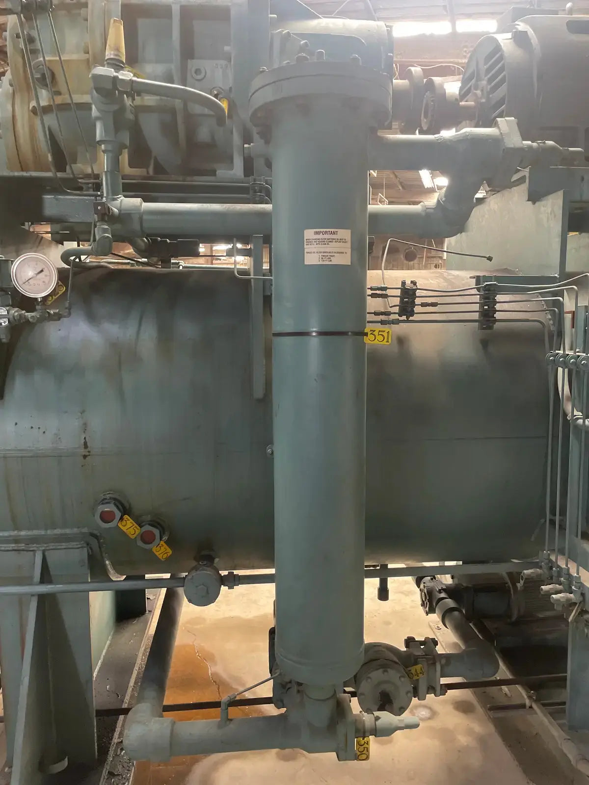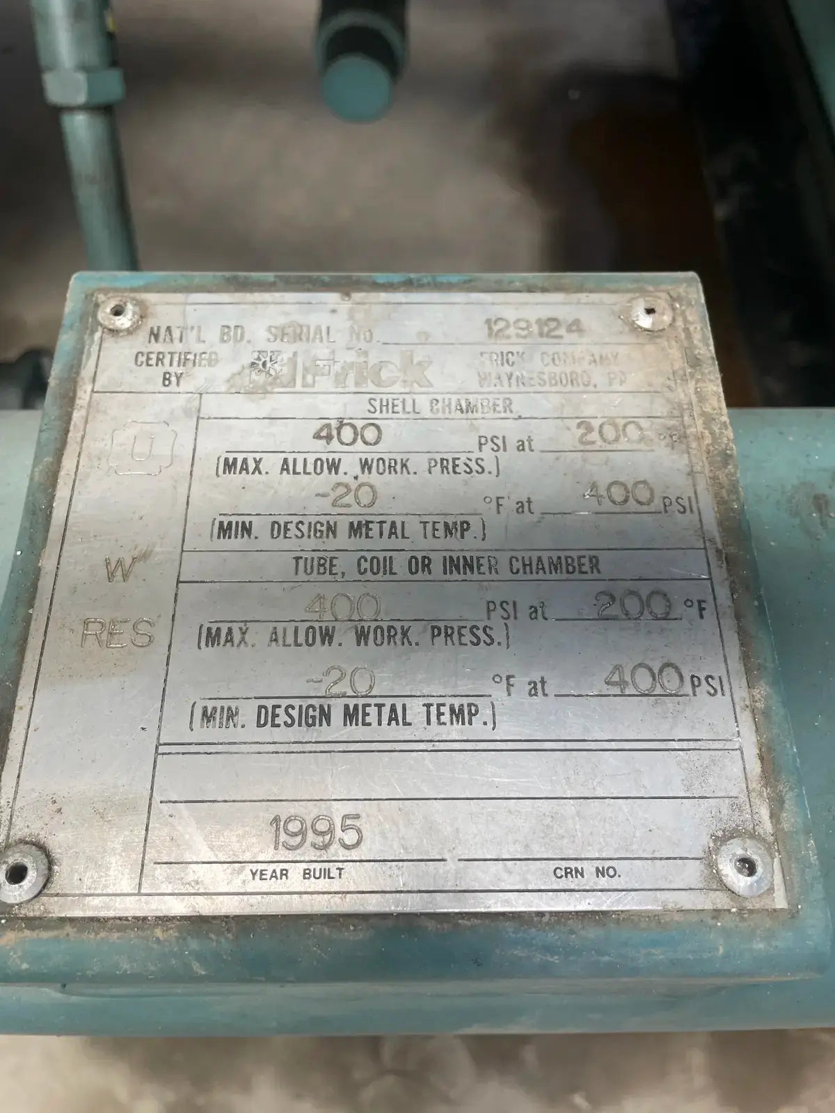 Paquete de compresor de tornillo rotativo Frick RWB-II-316B. Tornillo desnudo Frick - Modelo: TDSH283S. Número de serie: 1609C. Refrigerante: R717/R22. Relación de volumen: 2,2-5,0. Velocidad máxima RPM: 3600. Presión de diseño: 350 psig. Año de fabricación: 1995. Paquete Frick - Modelo: RWB II 316B. Número de serie: S0294PFMFT0AA03. Orden de venta de Frick: 2809280100. Refrigerante: R-717. Presión máxima de diseño: 300 PSIG. Motor eléctrico Ram Industries - HP: 200, RPM: 3565, Voltios: 230/460. Hz: 60, Ph: 3, Marco: 444TS. Separador de aceite certificado: Junta Nacional: 129148, MAWP: 300 PSI @ 200 F. MDMT: -20 F @ 300 PSI. Panel de control Frick Quantum LX.