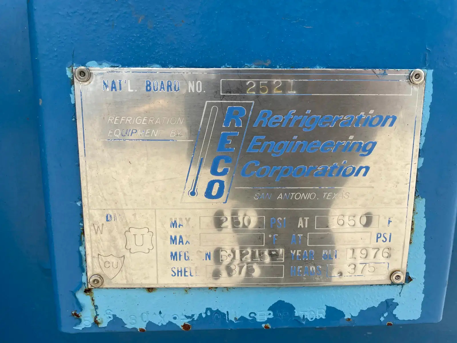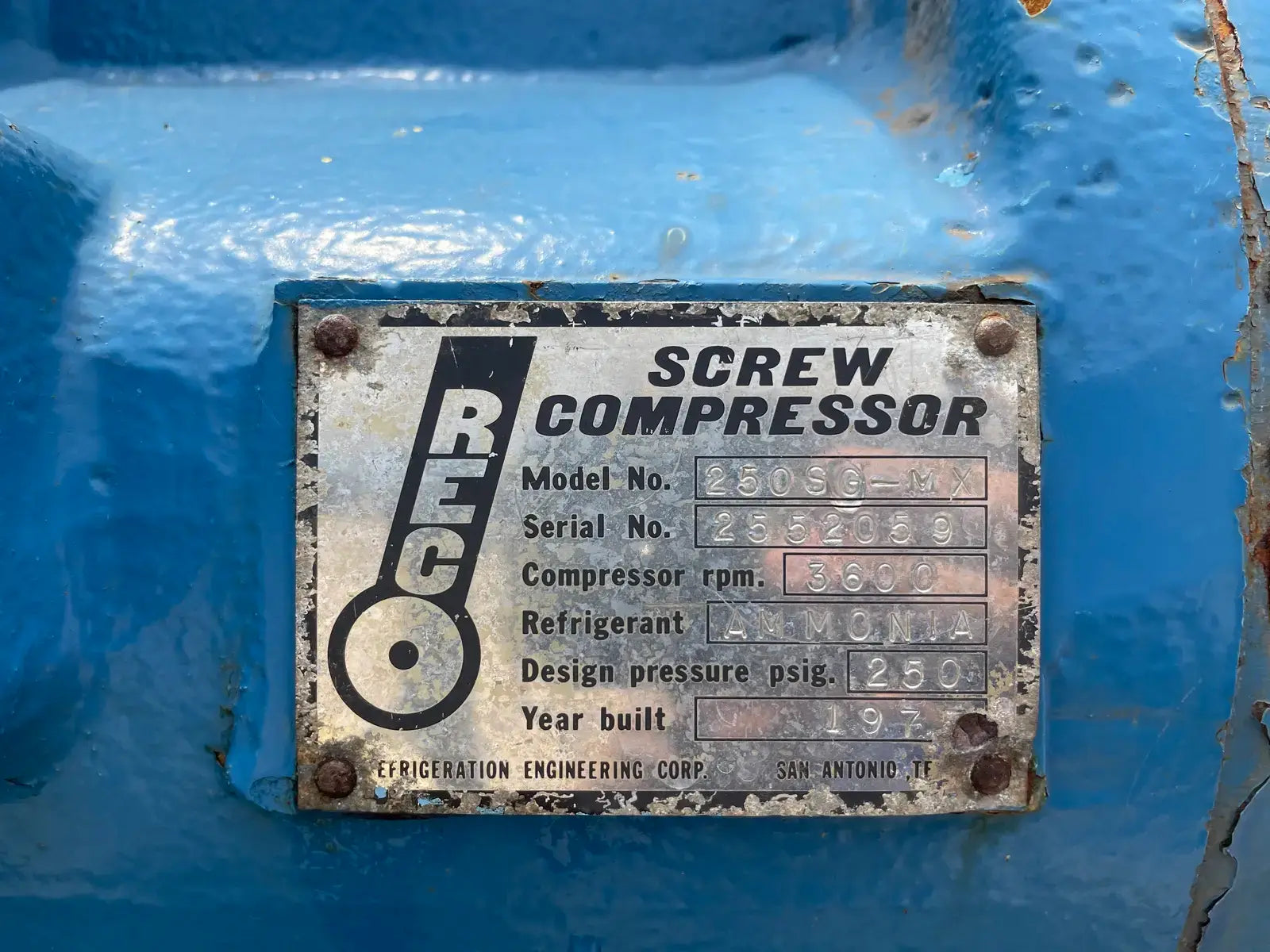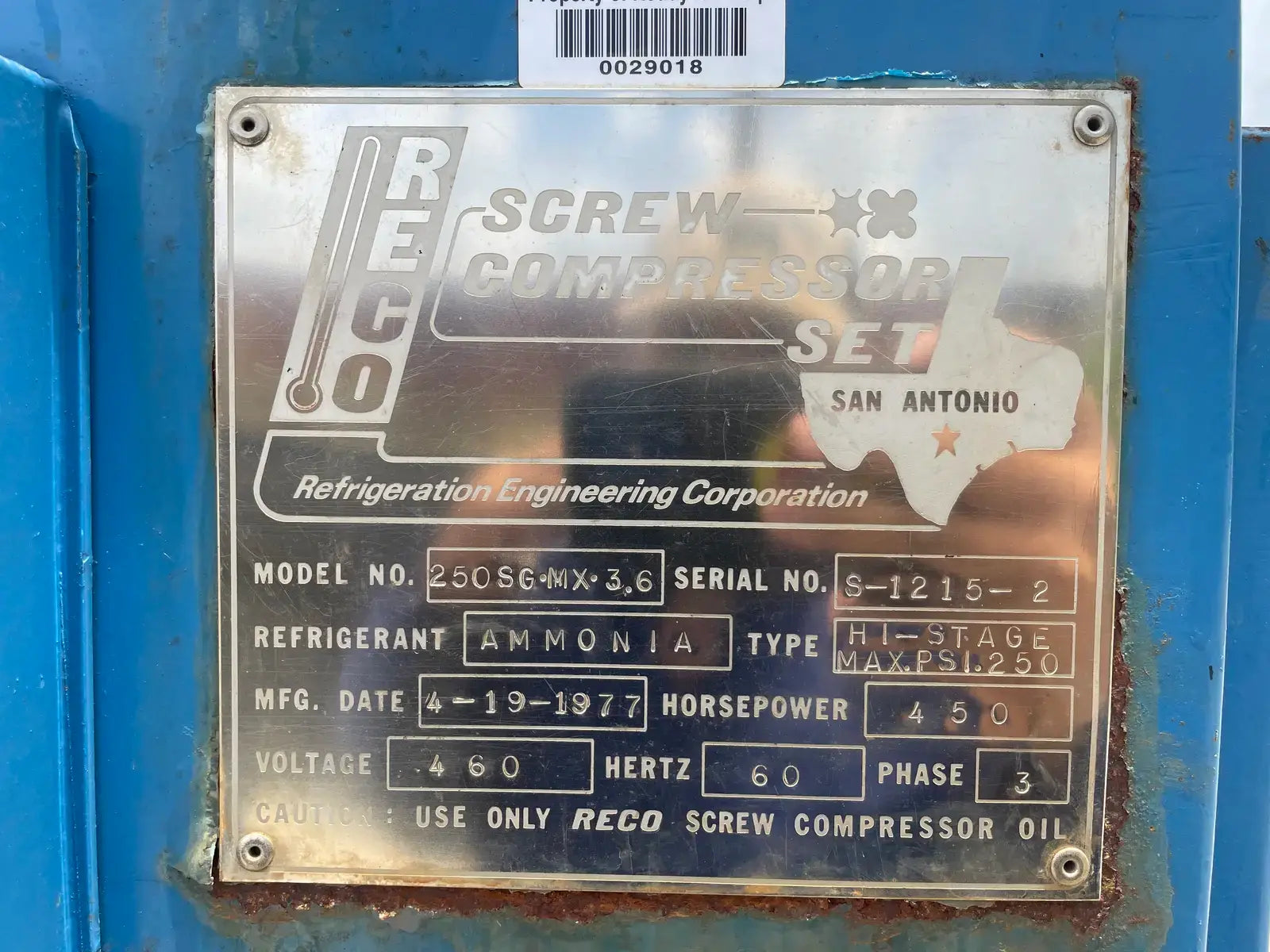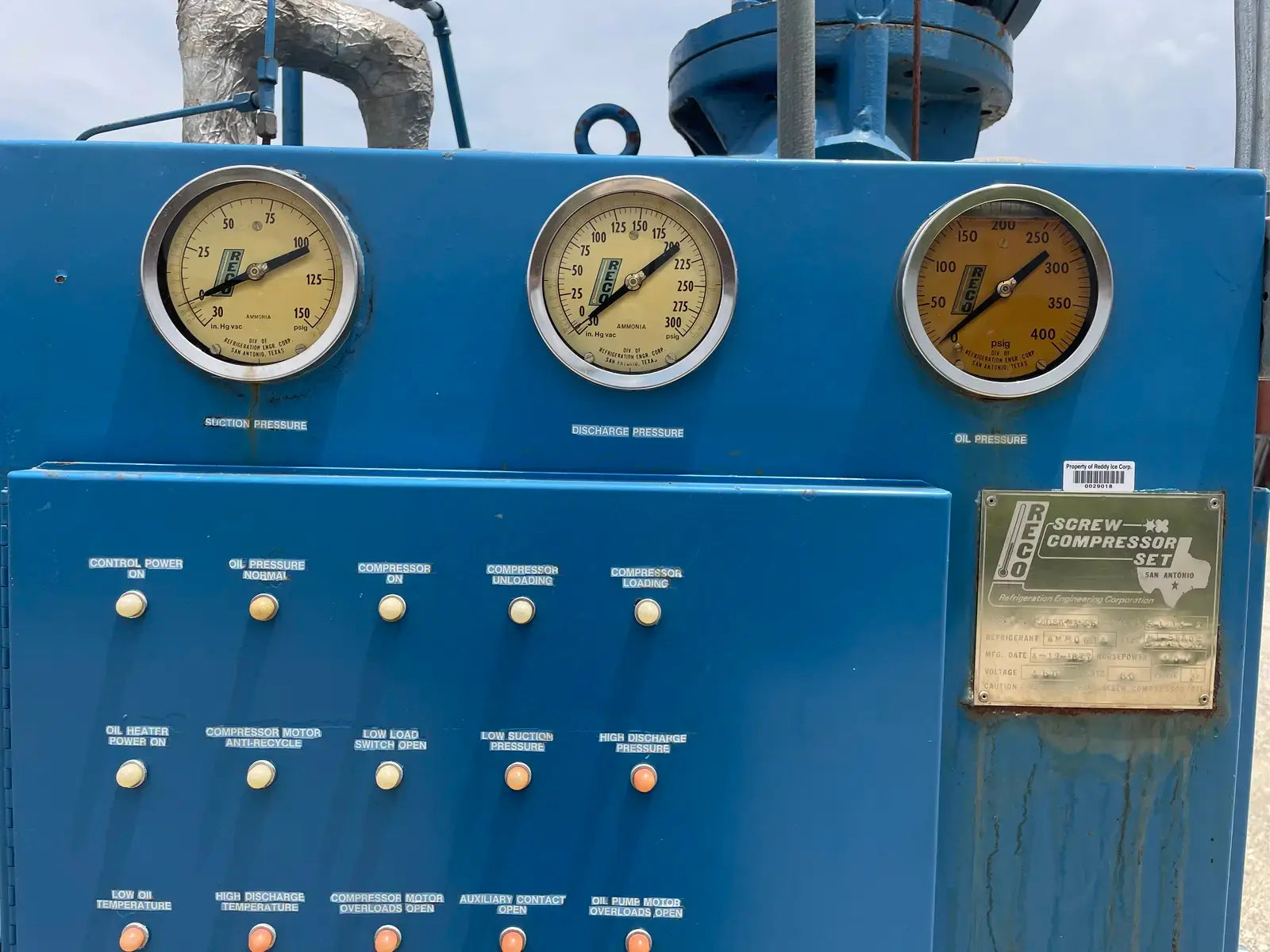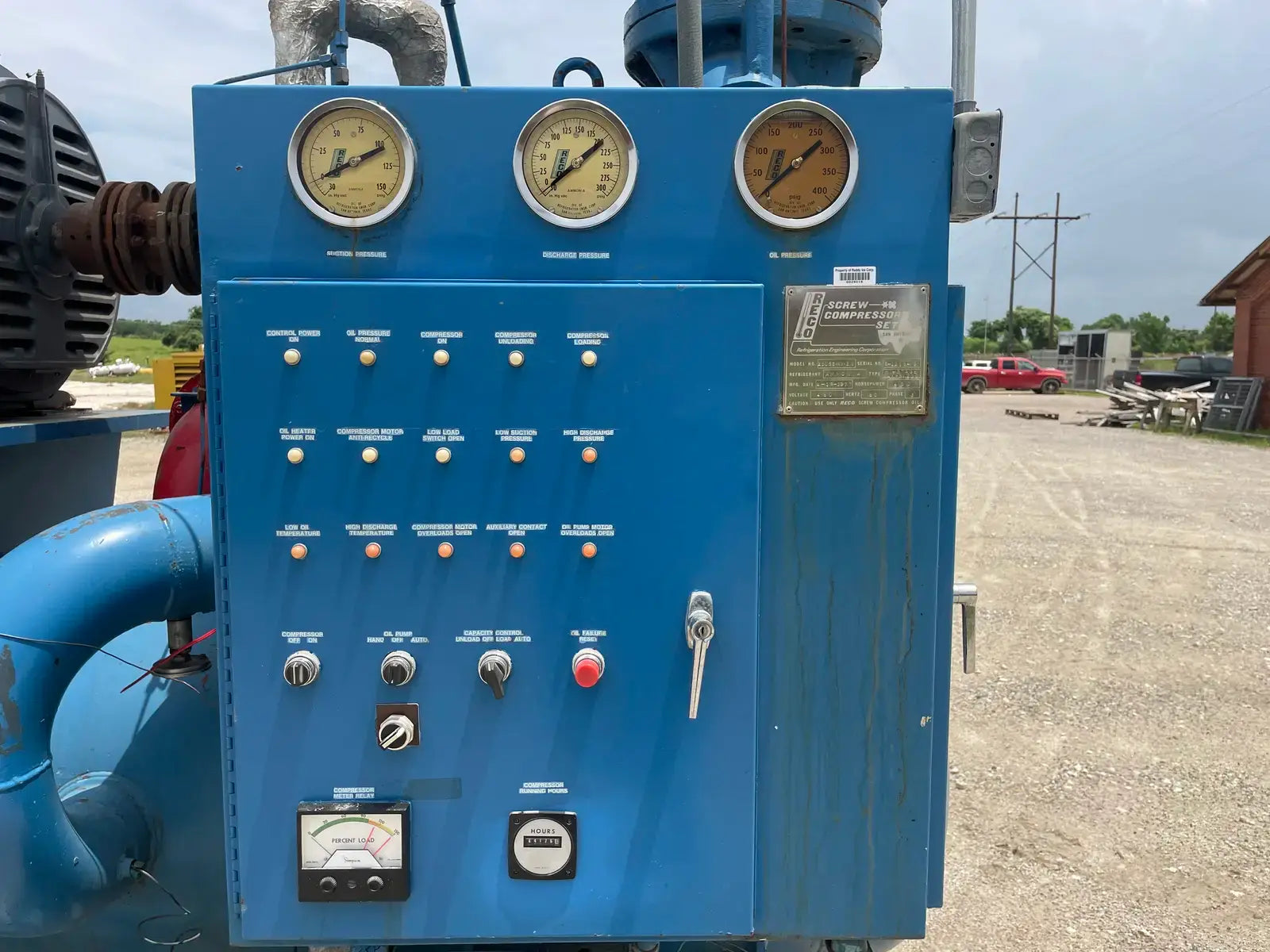 Paquete compresor de tornillo RECO. Modelo: 250SG-MX-3.6. Número de serie: S-1215-2. Refrigerante: Amoníaco. Tipo: Hi-Stage. PSIG máx.: 250. Fecha de fabricación: 1977. Caballos de fuerza: 450. Voltaje: 460. Hz: 60, Ph: 3. Compresor de tornillo desnudo rotativo Mycom. Modelo: 250-SG-MX. Número de serie: 2552059. RPM del compresor: 3600. Refrigerante: Amoníaco. Presión de diseño: 250 PSIG. Año de construcción: 1977. Separador de aceite RECO: Junta Nacional No: 2521. MDMT: 250 PSI @ 650 F. No. de serie Mfg: S12151. Año de construcción: 1976. Carcasa: .375. Cabeza: .375.