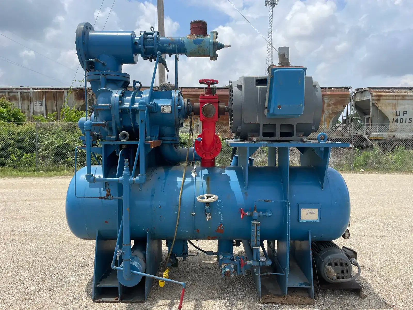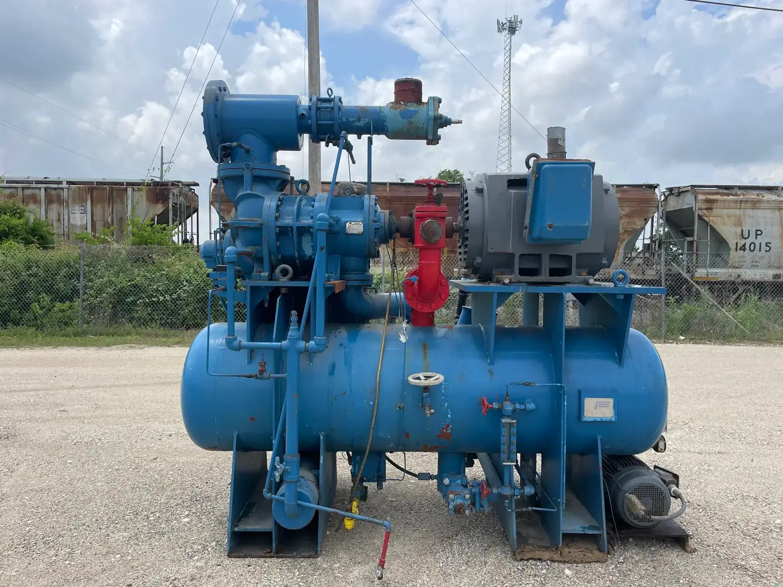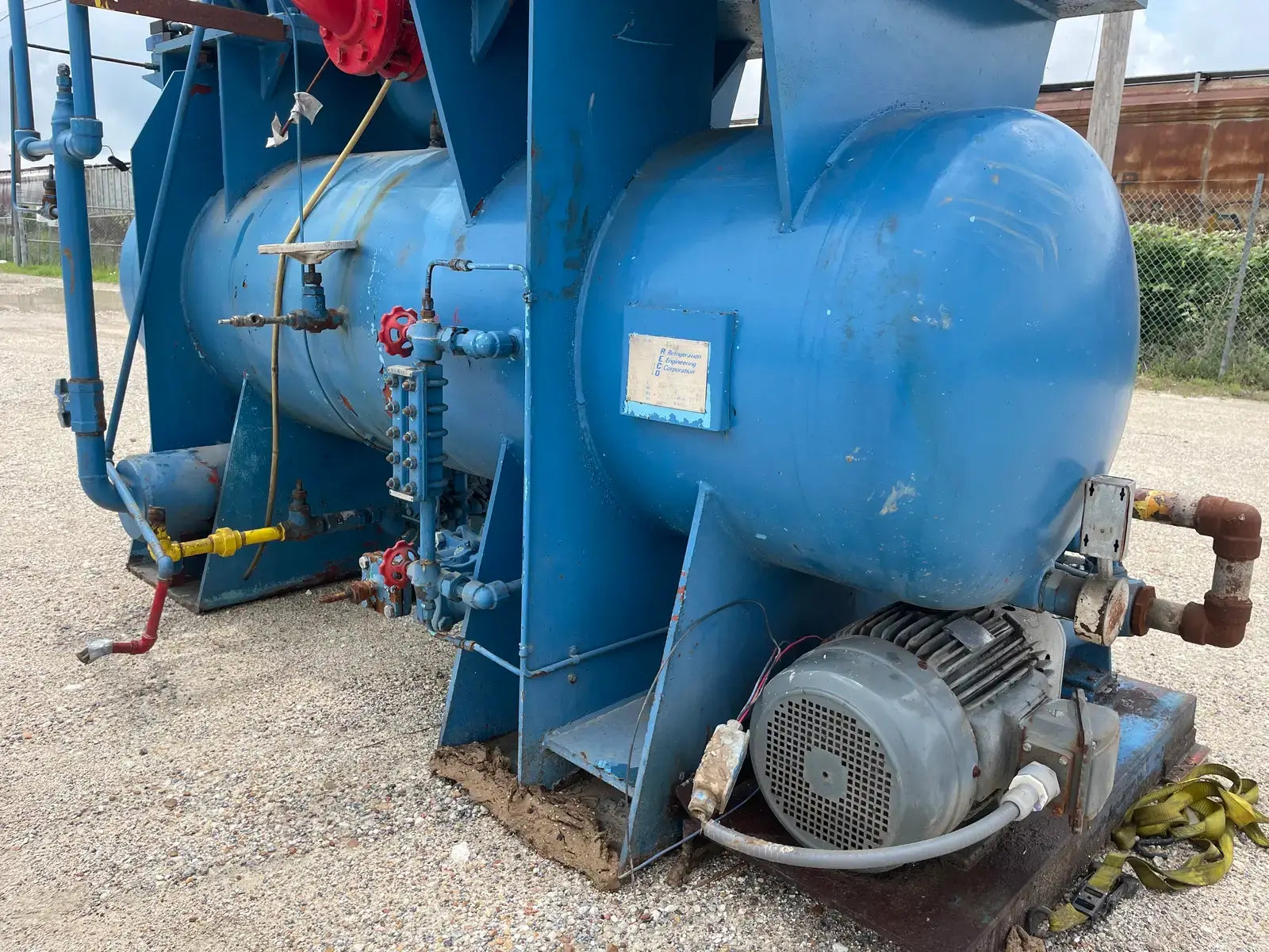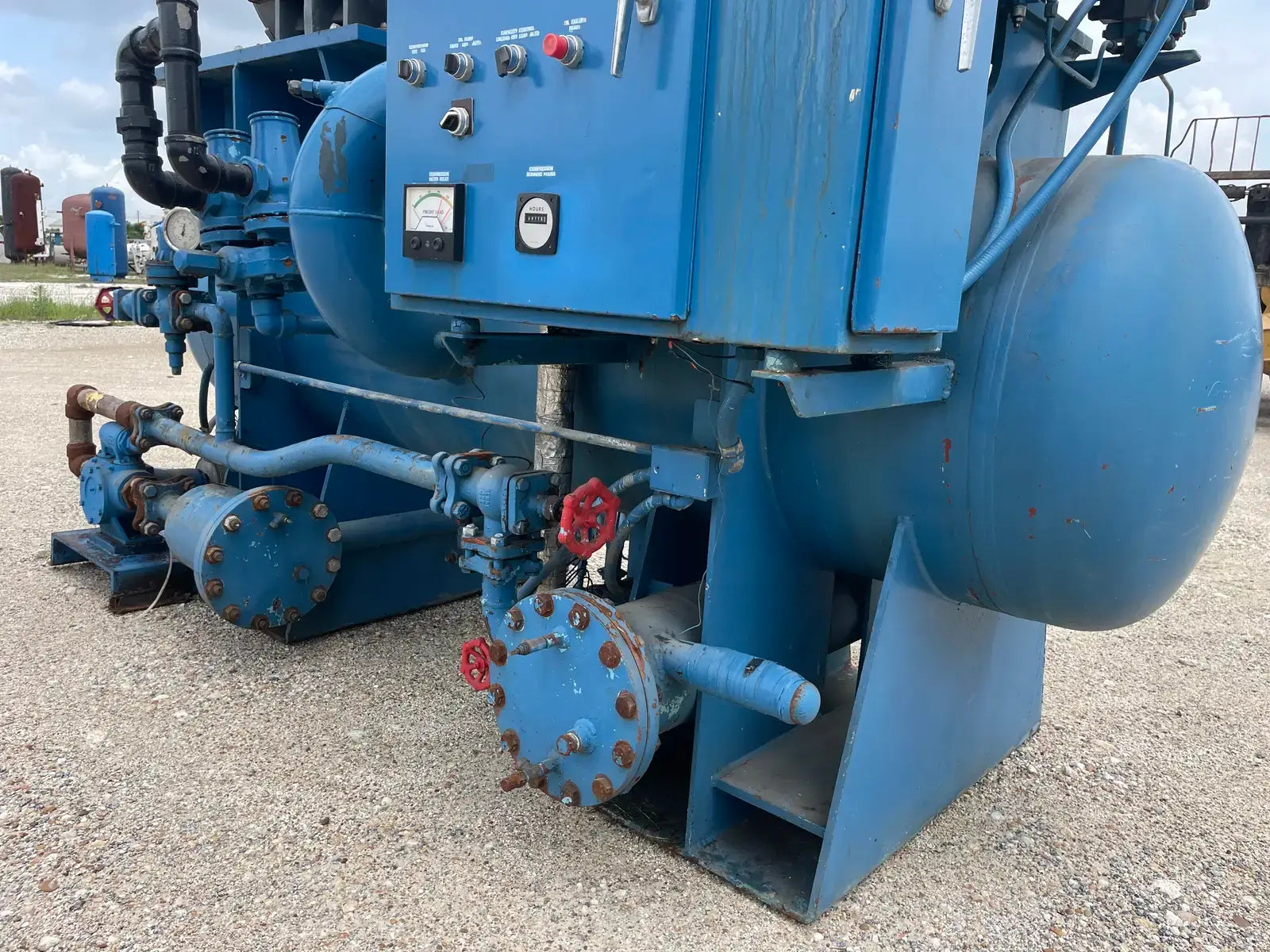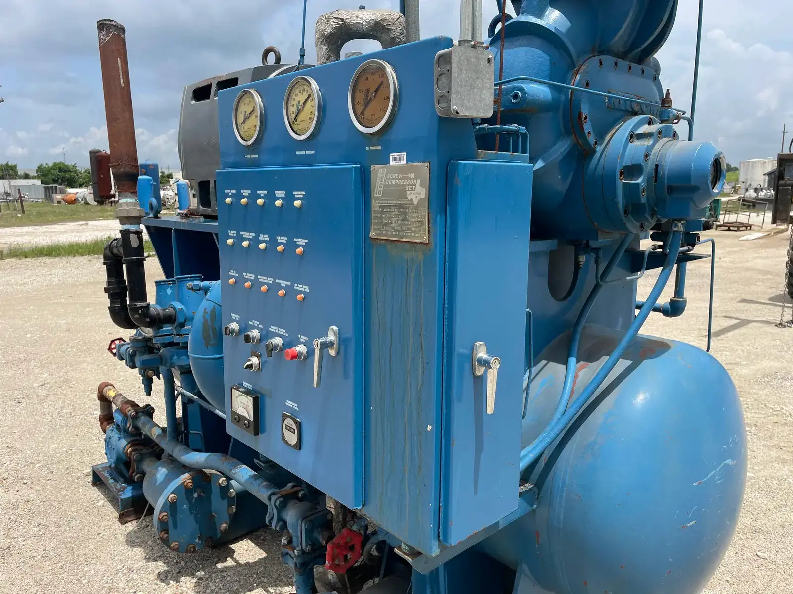 Paquete compresor de tornillo RECO. Modelo: 250SG-MX-3.6. Número de serie: S-1215-2. Refrigerante: Amoníaco. Tipo: Hi-Stage. PSIG máx.: 250. Fecha de fabricación: 1977. Caballos de fuerza: 450. Voltaje: 460. Hz: 60, Ph: 3. Compresor de tornillo desnudo rotativo Mycom. Modelo: 250-SG-MX. Número de serie: 2552059. RPM del compresor: 3600. Refrigerante: Amoníaco. Presión de diseño: 250 PSIG. Año de construcción: 1977. Separador de aceite RECO: Junta Nacional No: 2521. MDMT: 250 PSI @ 650 F. No. de serie Mfg: S12151. Año de construcción: 1976. Carcasa: .375. Cabeza: .375.