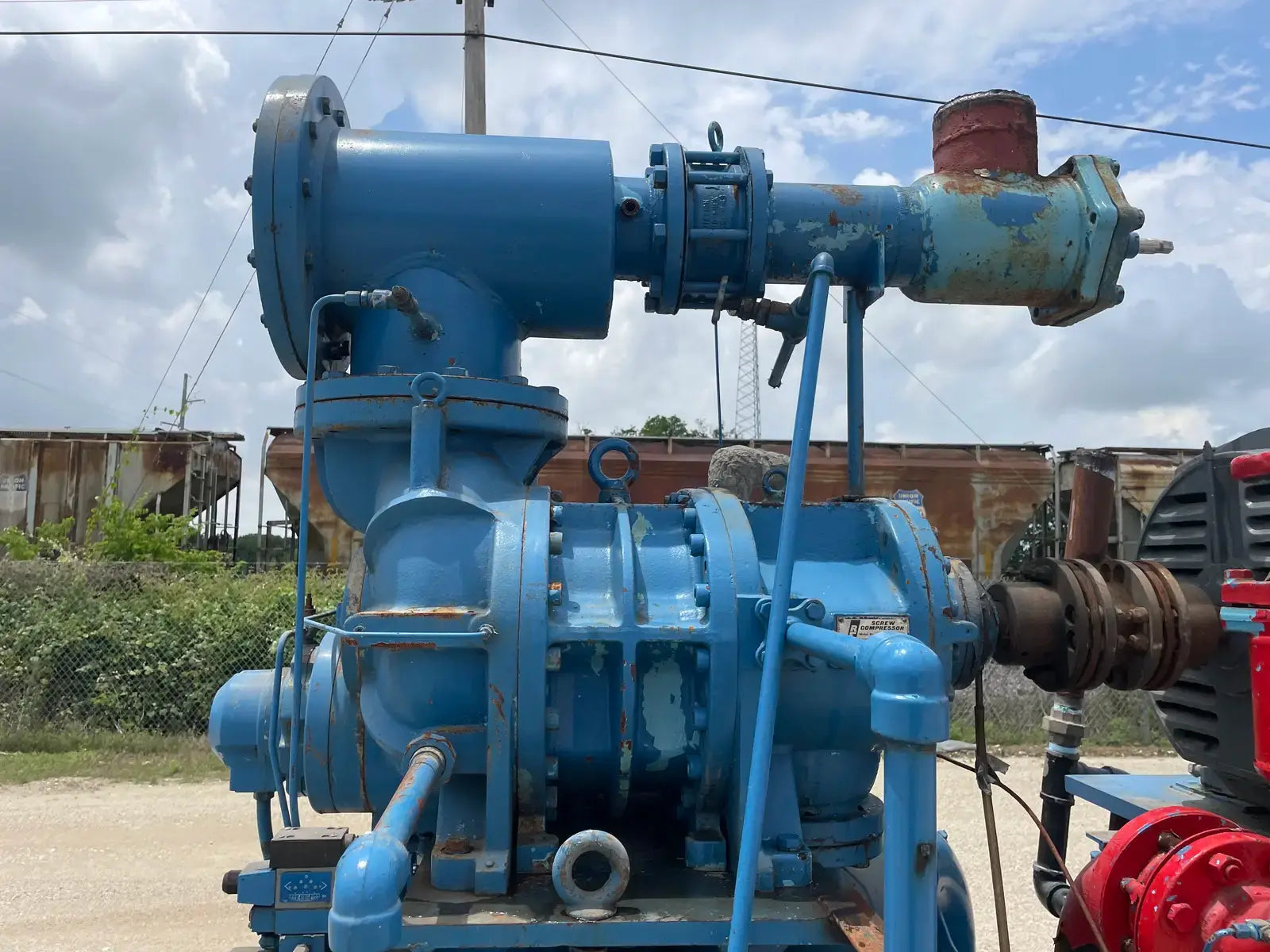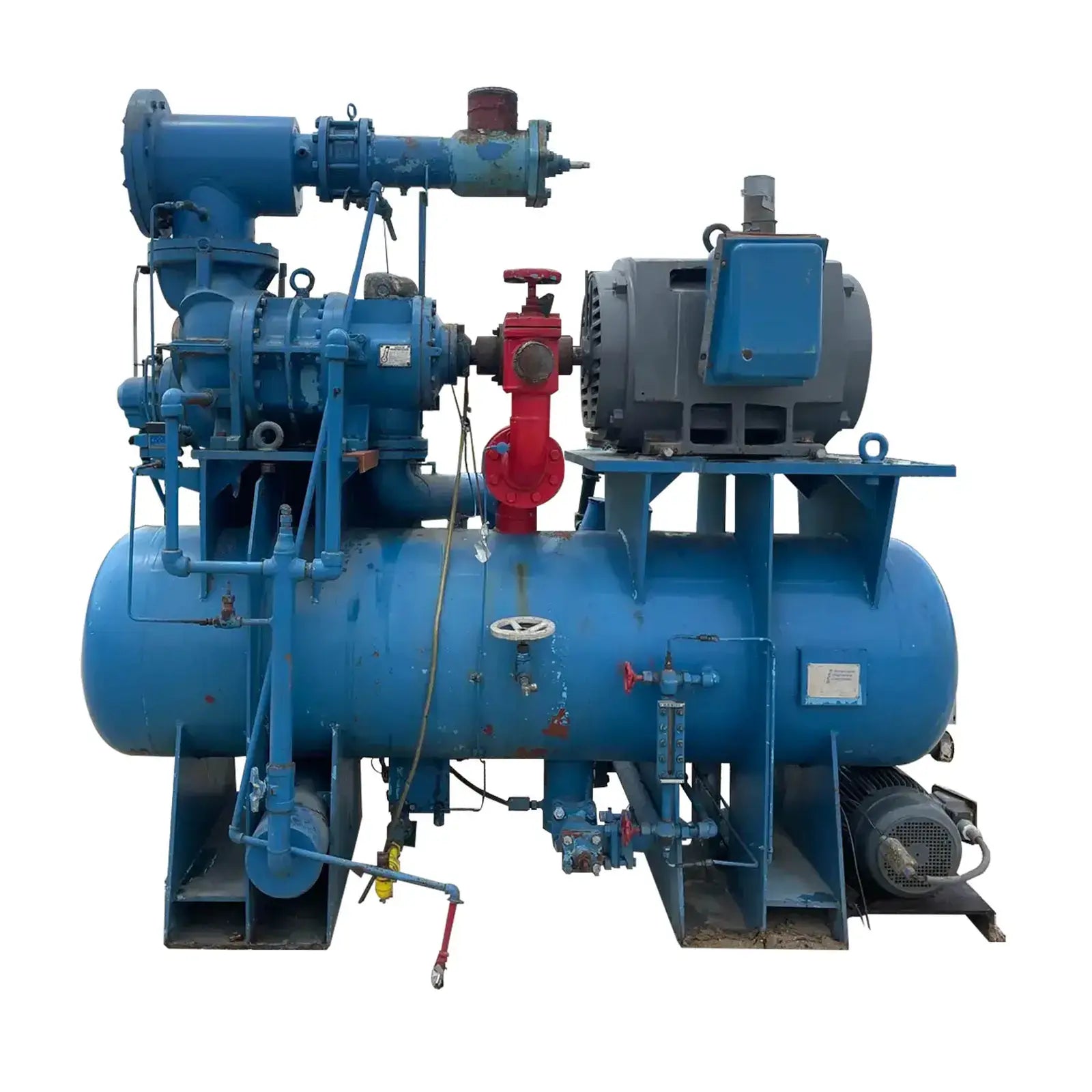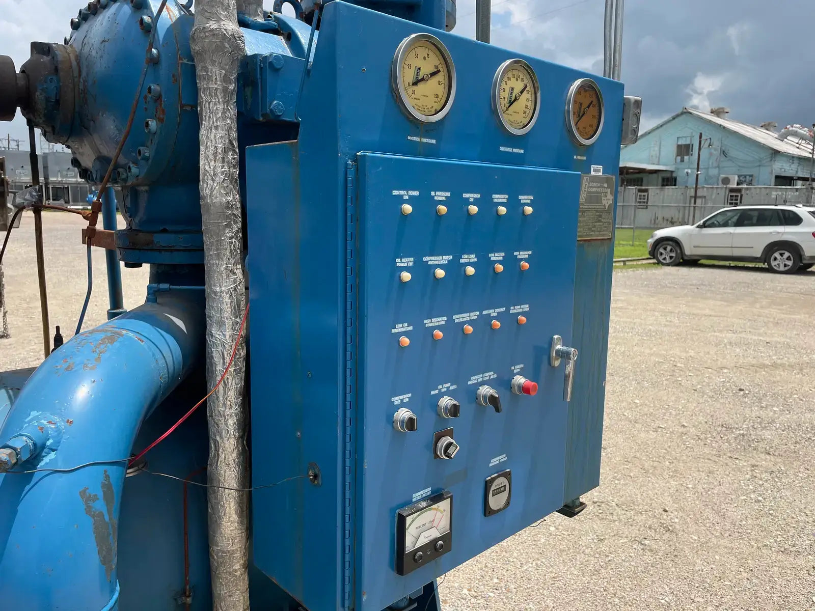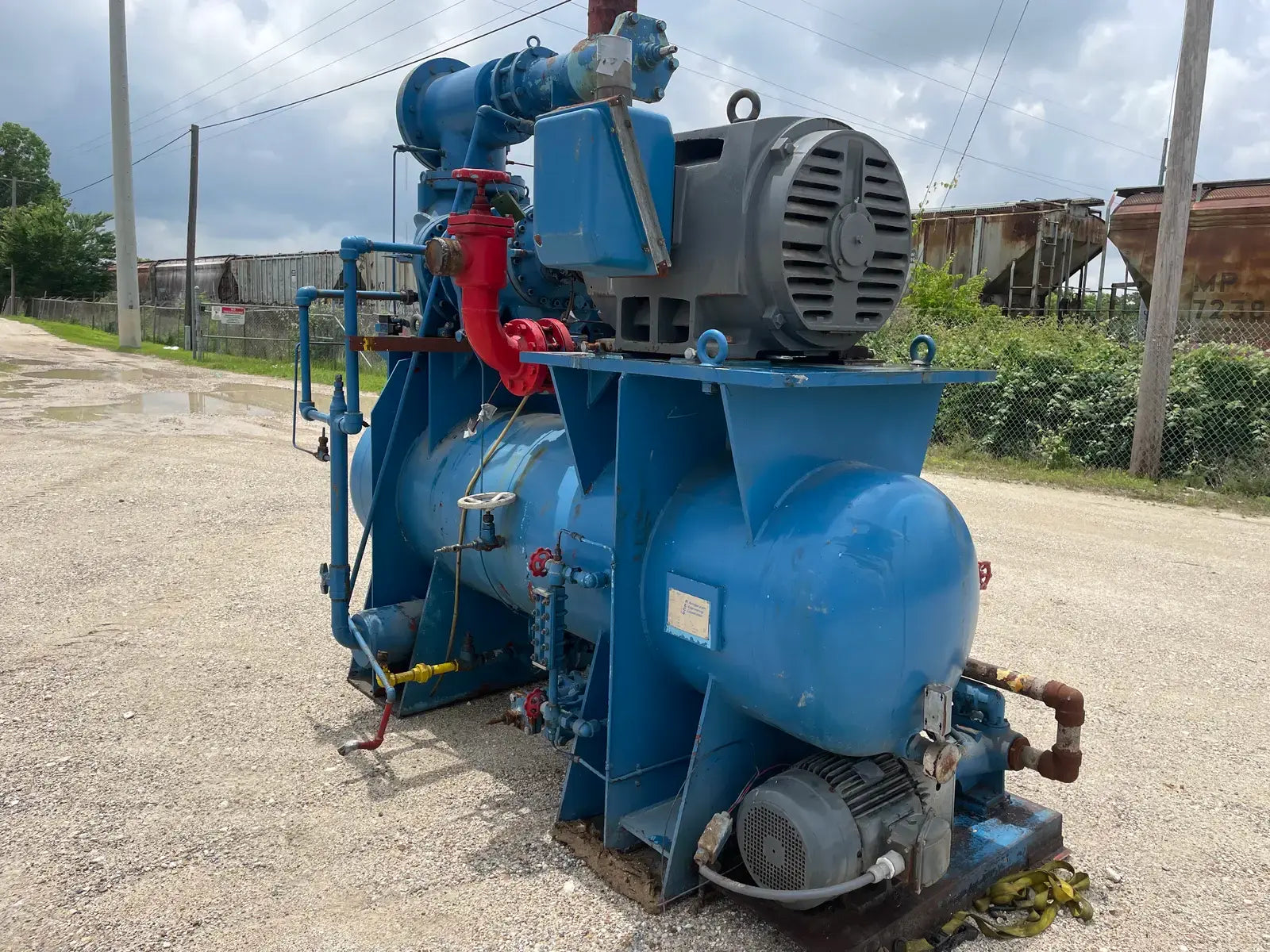 Paquete compresor de tornillo RECO. Modelo: 250SG-MX-3.6. Número de serie: S-1215-2. Refrigerante: Amoníaco. Tipo: Hi-Stage. PSIG máx.: 250. Fecha de fabricación: 1977. Caballos de fuerza: 450. Voltaje: 460. Hz: 60, Ph: 3. Compresor de tornillo desnudo rotativo Mycom. Modelo: 250-SG-MX. Número de serie: 2552059. RPM del compresor: 3600. Refrigerante: Amoníaco. Presión de diseño: 250 PSIG. Año de construcción: 1977. Separador de aceite RECO: Junta Nacional No: 2521. MDMT: 250 PSI @ 650 F. No. de serie Mfg: S12151. Año de construcción: 1976. Carcasa: .375. Cabeza: .375.