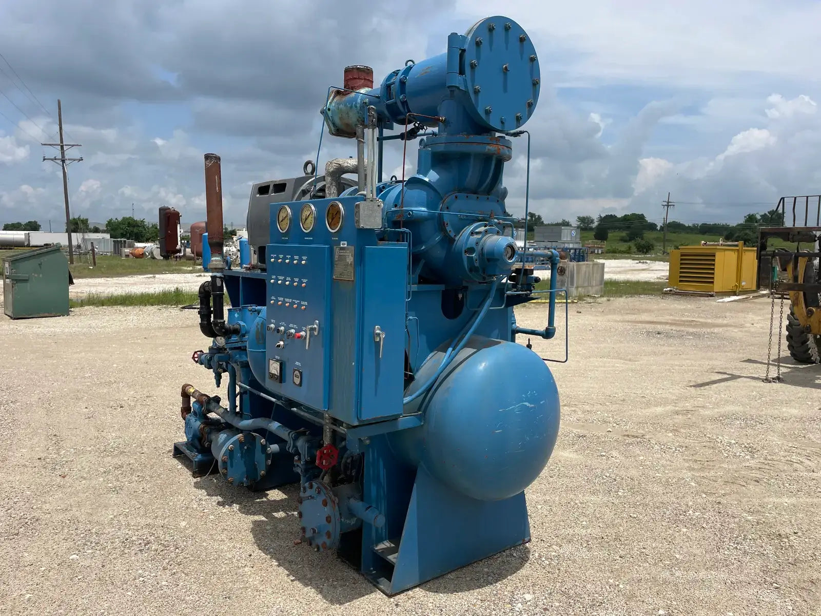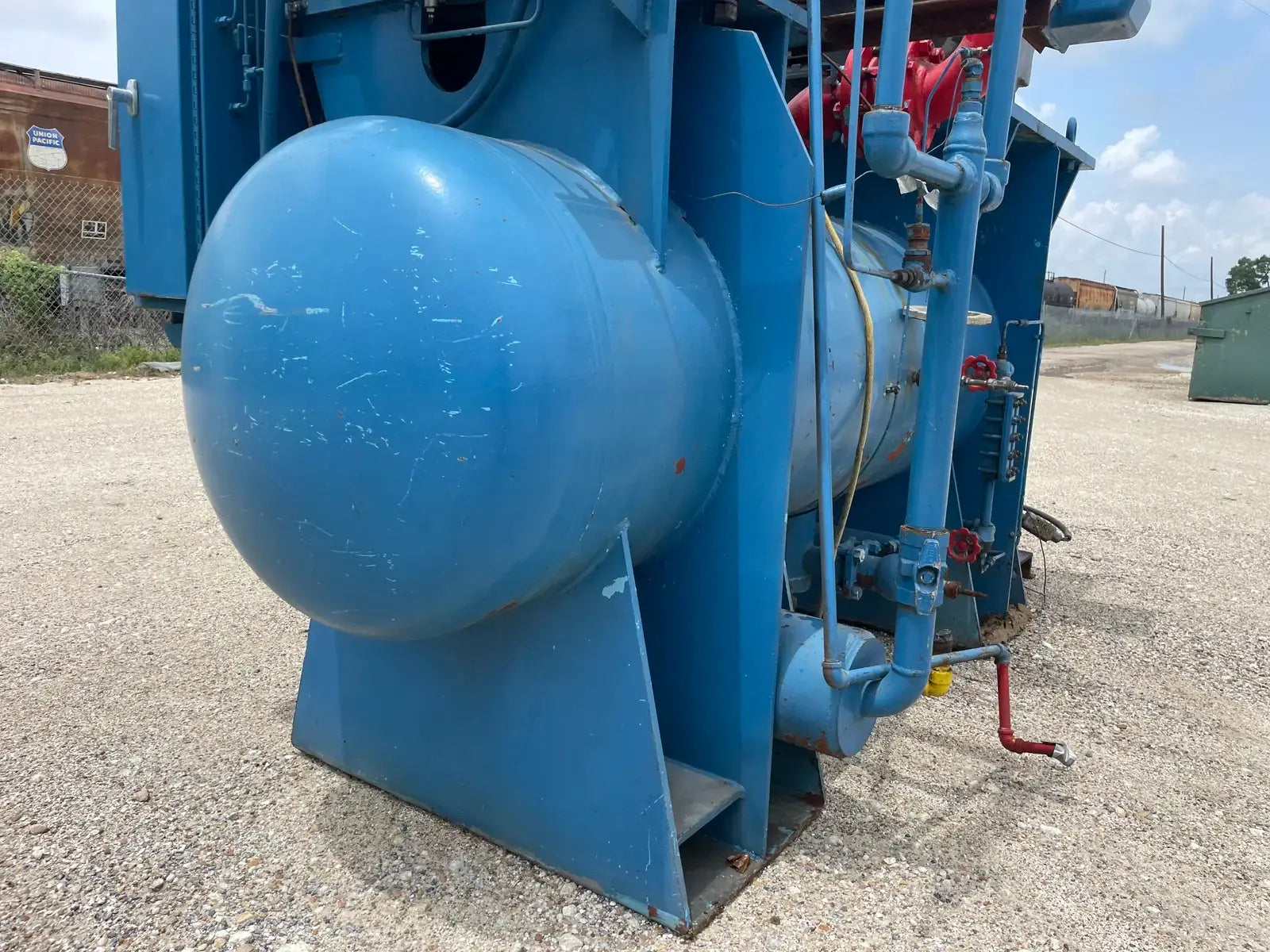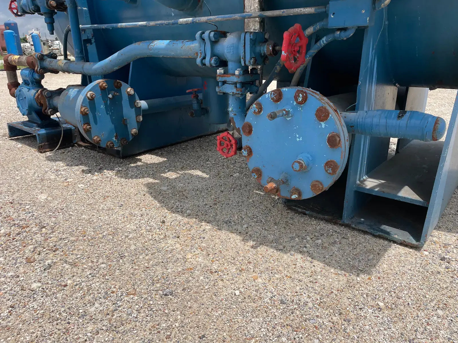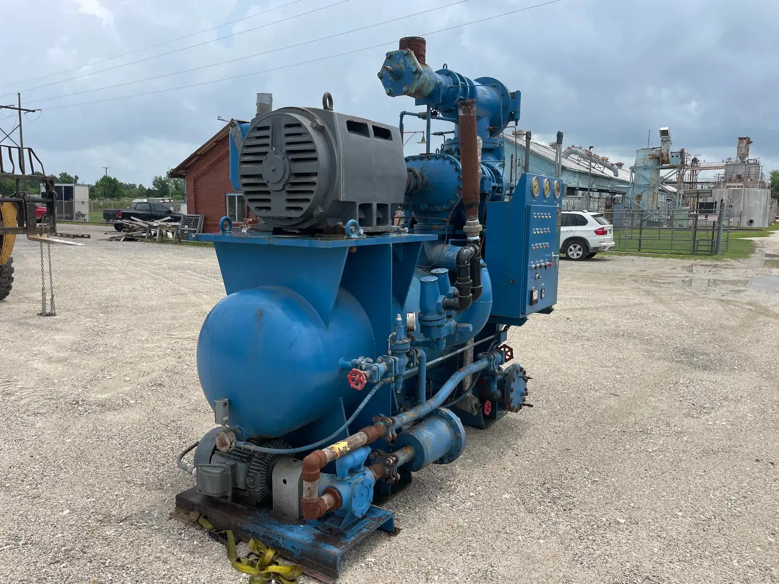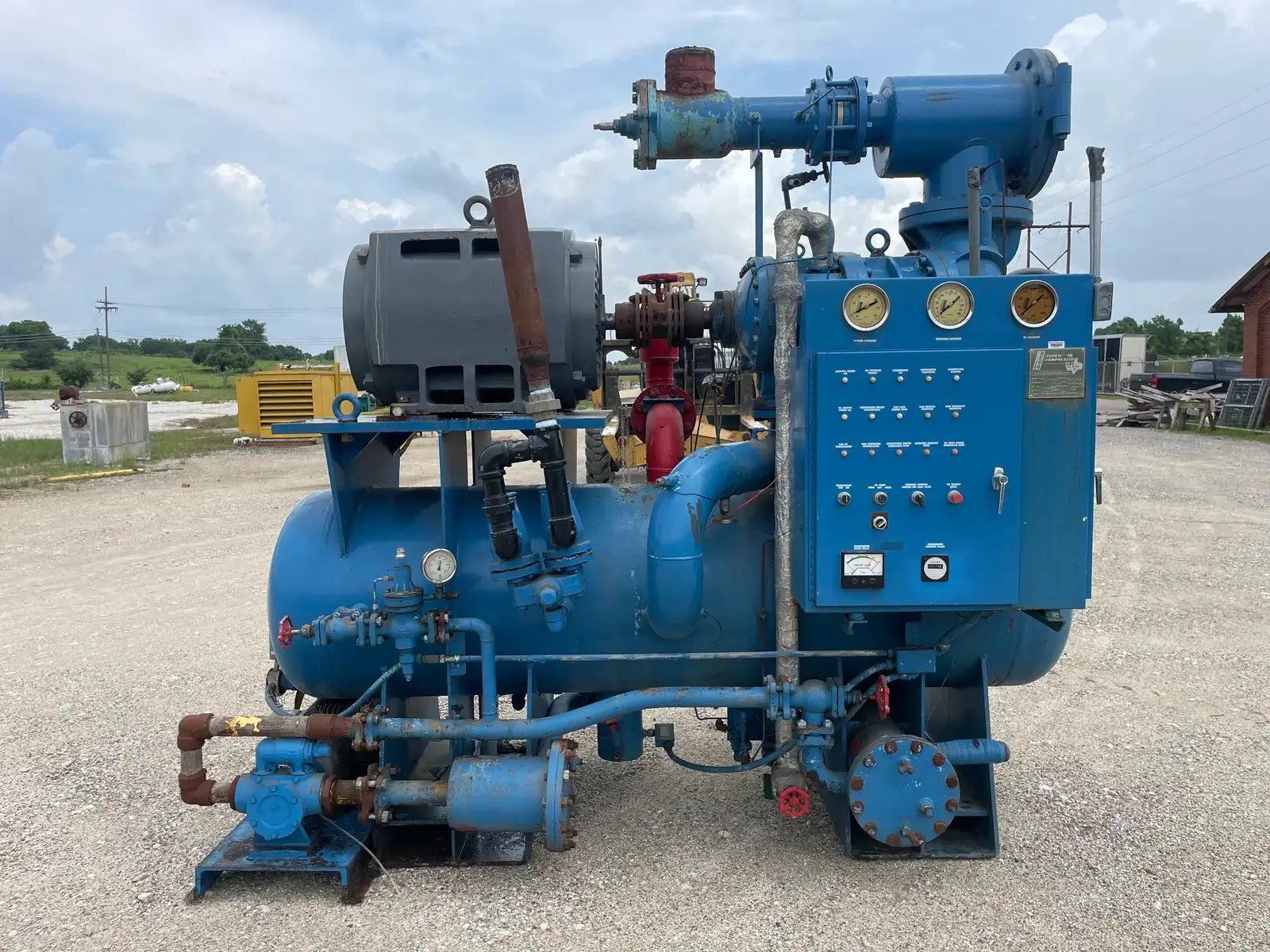 Paquete compresor de tornillo RECO. Modelo: 250SG-MX-3.6. Número de serie: S-1215-2. Refrigerante: Amoníaco. Tipo: Hi-Stage. PSIG máx.: 250. Fecha de fabricación: 1977. Caballos de fuerza: 450. Voltaje: 460. Hz: 60, Ph: 3. Compresor de tornillo desnudo rotativo Mycom. Modelo: 250-SG-MX. Número de serie: 2552059. RPM del compresor: 3600. Refrigerante: Amoníaco. Presión de diseño: 250 PSIG. Año de construcción: 1977. Separador de aceite RECO: Junta Nacional No: 2521. MDMT: 250 PSI @ 650 F. No. de serie Mfg: S12151. Año de construcción: 1976. Carcasa: .375. Cabeza: .375.
