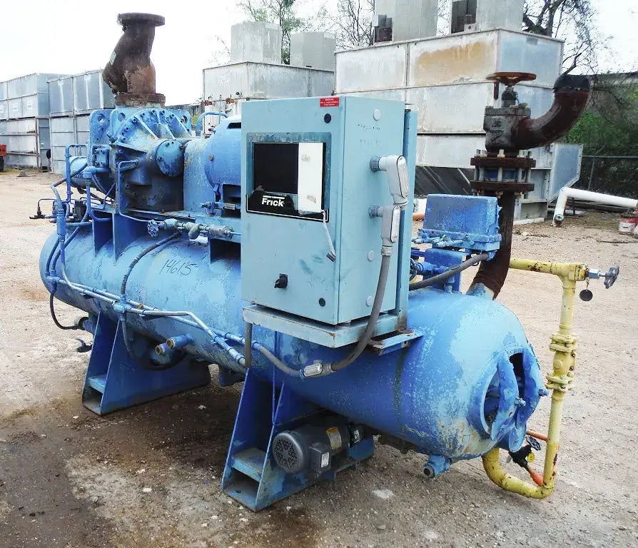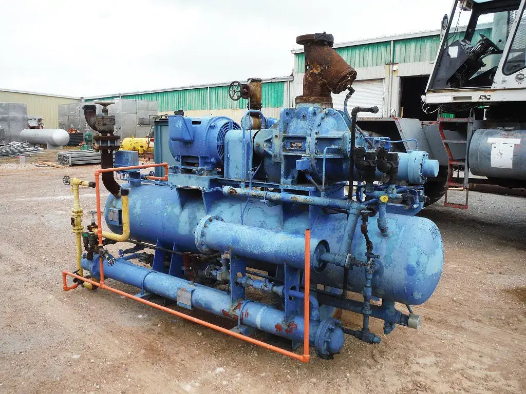 Paquete Reco / Frick RWB-100 sin compresor. El compresor desnudo ha sido desmontado y vendido; sin embargo, el resto del paquete aún está disponible. Especificaciones anteriores del compresor: Modelo de compresor de tornillo rotativo Frick: GDSH193S0055P, NH3 / R22, 4500 RPM máx., Vi: 2,5-5,0, 362 PSI máx. Utilizado anteriormente con refrigerante de amoníaco. Las piezas que aún están presentes incluyen el separador de aceite, el enfriador de aceite, la bomba de aceite, el micropanel, el filtro de succión, etc. Separador de aceite RECO de 24 pulgadas, 250 PSIG a 300 F, MDMT: -20 F a 350 PSIG. Prueba: 375 PSIG. Enfriador de aceite RECO: S/N: M903210 G, carcasa MAWP: 350 PSI a -20 F/300 F, tubos 250 PSI a -20 F/300 F, bomba de aceite Blackmer. Motor Toshiba de alta eficiencia: 100 HP, 230/460 V, 23/115 amperios, 3530 RPM, 60 Hz, trifásico. Controlador por microprocesador Frick. *Manual en PDF disponible. Dimensiones totales: 141 pulgadas de largo x 58 pulgadas de ancho x 93 pulgadas de alto.