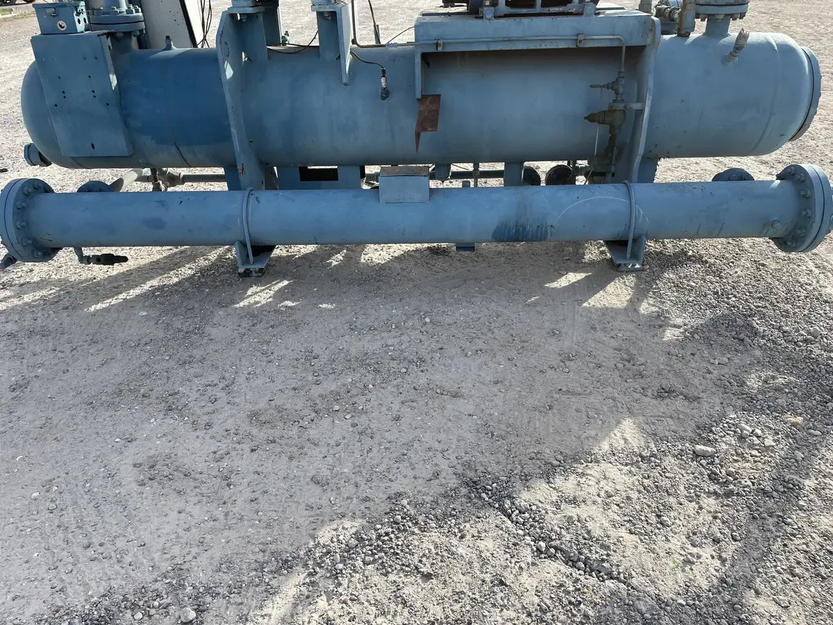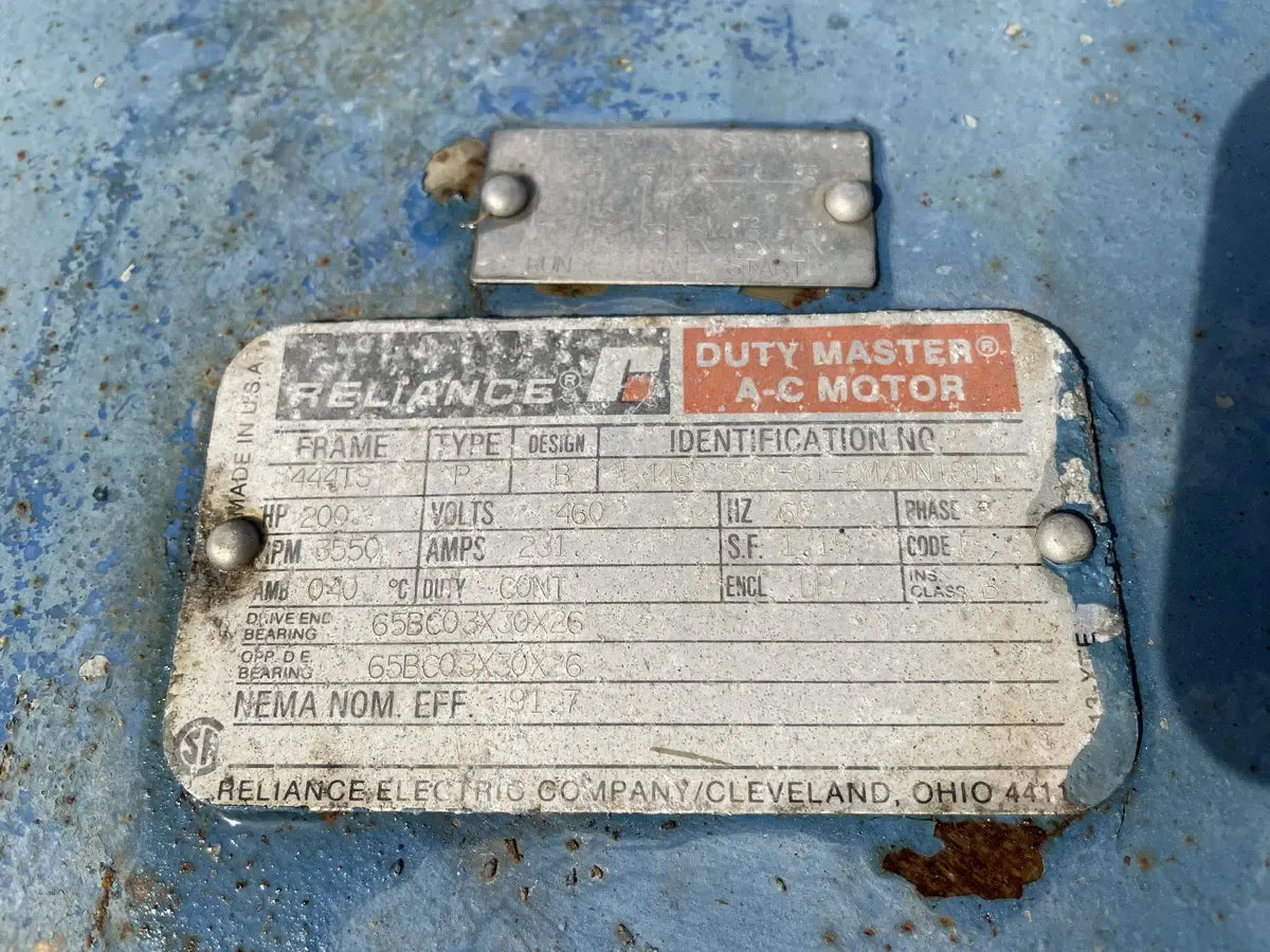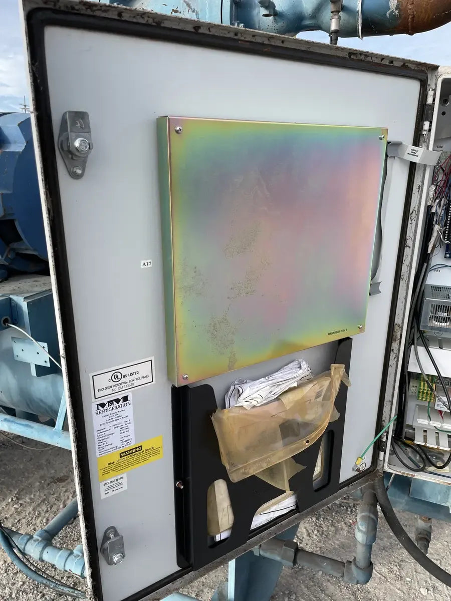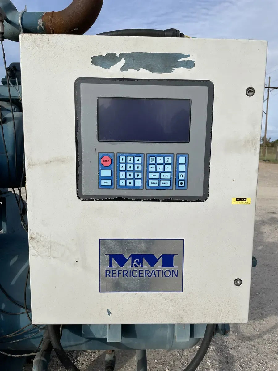 Compresor de tornillo semiherm simple serie Vilter VS. Número de serie: 1440R, Número de pedido: K53881, Presión de prueba del compresor (PSIG): 450, Número de modelo del compresor: VSS451 A025224BPAAAR. Peso del paquete unitario estándar: 4000. Los desplazamientos oscilan entre 778 y 2020 CFM. Falta placa de datos del paquete. Motor eléctrico Reliance: Estructura: 444TS, Tipo: P, Diseño: B, HP: 200, Voltios: 460, Hz: 60, Fase: 3, RPM: 3550, AMPS: 231, Servicio: Cont, Clase Ins: B, Tracción Cojinete de extremo: 65BC03X30x26, Cojinete OPP: 65BC03X30X26, NEMA NOM Eff: 91.7, Número de identificación: P44G0352D-01-OM/MN1811. Separador de aceite Vilter: Junta Nacional No: 38399, Máx. Prensa de trabajo permitida: 300 PSIG a 400 F, mín. Temperatura del metal de diseño: -20 F a 400 PSI, año de construcción: 1992, número de serie: A27606B. Enfriador de aceite Vilter: Junta Nacional No: 33410, lado de la carcasa: 400 PSIG a 400 F, -20 F a 400 PSI, lado del tubo: presión de trabajo máxima permitida: 300 PSIG a 400 F, temperatura mínima del metal de diseño: -20 a 300 PSI , Año de construcción 1992 Panel de control de modernización de refrigeración de M&M: Modelo: M100199G2, Número de esquema: M201450, Número de serie: 1440101, Voltaje de control: 120 VCA, Frecuencia: 50/60 Hz, Fases: 1, FLA máx.: 51 AMPS, Clasificación del motor: N/A, SCCR: 5KA@240V, Clasificación de carcasa: UL tipo 1.