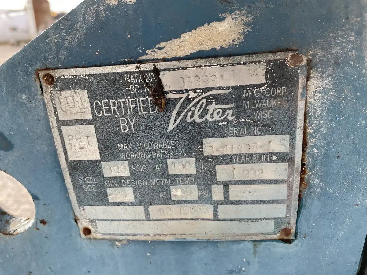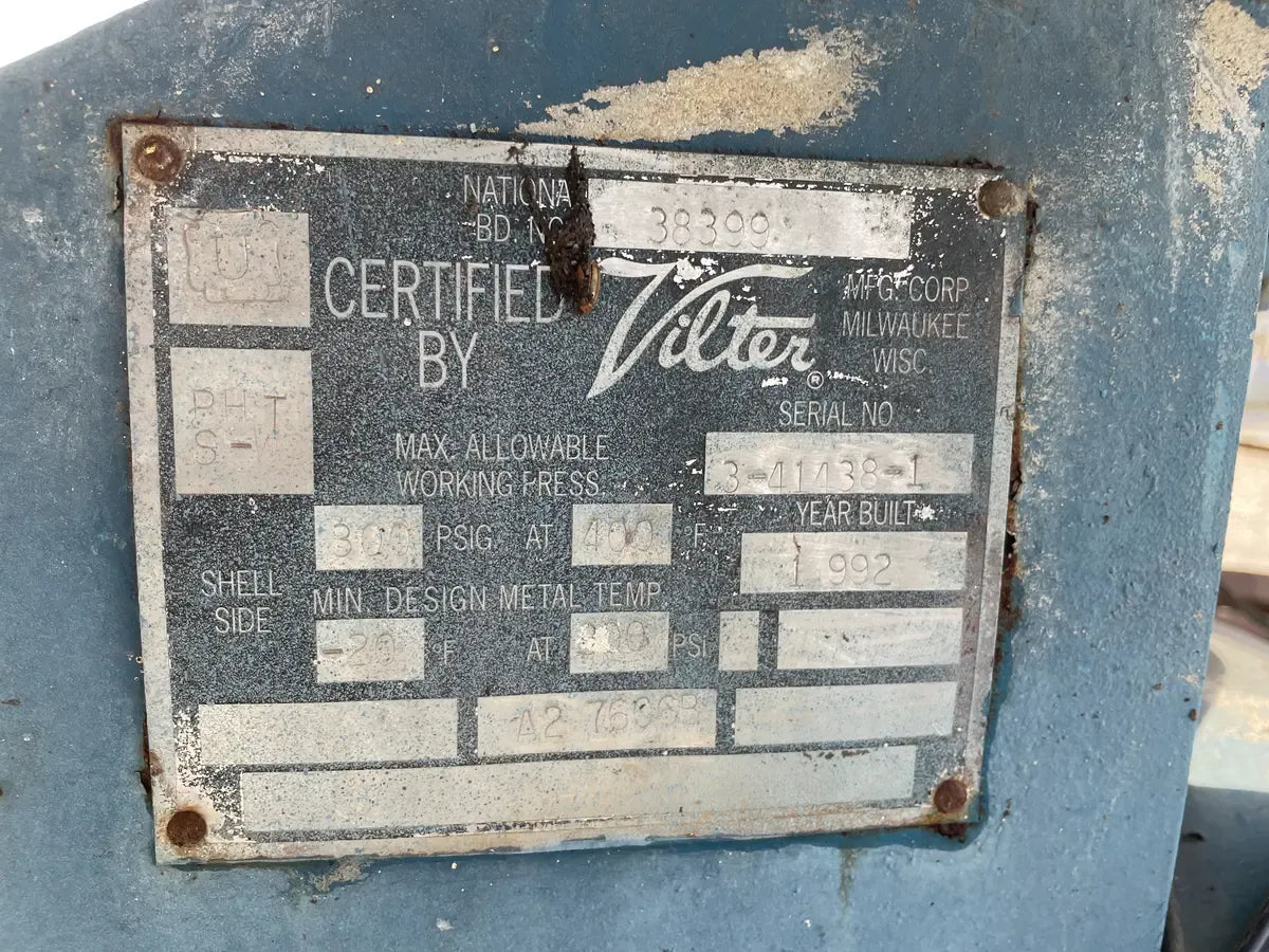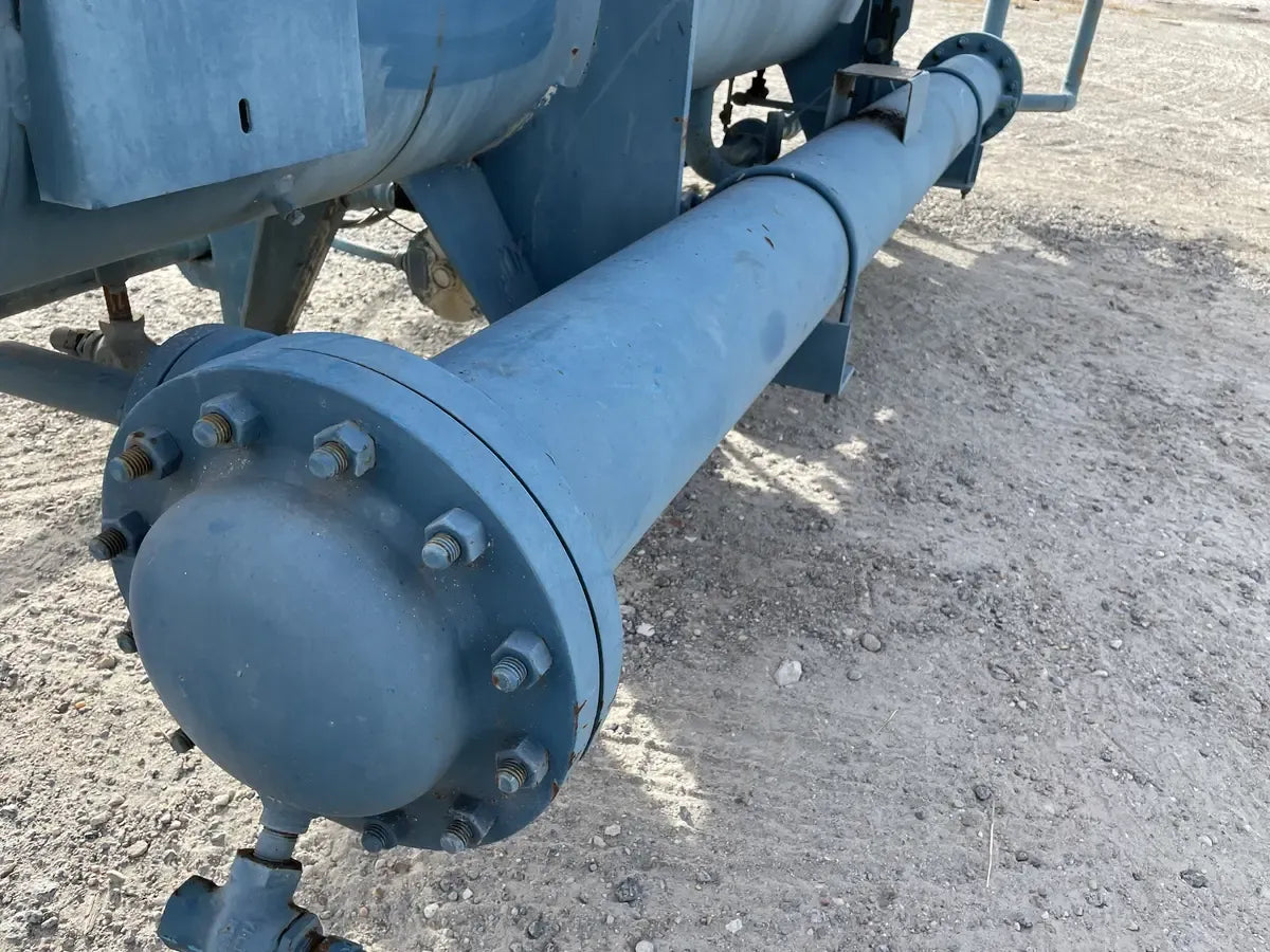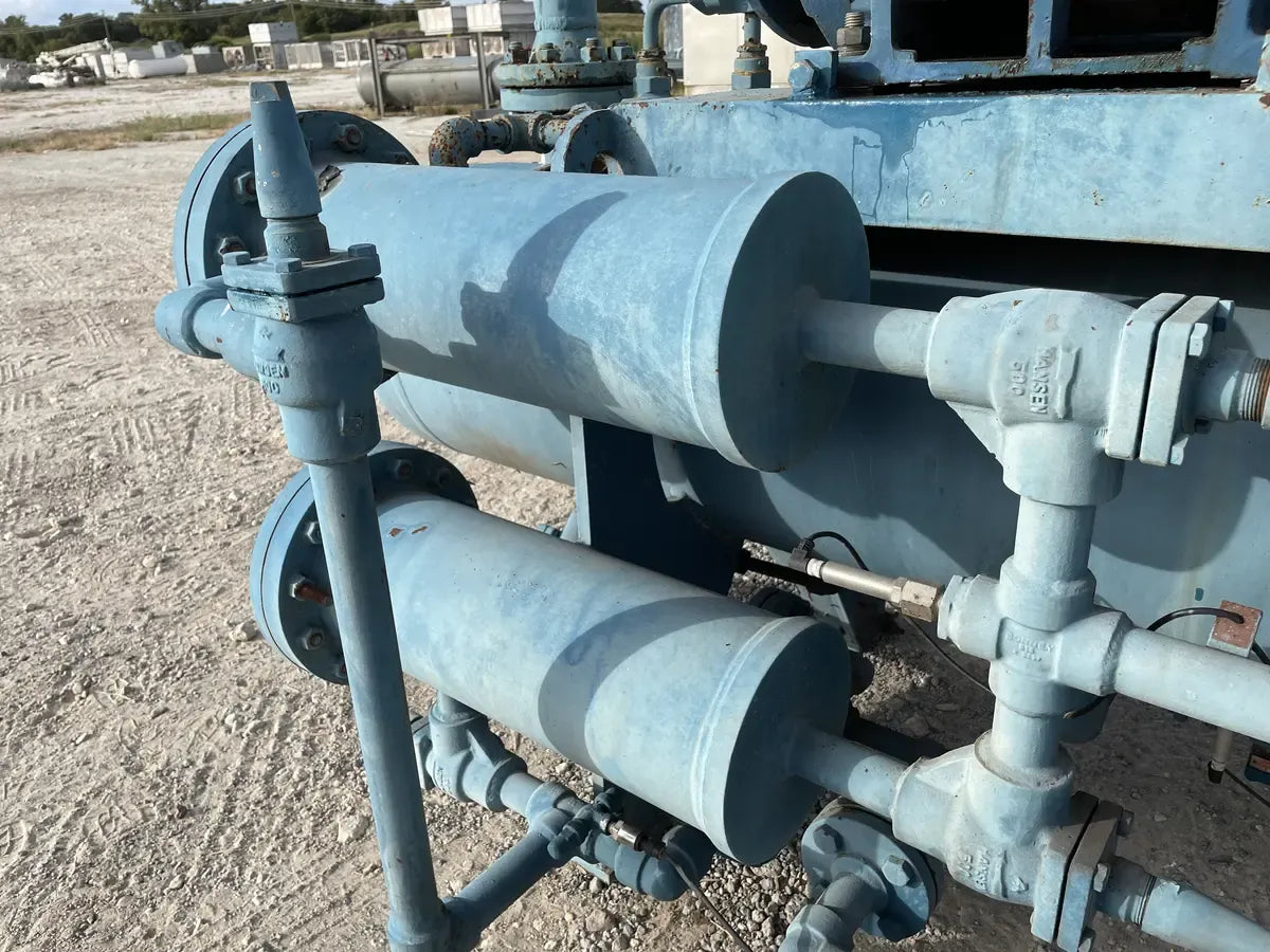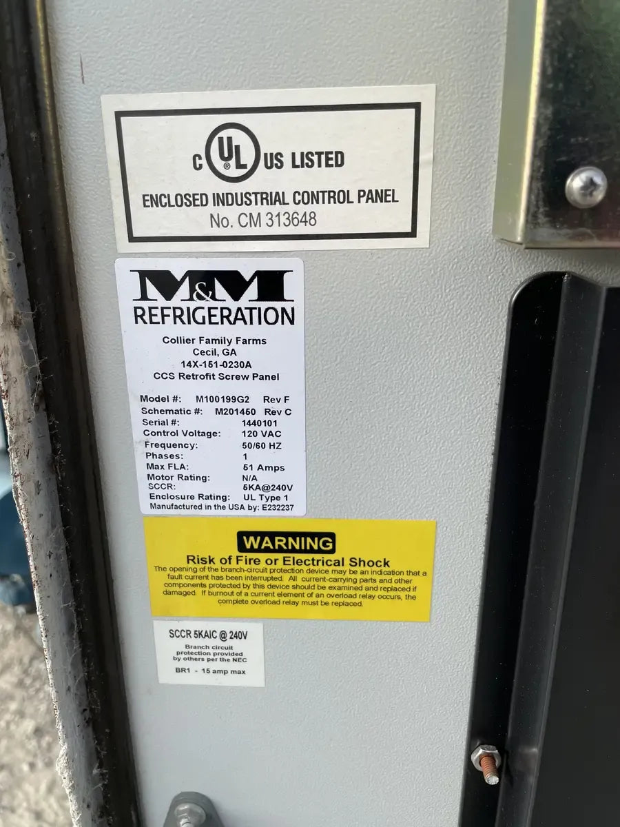 Compresor de tornillo semiherm simple serie Vilter VS. Número de serie: 1440R, Número de pedido: K53881, Presión de prueba del compresor (PSIG): 450, Número de modelo del compresor: VSS451 A025224BPAAAR. Peso del paquete unitario estándar: 4000. Los desplazamientos oscilan entre 778 y 2020 CFM. Falta placa de datos del paquete. Motor eléctrico Reliance: Estructura: 444TS, Tipo: P, Diseño: B, HP: 200, Voltios: 460, Hz: 60, Fase: 3, RPM: 3550, AMPS: 231, Servicio: Cont, Clase Ins: B, Tracción Cojinete de extremo: 65BC03X30x26, Cojinete OPP: 65BC03X30X26, NEMA NOM Eff: 91.7, Número de identificación: P44G0352D-01-OM/MN1811. Separador de aceite Vilter: Junta Nacional No: 38399, Máx. Prensa de trabajo permitida: 300 PSIG a 400 F, mín. Temperatura del metal de diseño: -20 F a 400 PSI, año de construcción: 1992, número de serie: A27606B. Enfriador de aceite Vilter: Junta Nacional No: 33410, lado de la carcasa: 400 PSIG a 400 F, -20 F a 400 PSI, lado del tubo: presión de trabajo máxima permitida: 300 PSIG a 400 F, temperatura mínima del metal de diseño: -20 a 300 PSI , Año de construcción 1992 Panel de control de modernización de refrigeración de M&M: Modelo: M100199G2, Número de esquema: M201450, Número de serie: 1440101, Voltaje de control: 120 VCA, Frecuencia: 50/60 Hz, Fases: 1, FLA máx.: 51 AMPS, Clasificación del motor: N/A, SCCR: 5KA@240V, Clasificación de carcasa: UL tipo 1.