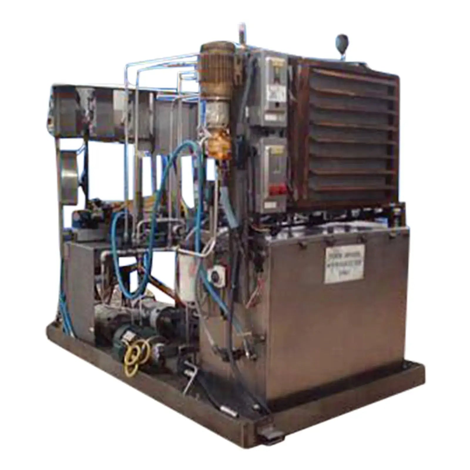 Paquete de energía hidráulica de acero inoxidable. Sólo aceite hidráulico de calidad alimentaria. Tanque de depósito de acero inoxidable: 170 galones. Dimensiones interiores de pared recta: 3 pies 10 pulgadas de largo x 2 pies de ancho x 3 pies de alto. Bomba hidráulica con engranajes de aceite, modelo: PVWH34LSAYCNNN, S/N: 94167190. Motor eléctrico Baldor, 20 hp, 1760 rpm, 208 -230/460 V, 54-50/25 amperios, 60 Hz, trifásico. Bomba hidráulica de engranajes de aceite, modelo: PVWH15LSAYCNNN, S/N: 98339105. Motor eléctrico Baldor, 10 hp, 1760 rpm, 208-230/460 V, 28,5-28,4/14,2 amperios, 60 Hz, trifásico. Bomba hidráulica de engranajes de aceite, modelo: PVWH15LSAYCNNN, S/N: 92121290. Motor eléctrico Baldor, 10 hp, 1760 rpm, 208-230/460 V, 28,5-28,4/14,2 amperios, 60 Hz, trifásico. Bomba hidráulica de engranajes de aceite, modelo: PVWH10LSAYCNNN, S/N: 19373416. Motor eléctrico Reliance, 5 hp, 1750 rpm, 230/460 V, 12,2/6,1 amperios, 60 Hz, trifásico. Enfriador de aceite industrial Americal, modelo: AC-35-3, S/N: 34520A, temperatura: 400 °F, presión: 300 psi. Válvulas direccionales Vickers. Números de modelo: 879135DG4S4012CB60, 02120015DG4S4W012CB60, DG4V3S2CMFWB560, KFDG4V32C28SMV1H620, DG4V3S2CMFWB560, KFDG4V32C285ZMV1H620. Dimensiones totales: 8 pies 7 pulgadas de largo x 5 pies 3 pulgadas de ancho x 7 pies 5 pulgadas de alto.