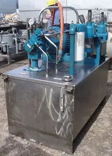 Paquete de energía hidráulica de acero inoxidable. Sólo aceite hidráulico de calidad alimentaria. Tanque de depósito de acero inoxidable: 90 galones. Dimensiones interiores de pared recta: 4 pies de largo x 2 pies 6 pulgadas de ancho x 1 pie 8 pulgadas de alto. Bomba hidráulica Vickers con motor. Válvula de alivio de seguridad Vickers, modelo: 2520V0 14A8, S/N: 1CC20. Filtro Pall Industrial Hydraulics Corp. Dimensiones totales: 4 pies 4 pulgadas de largo x 2 pies 11 pulgadas de ancho x 4 pies 4-1/2 pulgadas de alto.
