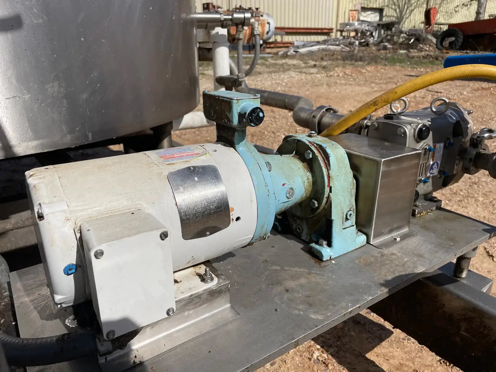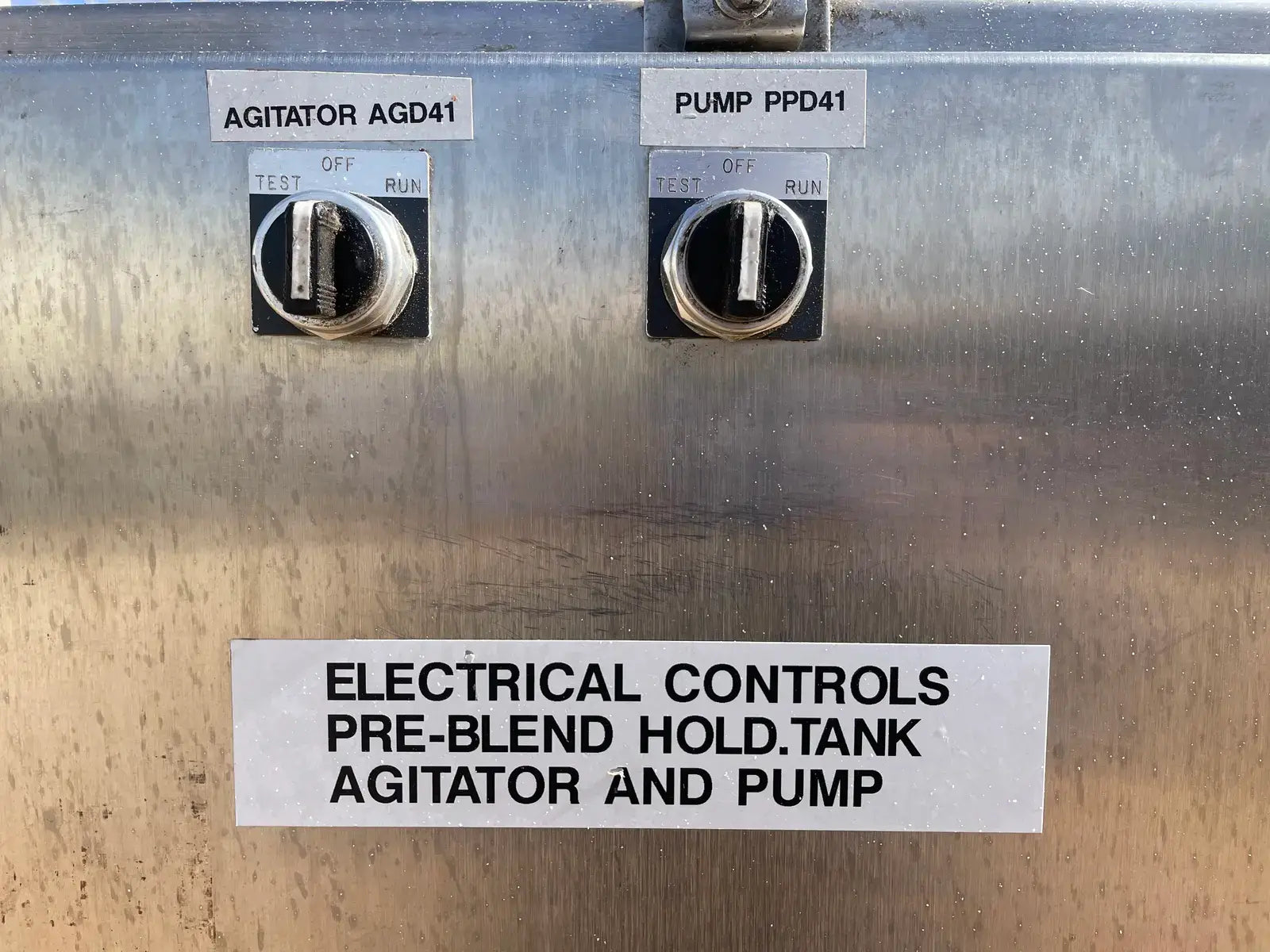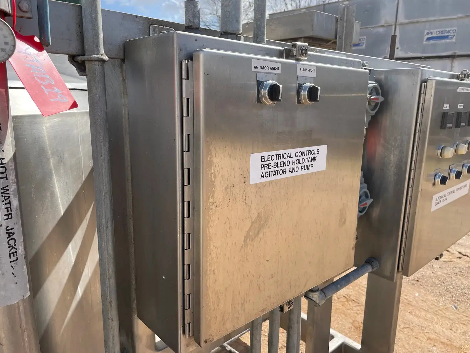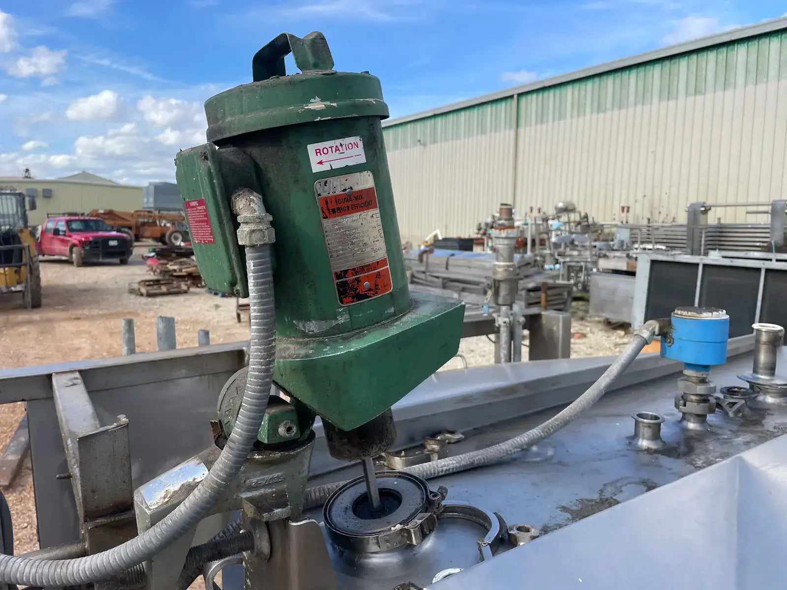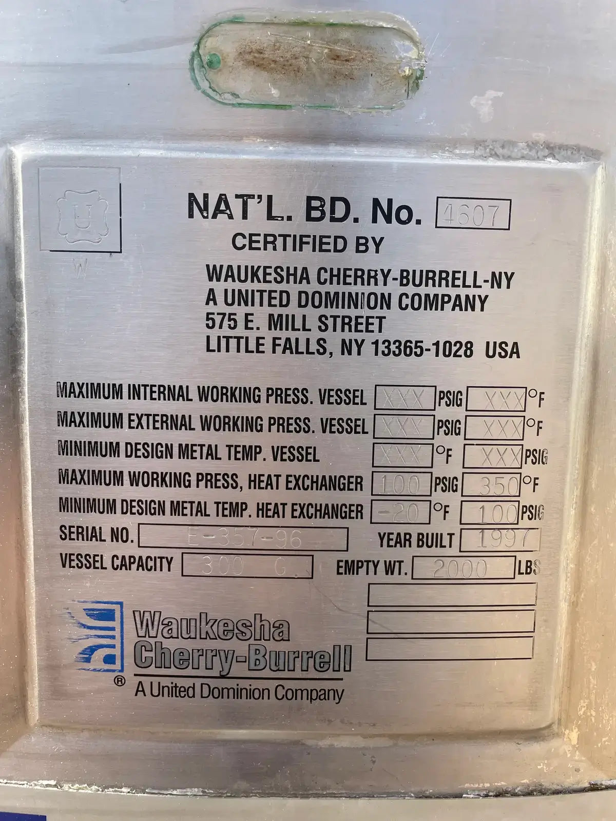 Paquete de tanque de mezcla agitado Waukesha Cherry-Burrell con dos agitadores, arrancadores de control y una bomba de desplazamiento positivo Waukesha. Certificado por Waukesha Cherry-Burrell. Recipiente: Junta Nacional No: 4607. Presión máxima de trabajo, intercambiador de calor: 100 PSIG @ 350 F. Temperatura mínima de diseño del metal, intercambiador de calor: -20 F @ 100 PSIG. Número de serie: E-357-96. Año de construcción: 1997. Capacidad de la embarcación: 300 GPM. Peso vacío: 3000 LBS. Bomba de desplazamiento positivo Waukesha: Modelo: 015 U1, Número de serie: 1000003231644.