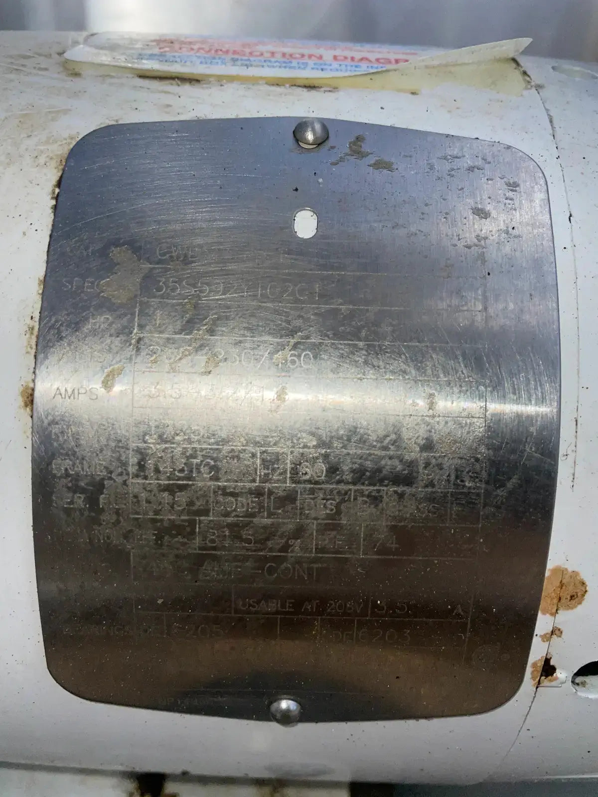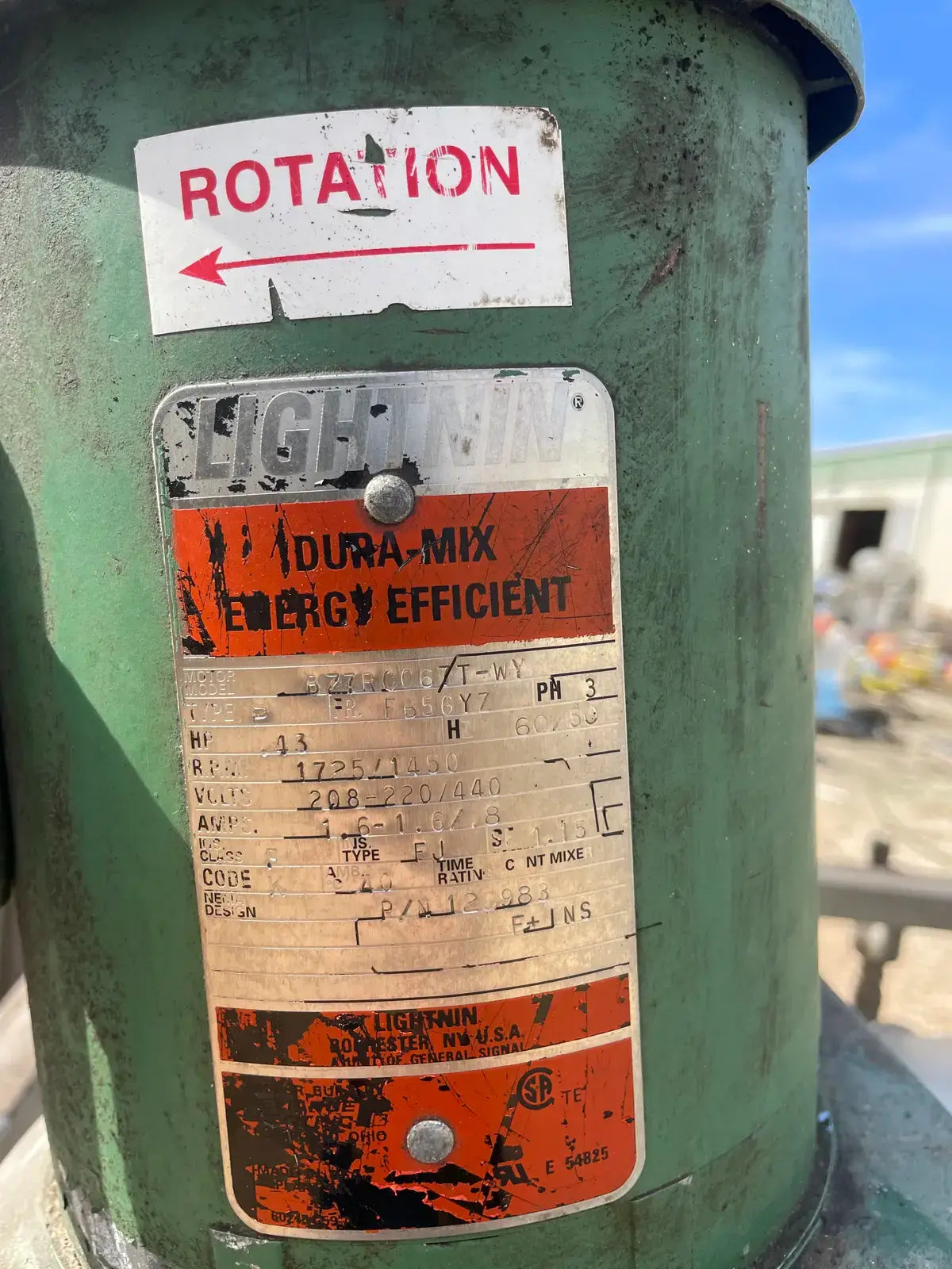 - Si hay varios motores, descripciones de motores frente a especificaciones: (1) Reliance Electric Lighten Agitator Motor: HP: 0.43, RPM: 1725/1450, Volts: 208-220/440. (1) Baldor Electric Motor for positive displacement pump: HP: 1, Volts: 203-230/460, 3.5-3.2, RPM: 1725, Hz: 60.