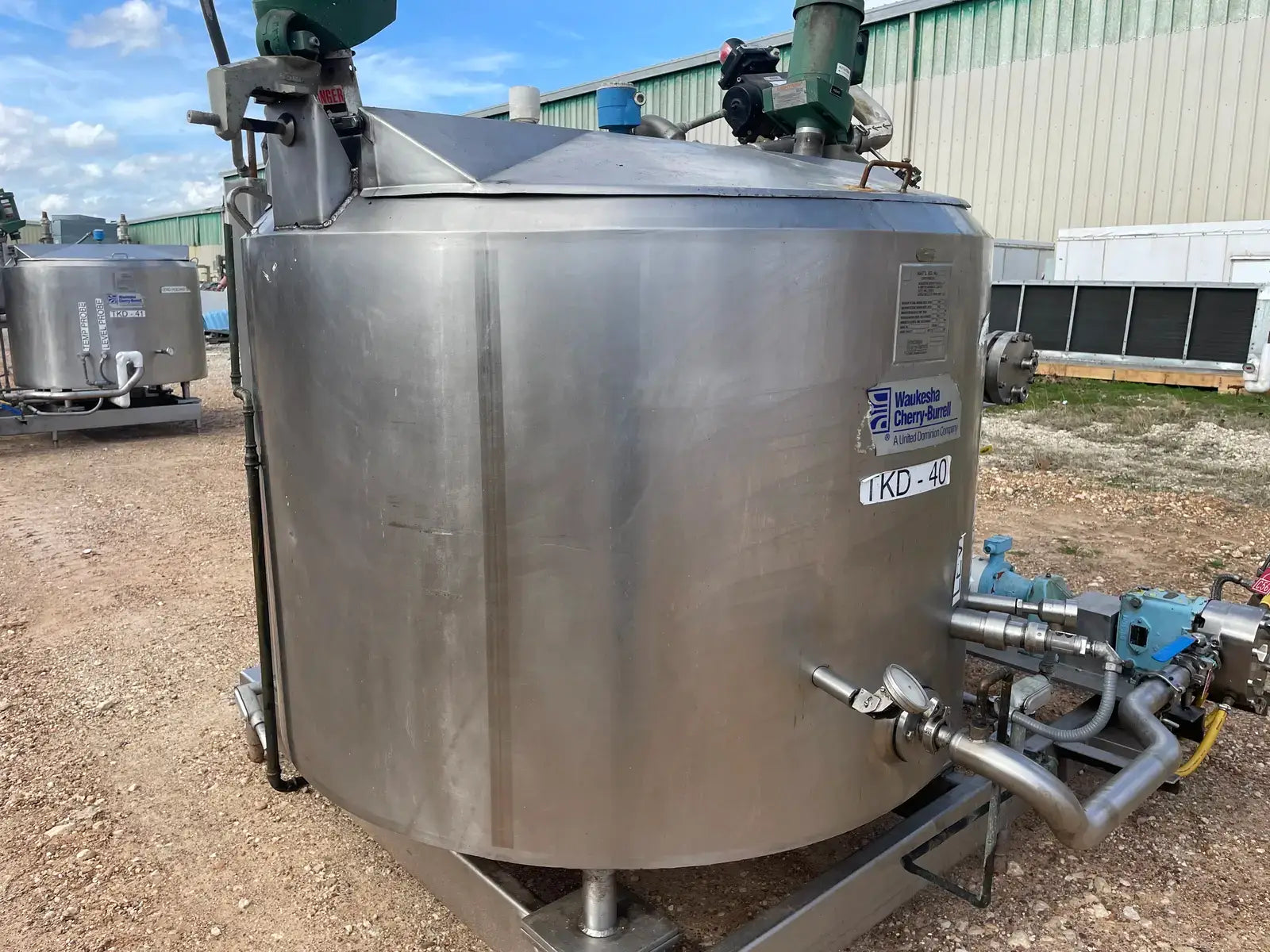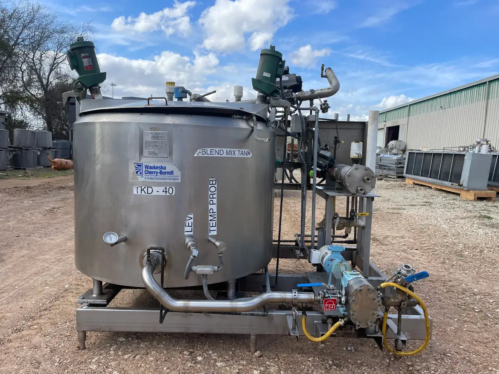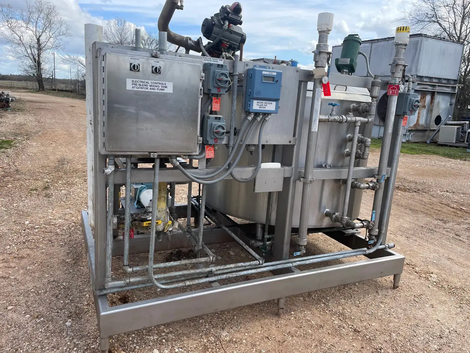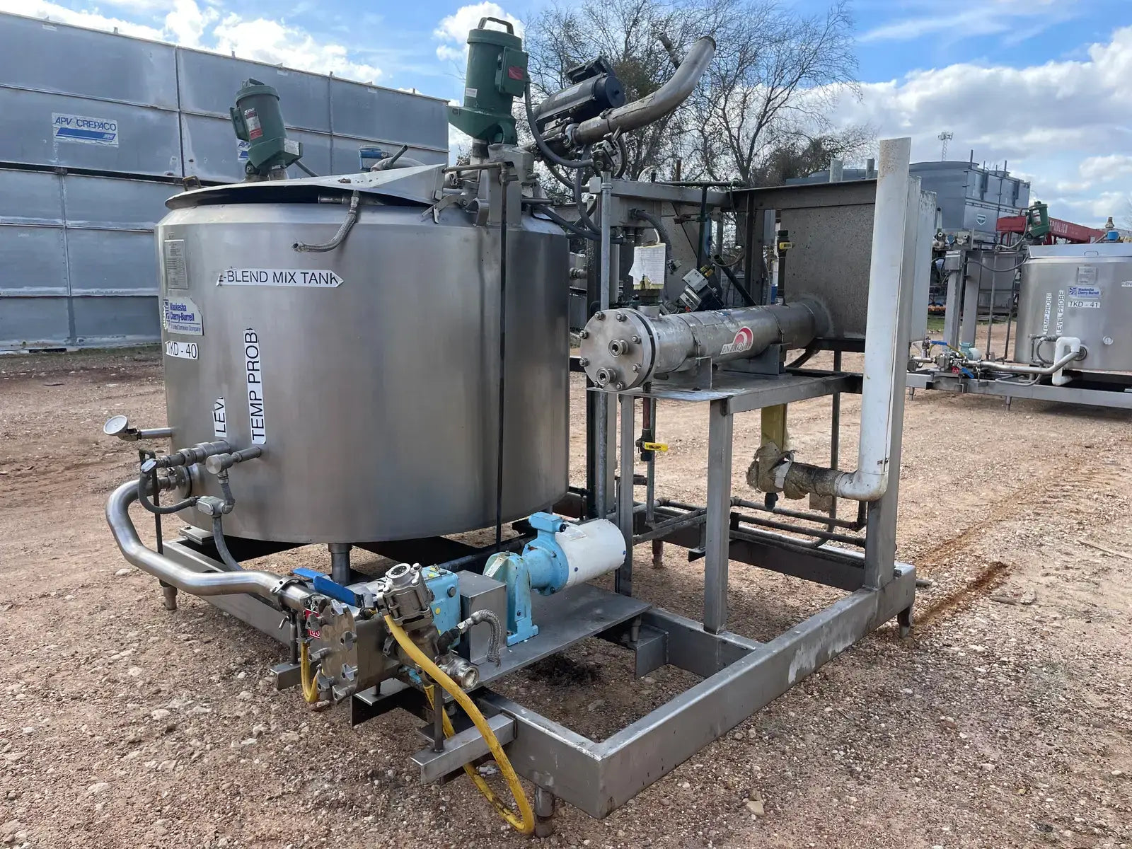 Paquete de tanque de mezcla agitado Waukesha Cherry-Burrell con dos agitadores, arrancadores de control y una bomba de desplazamiento positivo Waukesha. Certificado por Waukesha Cherry-Burrell. Recipiente: Junta Nacional No: 4606. Presión máxima de trabajo, intercambiador de calor: 100 PSIG a 350 F. Temperatura mínima de diseño del metal, intercambiador de calor: -20 F a 100 PSIG. Número de serie: E-356-96. Año de construcción: 1997. Capacidad de la embarcación: 300 GPM. Peso vacío: 3000 LBS. Waukesha 030 Desplazamiento Positivo 1-1/2 HP. Energía. Intercambiador de calor de carcasa y tubos sanitarios. Junta Nacional: 6181, Número de serie: 8042. Año de construcción: 2005. Presión máxima de trabajo: Lado de la carcasa: -20 F a 375 PSI, Lado del tubo: 150 PSIG a 375 F. Temperatura mínima de diseño del metal: Lado de la carcasa: -20 F @ 150 PSI, lado del tubo: -20 F a 150 PSI.