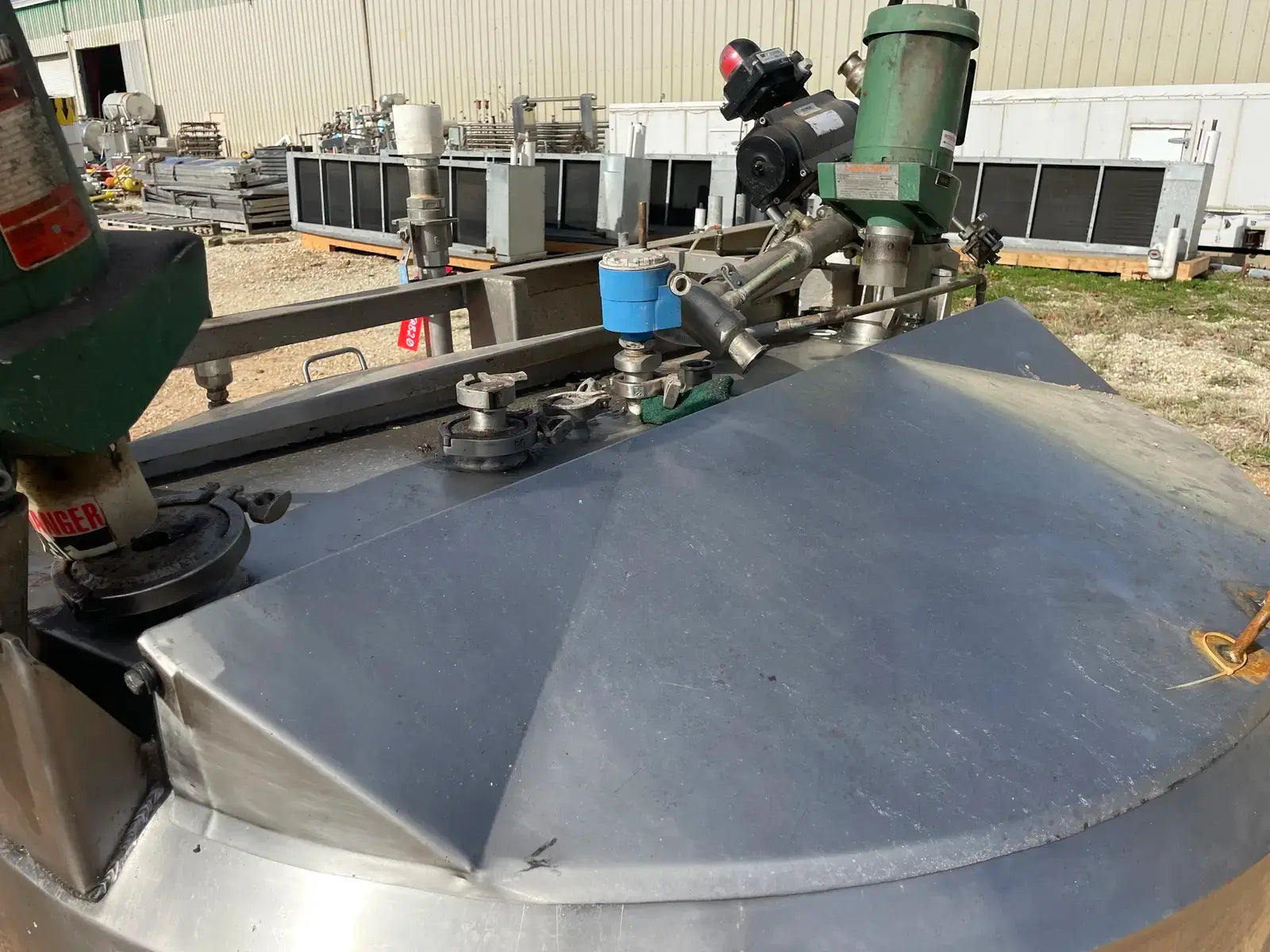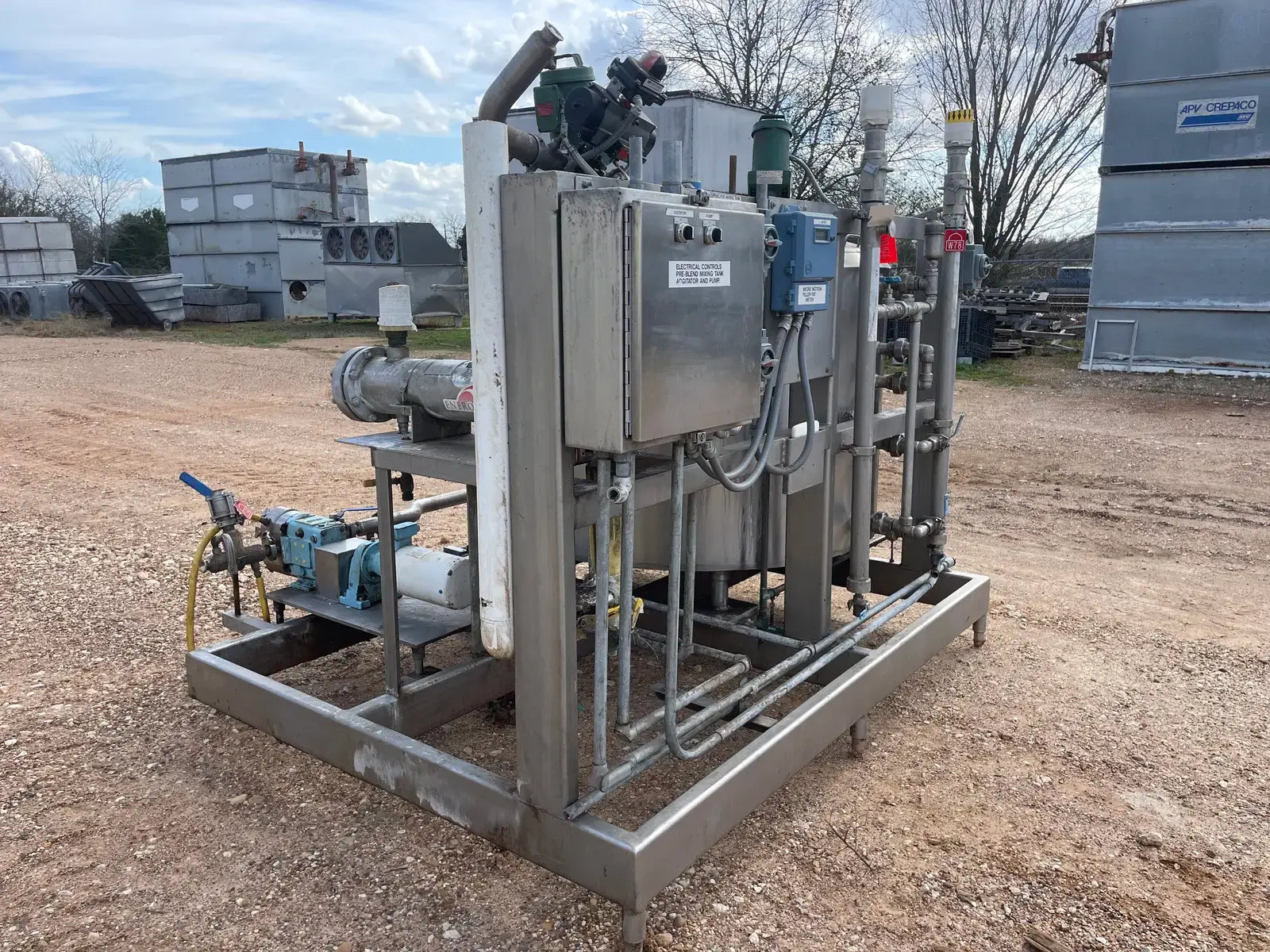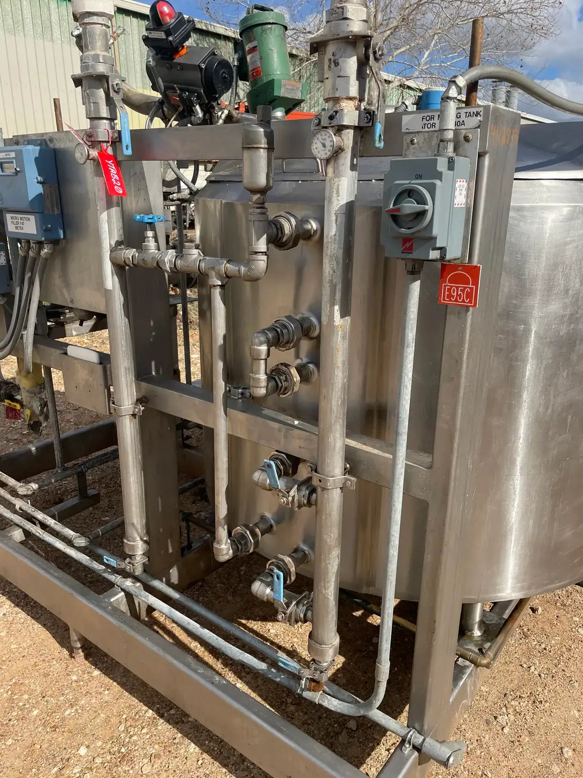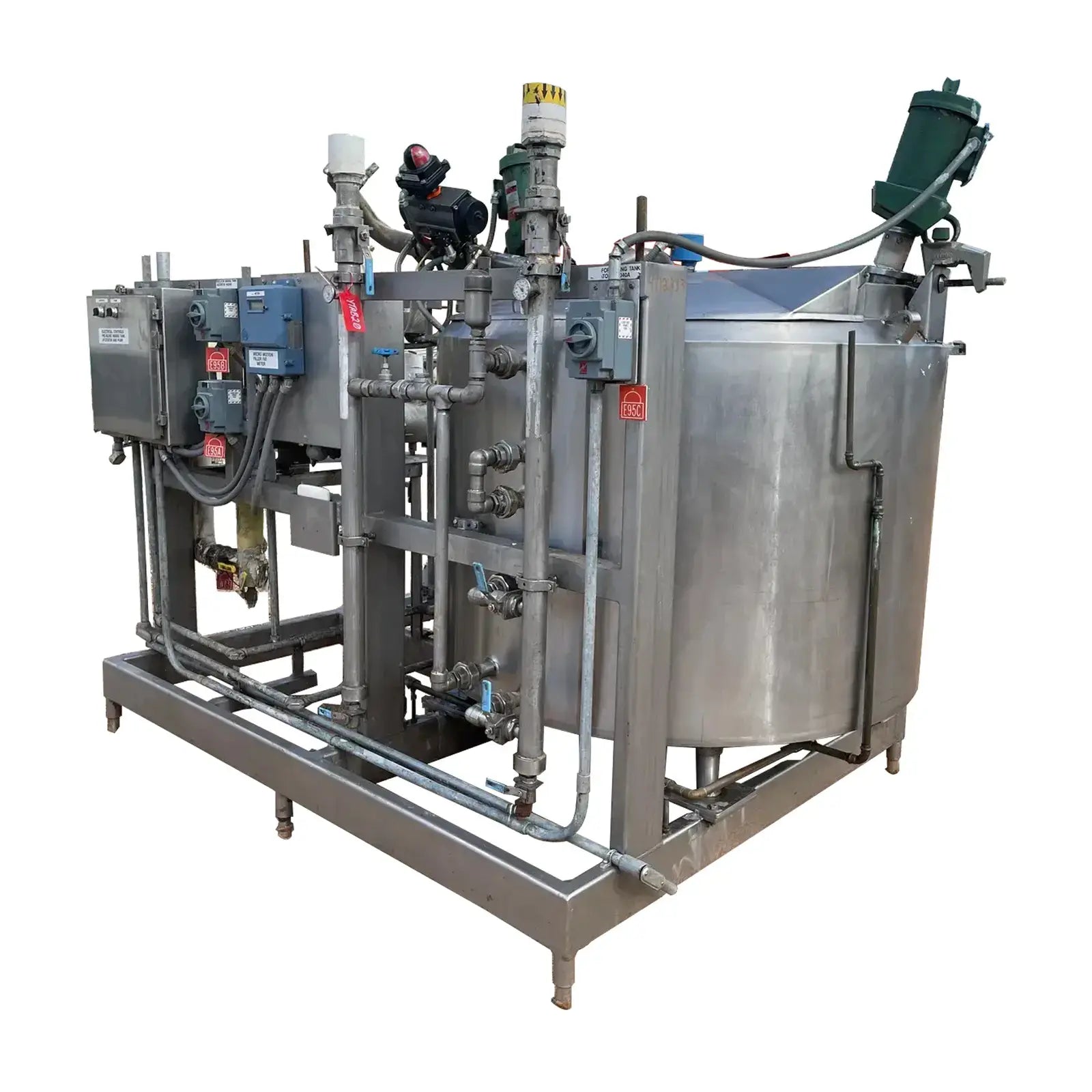 Paquete de tanque de mezcla agitado Waukesha Cherry-Burrell con dos agitadores, arrancadores de control y una bomba de desplazamiento positivo Waukesha. Certificado por Waukesha Cherry-Burrell. Recipiente: Junta Nacional No: 4606. Presión máxima de trabajo, intercambiador de calor: 100 PSIG a 350 F. Temperatura mínima de diseño del metal, intercambiador de calor: -20 F a 100 PSIG. Número de serie: E-356-96. Año de construcción: 1997. Capacidad de la embarcación: 300 GPM. Peso vacío: 3000 LBS. Waukesha 030 Desplazamiento Positivo 1-1/2 HP. Energía. Intercambiador de calor de carcasa y tubos sanitarios. Junta Nacional: 6181, Número de serie: 8042. Año de construcción: 2005. Presión máxima de trabajo: Lado de la carcasa: -20 F a 375 PSI, Lado del tubo: 150 PSIG a 375 F. Temperatura mínima de diseño del metal: Lado de la carcasa: -20 F @ 150 PSI, lado del tubo: -20 F a 150 PSI.