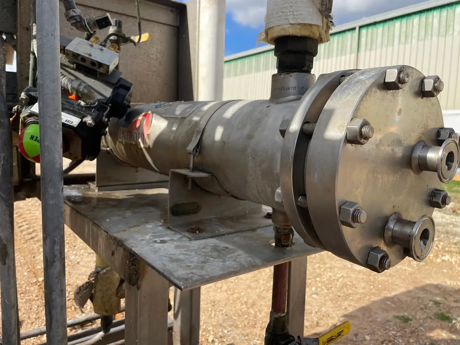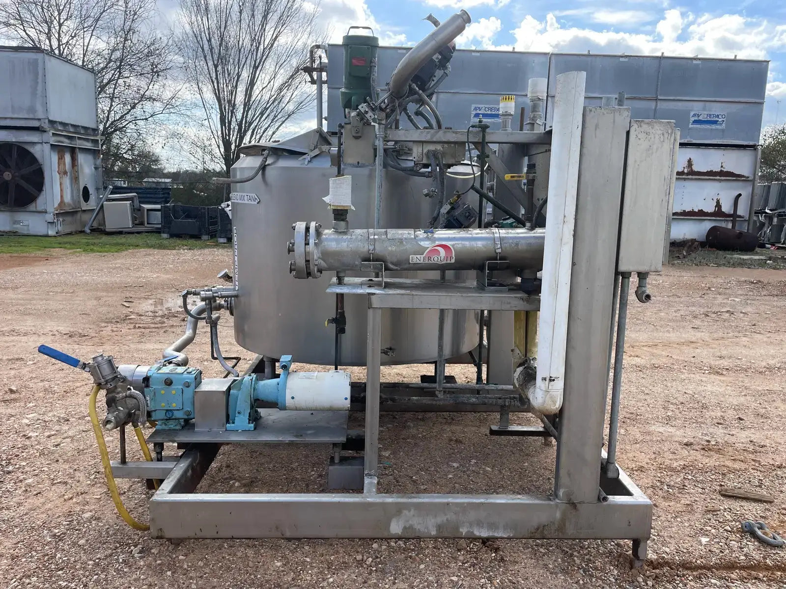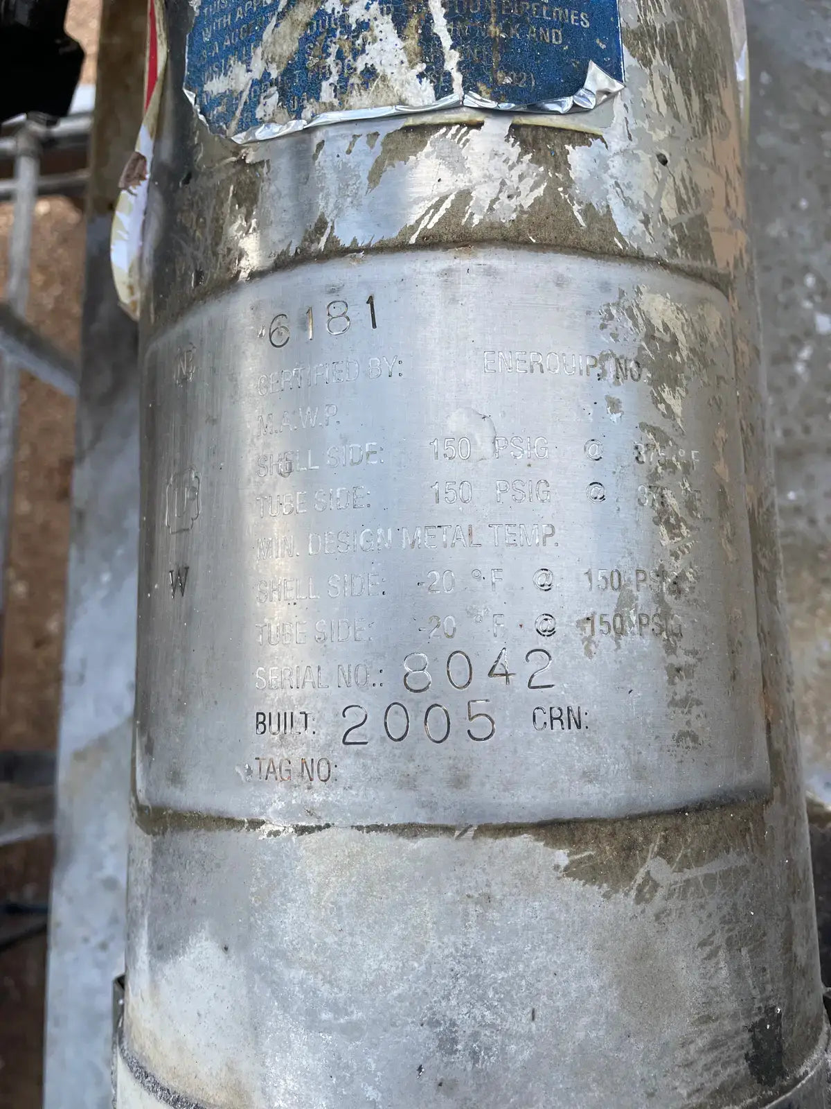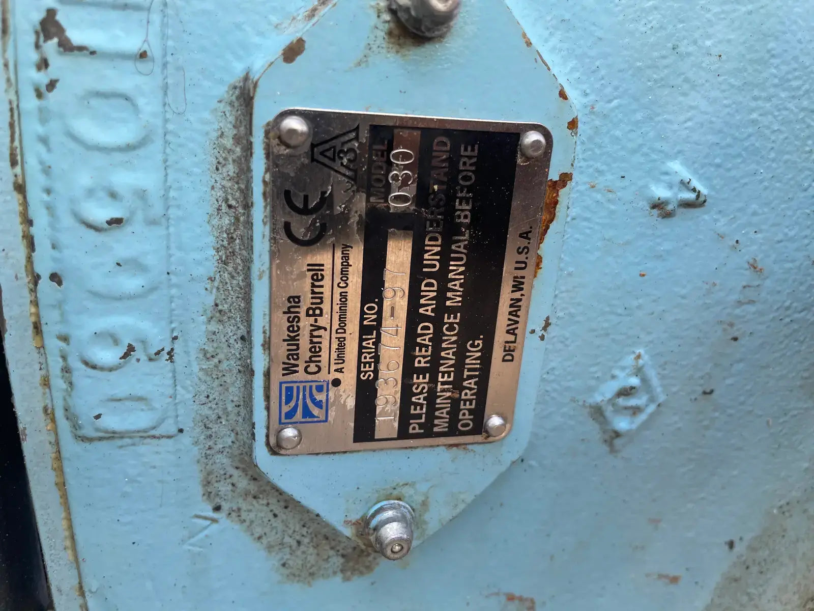 Paquete de tanque de mezcla agitado Waukesha Cherry-Burrell con dos agitadores, arrancadores de control y una bomba de desplazamiento positivo Waukesha. Certificado por Waukesha Cherry-Burrell. Recipiente: Junta Nacional No: 4606. Presión máxima de trabajo, intercambiador de calor: 100 PSIG a 350 F. Temperatura mínima de diseño del metal, intercambiador de calor: -20 F a 100 PSIG. Número de serie: E-356-96. Año de construcción: 1997. Capacidad de la embarcación: 300 GPM. Peso vacío: 3000 LBS. Waukesha 030 Desplazamiento Positivo 1-1/2 HP. Energía. Intercambiador de calor de carcasa y tubos sanitarios. Junta Nacional: 6181, Número de serie: 8042. Año de construcción: 2005. Presión máxima de trabajo: Lado de la carcasa: -20 F a 375 PSI, Lado del tubo: 150 PSIG a 375 F. Temperatura mínima de diseño del metal: Lado de la carcasa: -20 F @ 150 PSI, lado del tubo: -20 F a 150 PSI.