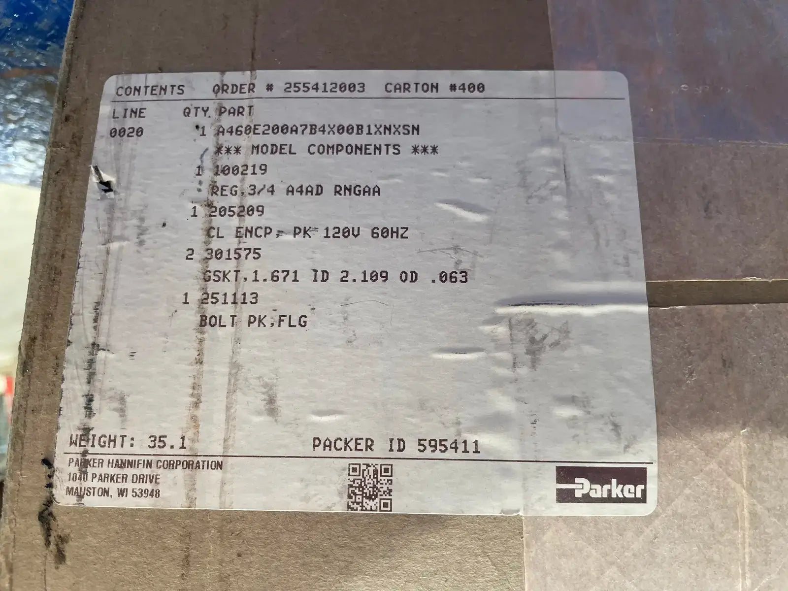 Regulador de presión de doble entrada Parker RS. Tipo: A4AD. Puerto: DN20 3/4 pulg. Bobina: 120/60.