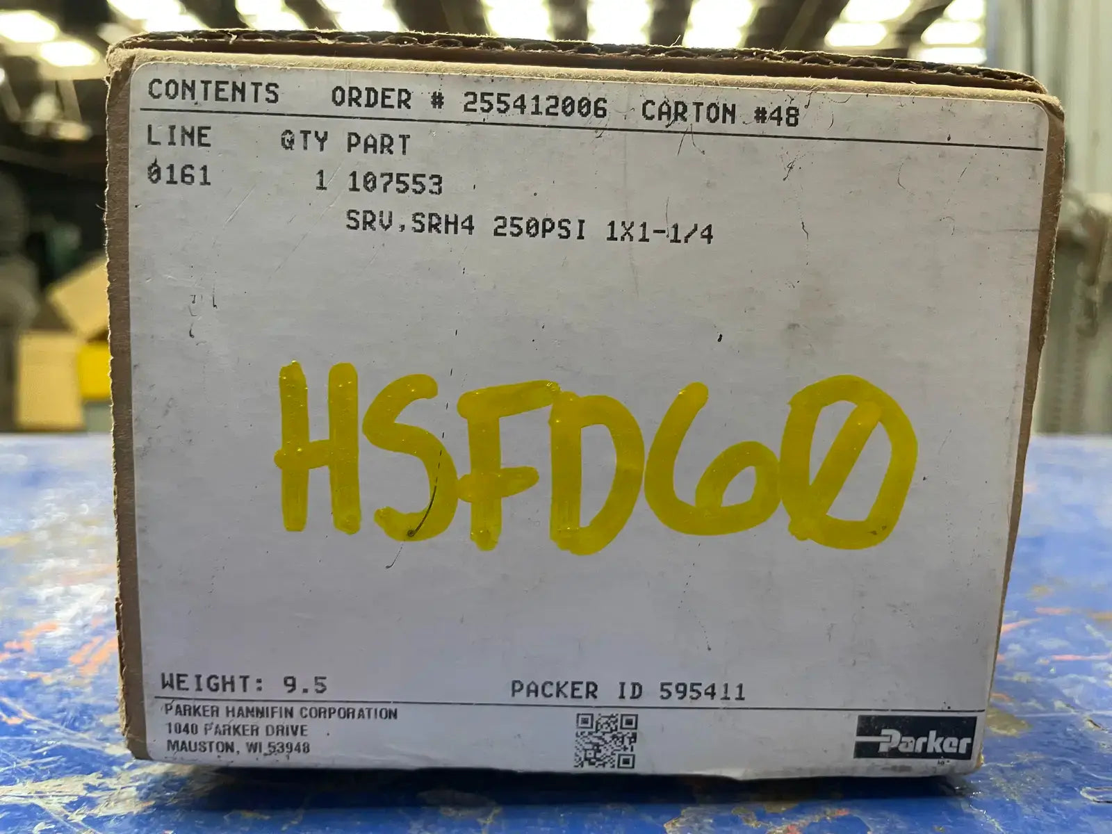 Válvula de seguridad Parker RS de alta capacidad. Tipo: SRV, SRH4. Conexión de entrada: 1 pulg. Conexión de salida: 1-1/4 pulg. Ajuste de alivio de presión: 250 PSI.