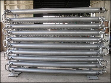 Pasteurizador de 14 bancos con carcasa y tubo de acero inoxidable Tetra Pak. (14) La carcasa y los tubos, cada uno de los cuales contiene 7 tubos más pequeños, miden: 9 pies 8 pulgadas de largo x 6 pulgadas de diámetro de la carcasa. cada uno con (7) 1-1/2 pulg. de diámetro. tubos interiores: 372 pies cuadrados combinados (5) Medida del tubo en los tubos: 9 pies 5 pulgadas de largo x 2-1/2 pulgadas de diámetro exterior del tubo, 1-1/4 pulgadas de diámetro. Tubos interiores: 30,82 pies cuadrados combinados. Entradas/salidas: (4) ACME de 3 pulgadas. (1) Línea S de 2-1/2 pulgadas. (1) Línea S de 1-1/2 pulg. (3) ¾ pulg. FNPT. (6) 1-1/4 pulg. de diámetro interior. CUMBRE. (1) 2-1/4 pulg. FNPT. (2) Brida interior de 1-3/8 pulg. de diámetro. con (4) orificios de montaje de 7/8 pulg. 3-1/4 pulgadas adyacentes, 4-1/2 pulgadas opuestas. El trabajo inicial de esta unidad era como parte de una línea de extracción de jugo/pulpa de cítricos que producía 20 gpm de jugo que tenía una concentración de pulpa de cítricos del 40 % con la sección de regeneración de producto a producto y la sección de calentamiento usando vapor directo. El producto salió a 40°F. Dimensiones totales: 11 pies 5 pulgadas de largo x 3 pies 6 pulgadas de ancho x 7 pies 3 pulgadas de alto (ACN1800).