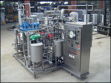 Patín APV Crepaco UHT Estéril (UHT). CTA120. Caudal aproximado: 120 gph. La unidad está diseñada para la esterilización de jugos y productos lácteos utilizando el proceso UHT y tiene capacidad CIP. La unidad incluye: paneles de control principal y CIP para bombas y controles de productos. El patín contiene: (1) homogeneizador APV. (1) Intercambiador de calor SA Armstrong Ltd., (2) Intercambiadores de calor SS. (12) Intercambiadores de calor verticales de acero inoxidable. (1) tanque desaireador de 13.7 galones, (2) tanques de equilibrio de acero inoxidable de 25 galones para (producto/agua), (4) bombas centrífugas APV Crepaco, (1) bomba de vacío SIHI con capacidad del tubo de retención de producto: 0.4 galones. Dimensiones totales: 13 pies 4 pulgadas de largo x 7 pies 5 pulgadas de ancho x 9 pies 8 pulgadas de alto.